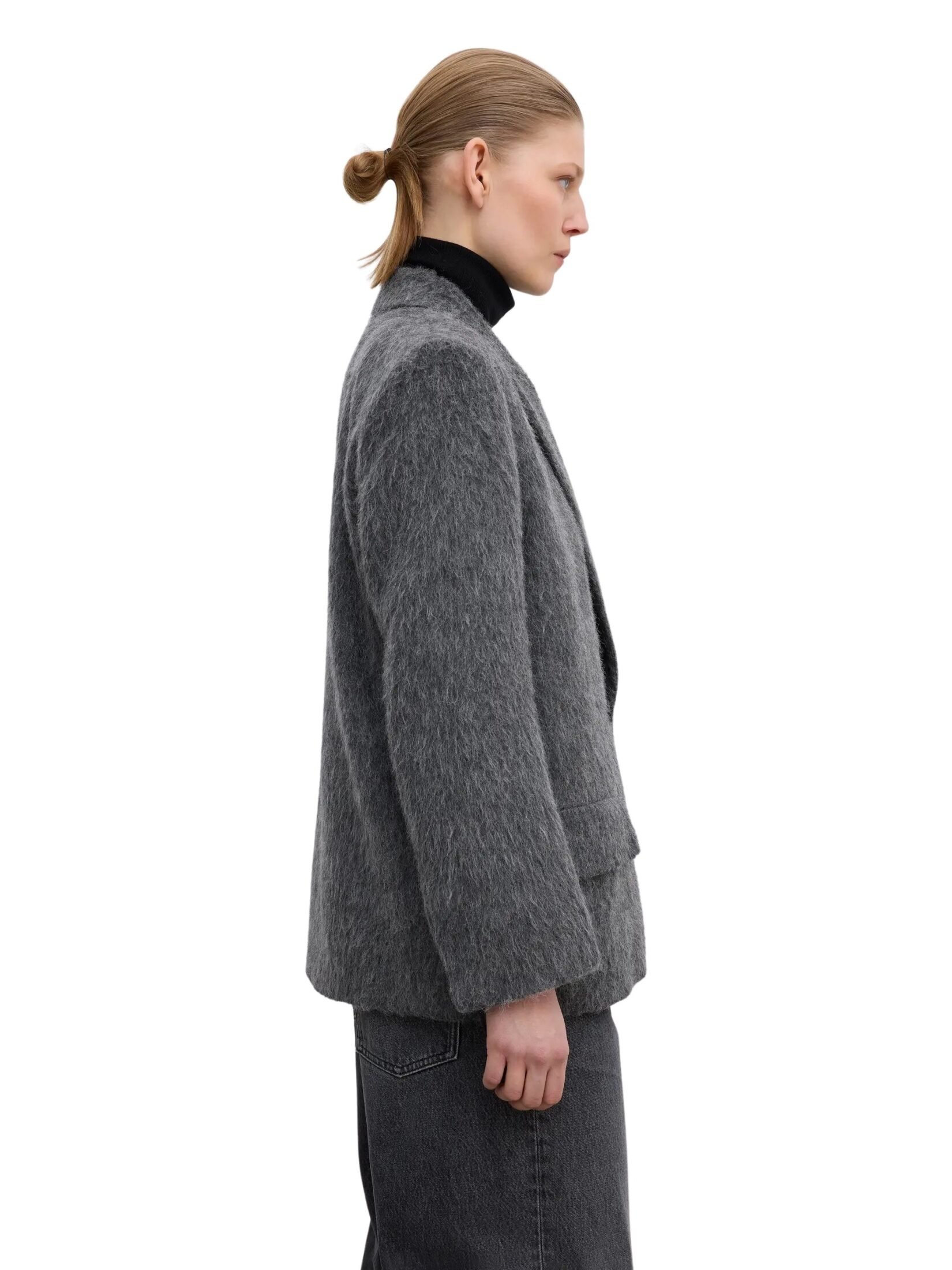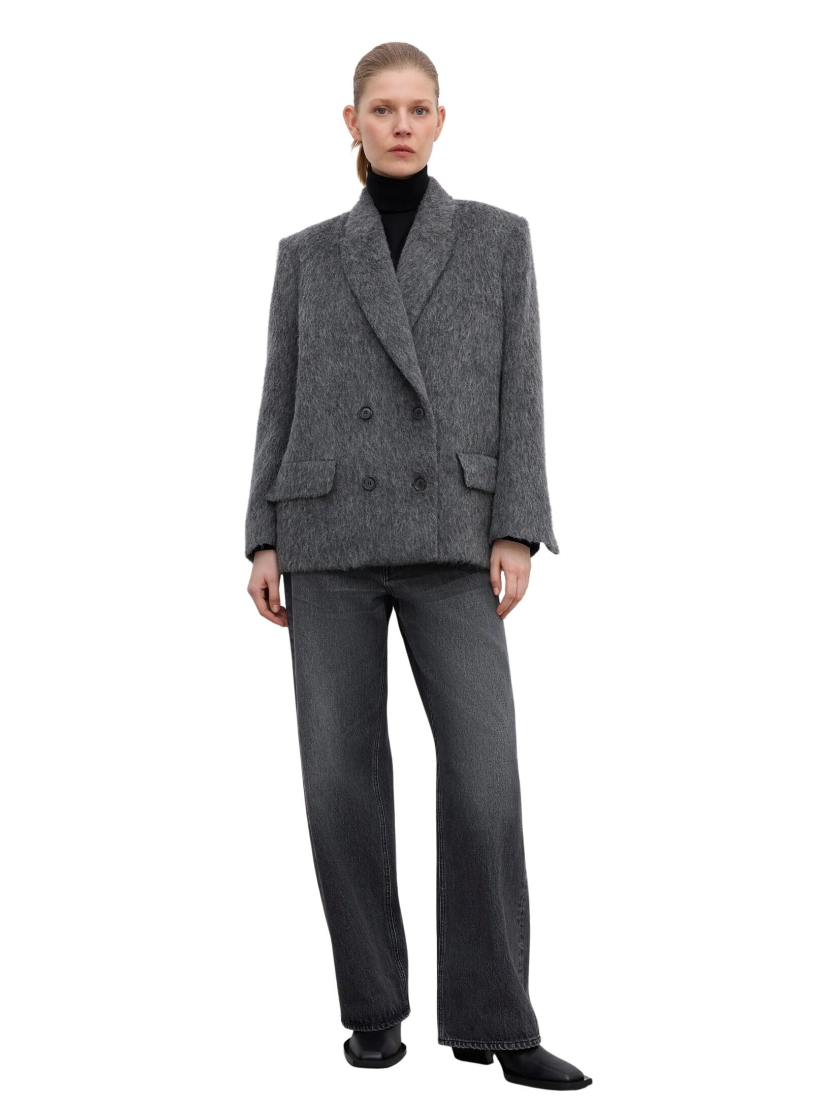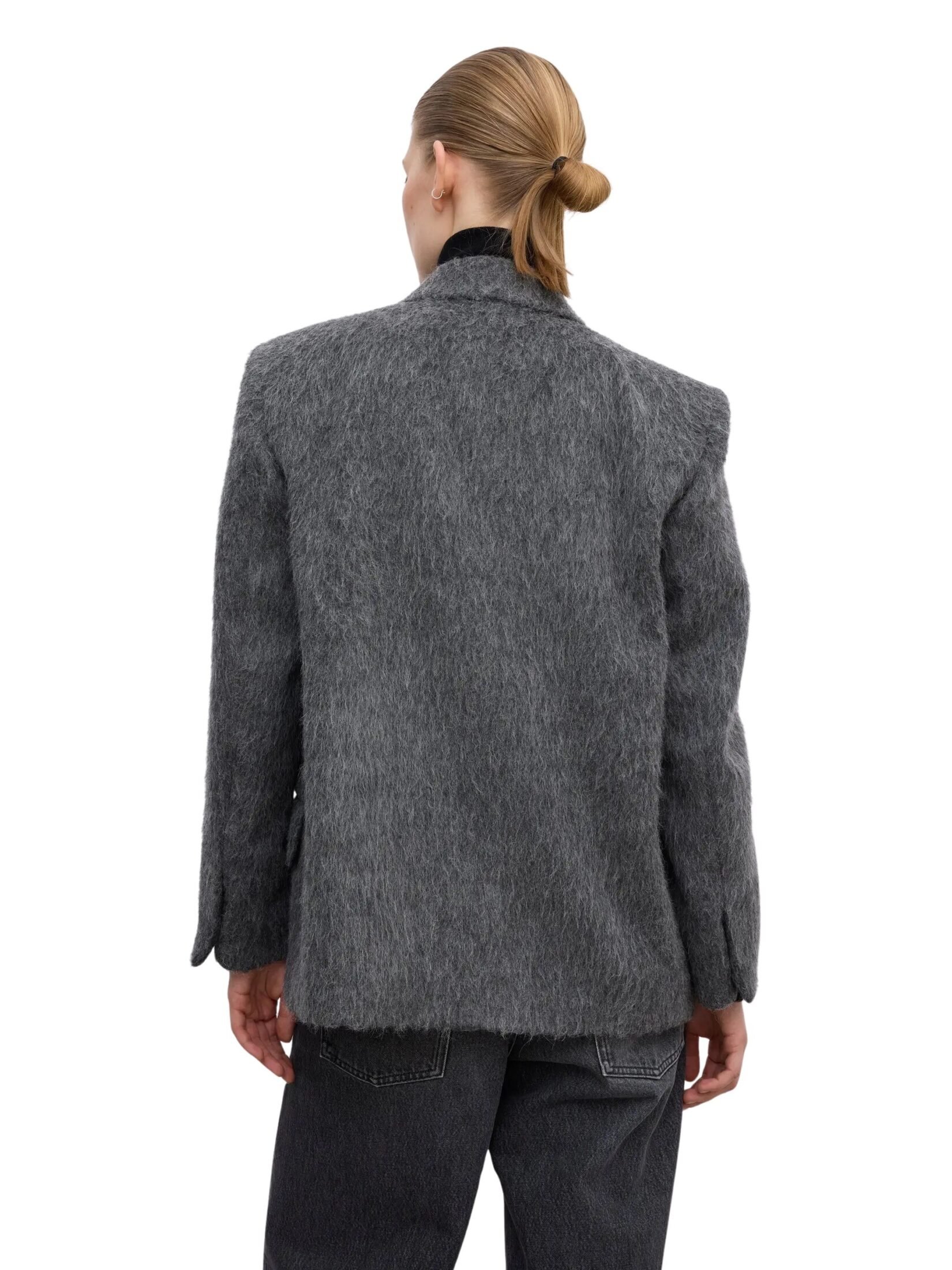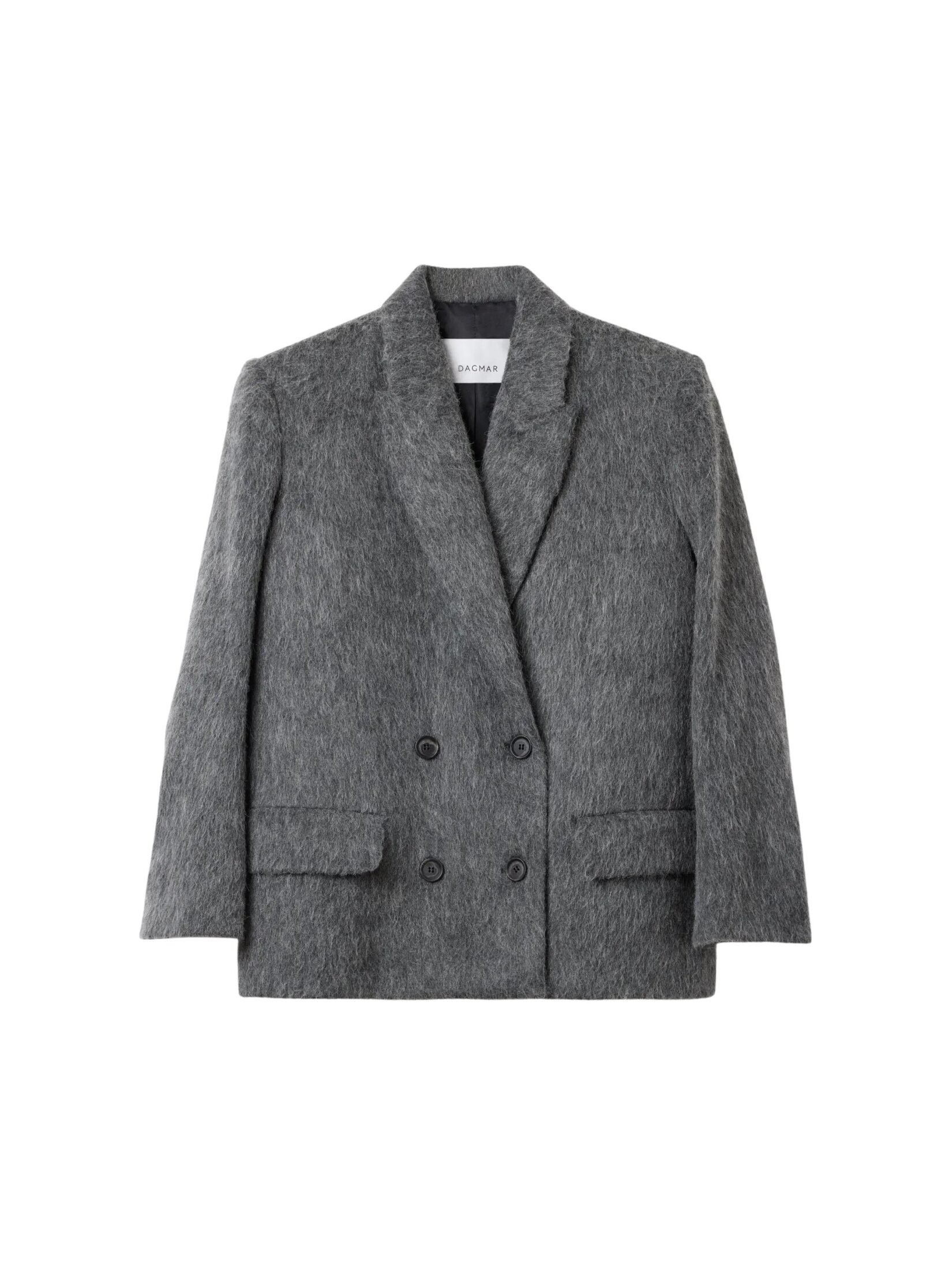 Dobbeltspent jakke til dame fra Dagmar. Avslappet, skreddersydd jakke laget av børstet, frodig og elegant italiensk ull. Komplett med spisse slag, spesiallagde Dagmar-knapper og lommer med klaff foran.