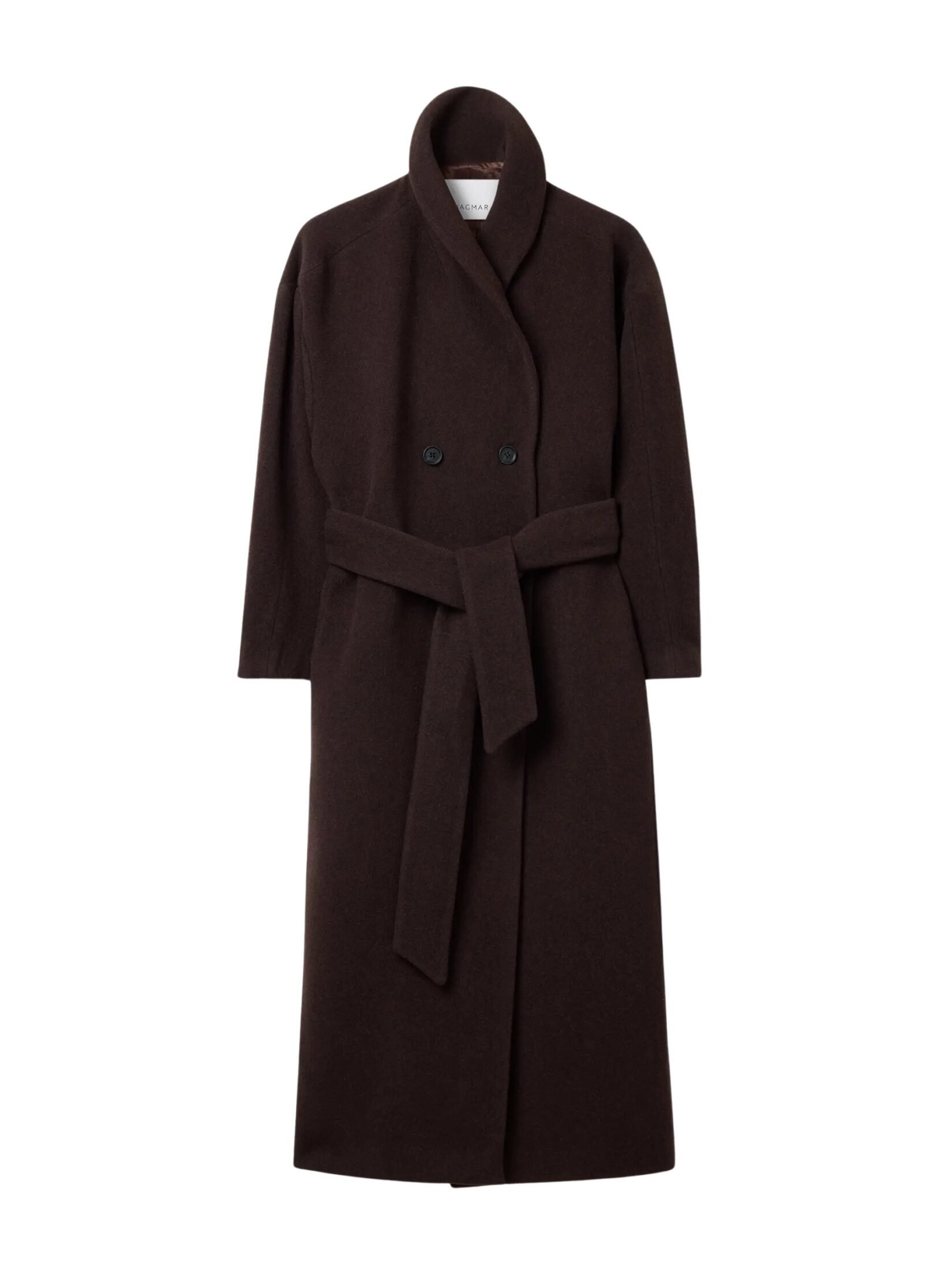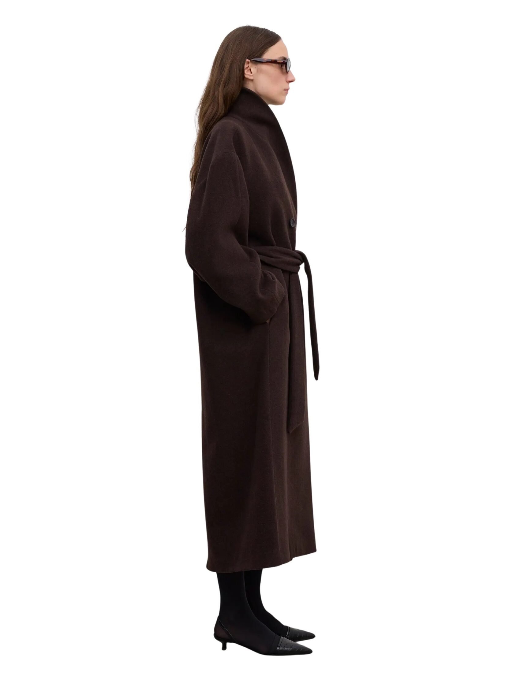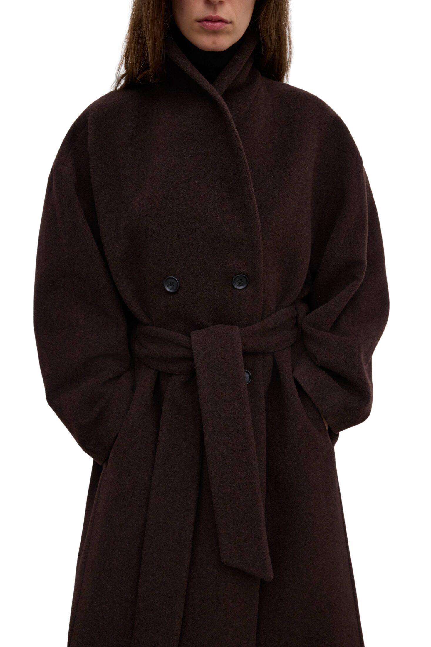 Dobbeltspent kåpe til dame fra Dagmar. Laget i en varm ullkvalitet, med en avslappende silhuett, droppede skuldre, splitt midt bak og sjalkrage. Avsluttet med stikklommer, et avtakbart belte og håndsydde detaljer.