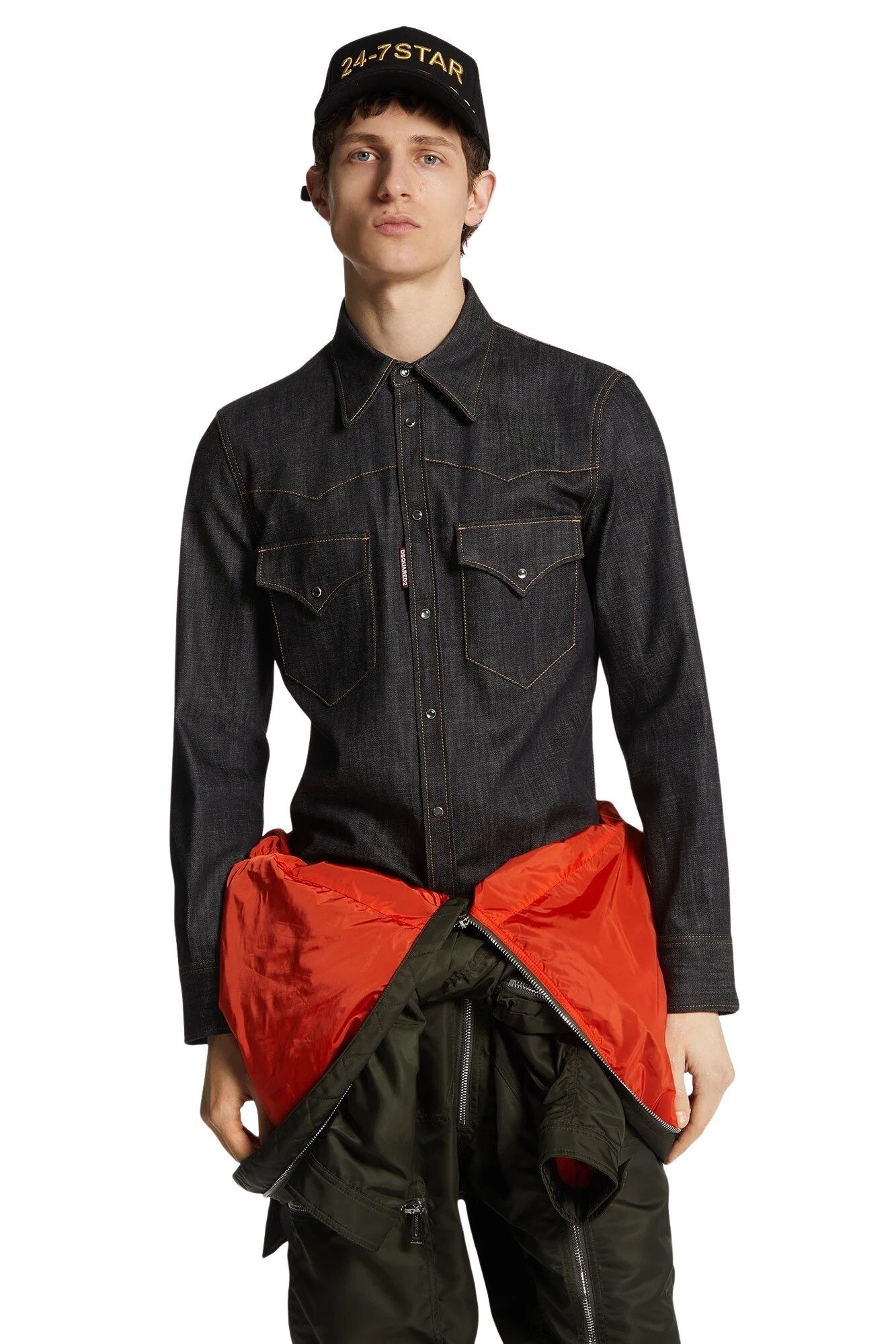 Skjorte til herre fra Dsquared2. Western-stil med innebygd fleksibilitet. Denne stretch-denimskjorten i bomull med kontrastsømmer passer perfekt med innsnitt bak. Pyntet med den signaturrøde Dsquared2-etikett på knappestolpen.