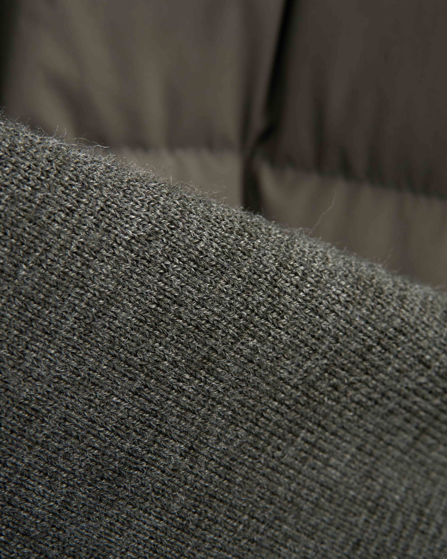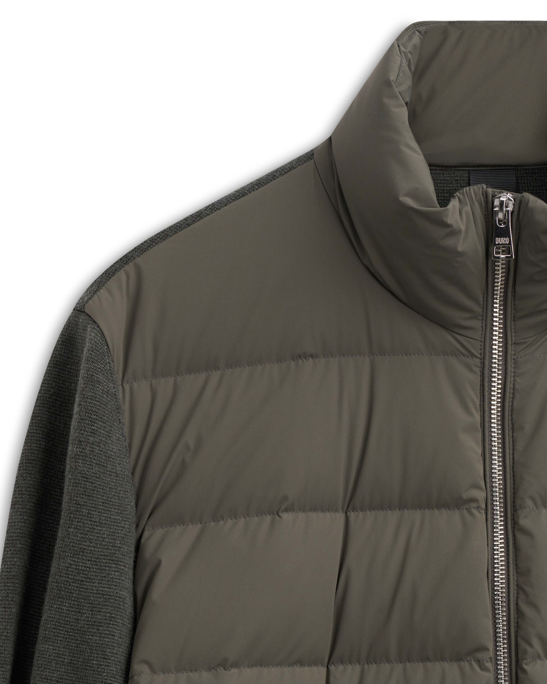 Moderne og funksjonell jakke til herre fra Duno. En eksklusiv jakke som kombinerer sporty komfort med elegant stil. Den vatterte fronten med dun- og fjær gir lett varme, mens strikkede ermer og rygg i ull og akryl sørger for en myk og behagelig passform. Perfekt som et lett ytterplagg eller et stilig lag under en frakk i kaldere vær.