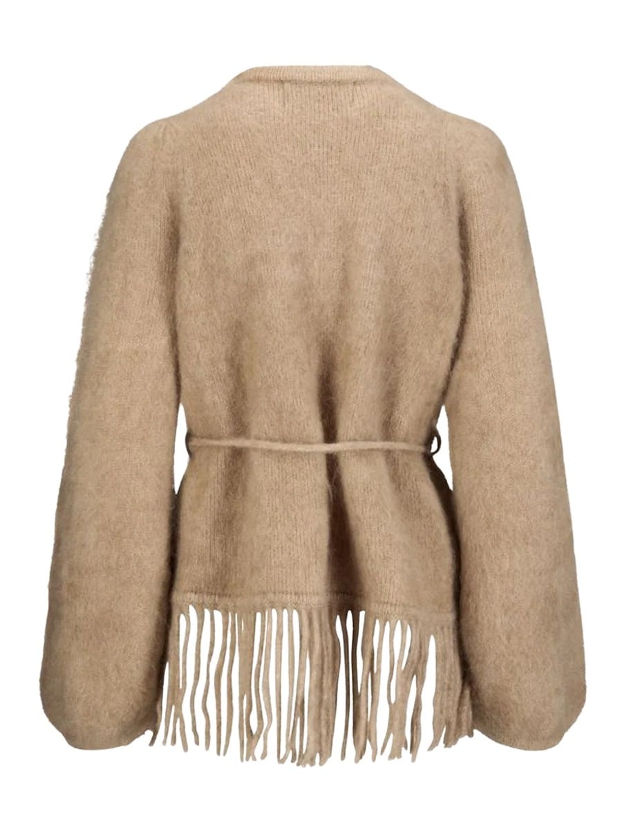 Cardigan til dame fra Ella&il i en myk mohairblanding . En omslagscardigan med justerbart knytebelte og frynsekant nederst for en moderne og leken vri. Perfekt for både hverdagsbruk og penere anledninger.