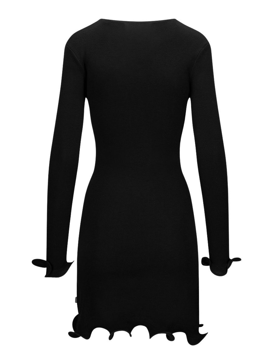 Kjole til dame fra Ella&il i myk merinoull. Kjolen har en figurnær passform med rund hals, lange ermer og dekorative bølgekantdetaljer. En myk og elegant kjole, perfekt til både hverdagsbruk og mer pyntede anledninger.
