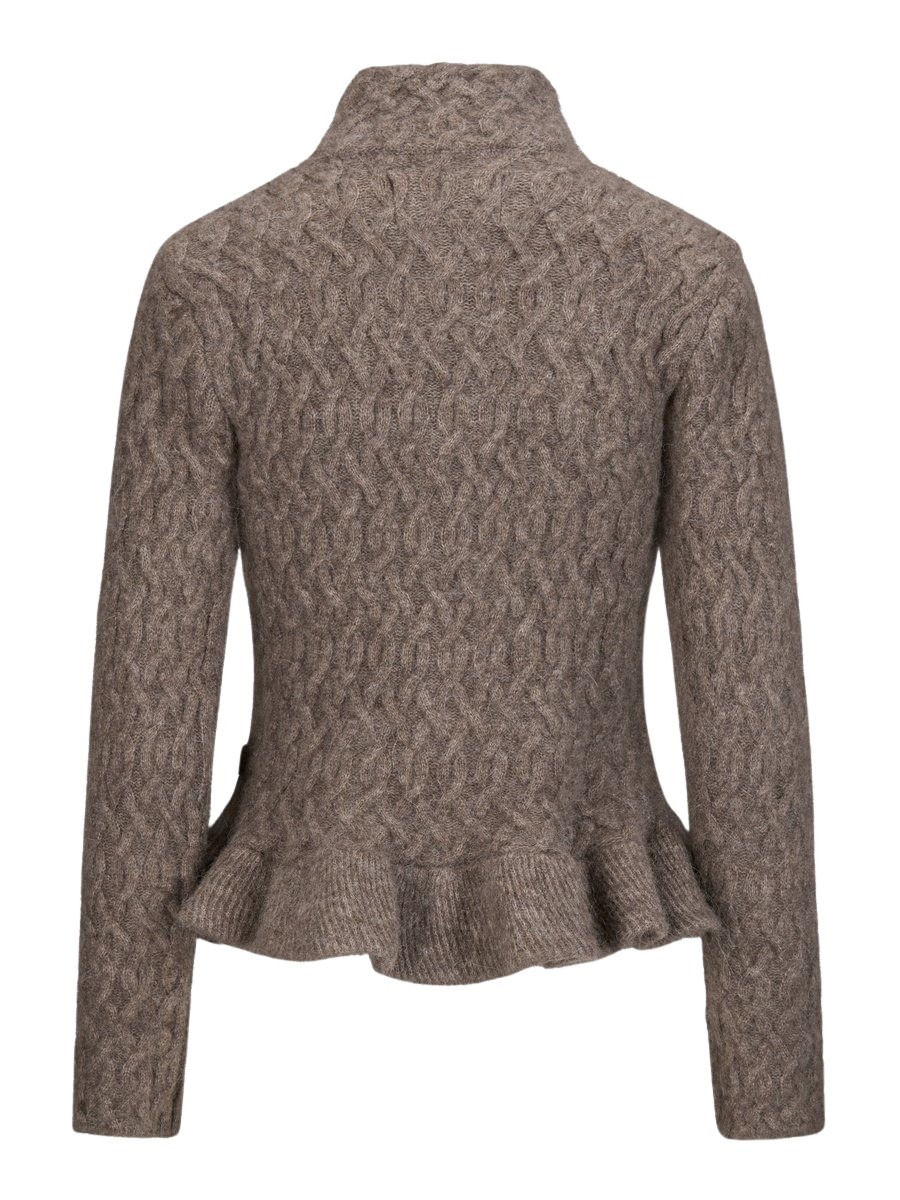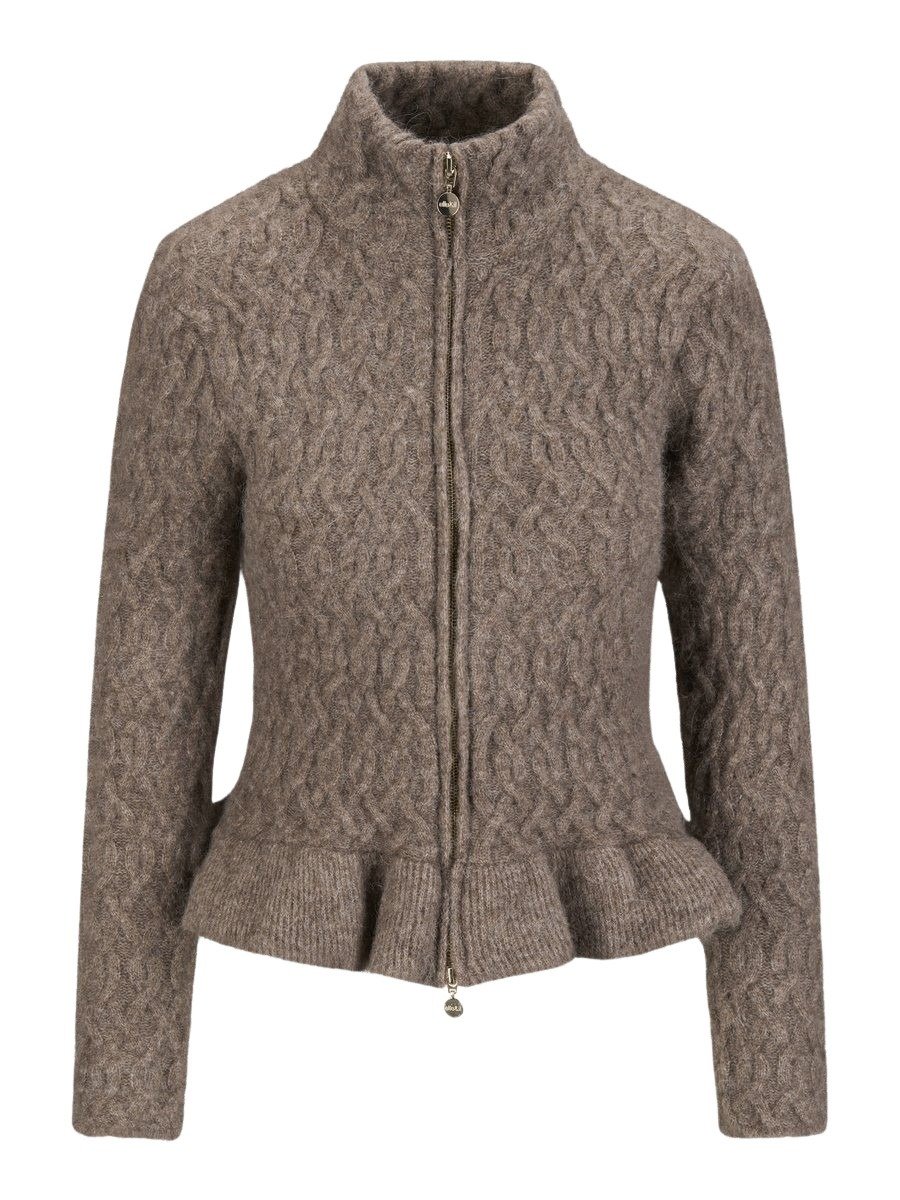 Cardigan til dame fra Ella&il. Et stilig og varmt plagg med lange ermer og høy hals. Cardiganen har rysjer nederst og intrikate flettedetaljer, noe som gir tekstur og sjarm. De avtakbare skulderputene gir allsidighet, og toveis glidelåslukkingen foran gir ekstra funksjonalitet. Den perfekt cardiganen for lag-på-lag-antrekk til høsten og vinteren.