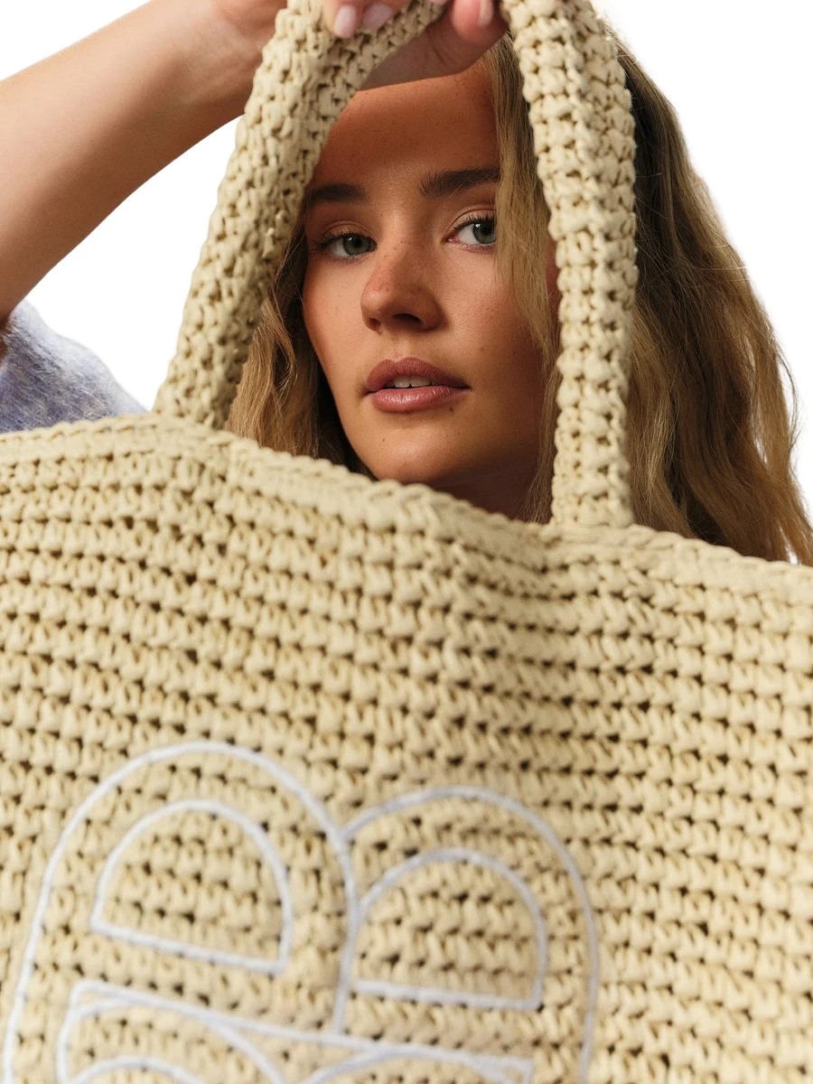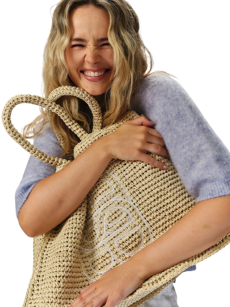 Stråveske til dame fra Ella&il. En romslig totebag i naturlig strå med helfôret innside og glidelåslukking. Dekorert med hvitt monogram foran og designet med lange skulderstropper.