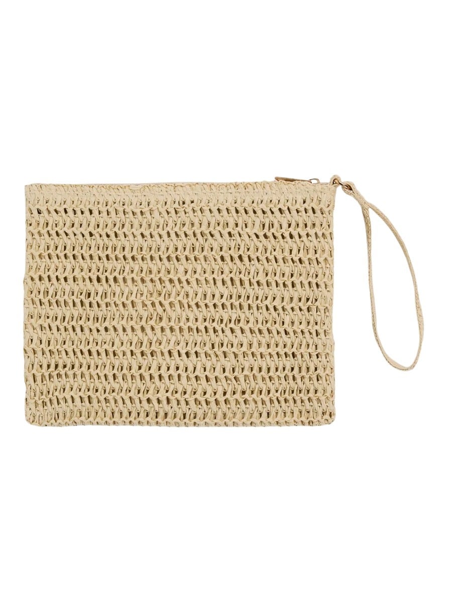 Clutch til dame fra Ella&il. En elegant og funksjonell stråveske med gullfarget glidelås, fôret innside og innerlomme. Bæres enkelt med håndleddshempe i strå. Hvitt monogram i front gir et gjennomført og sommerlig uttrykk.