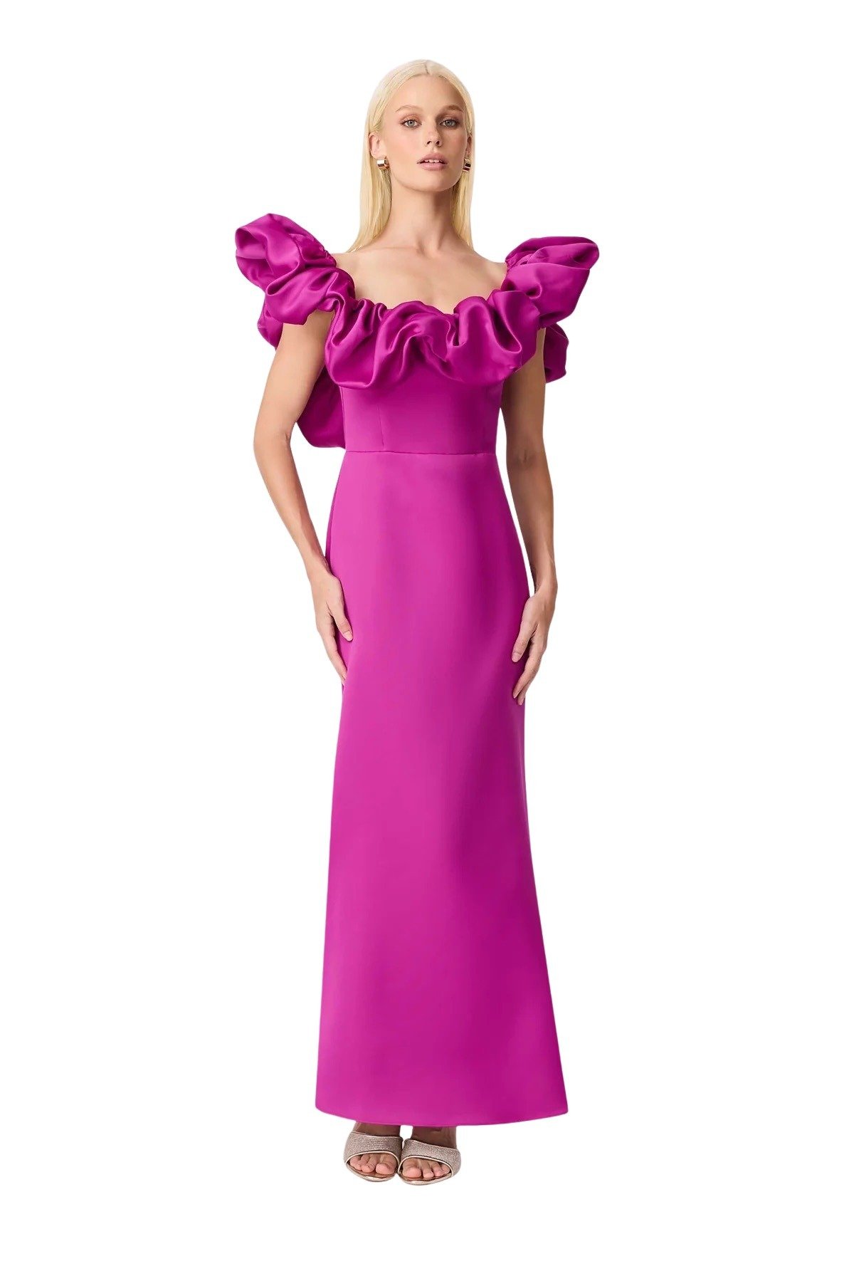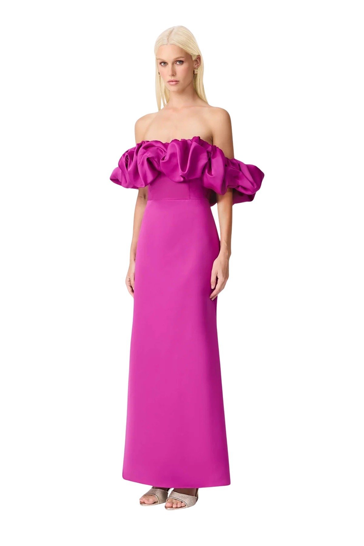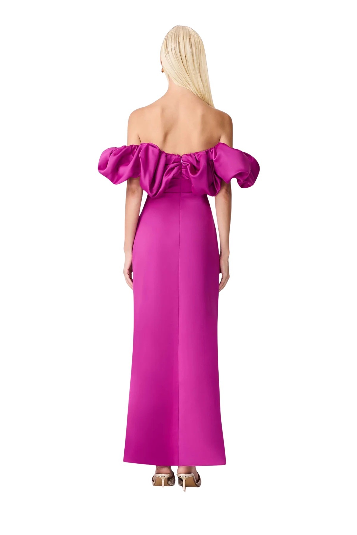 Midikjole til dame fra Elliatt. Kjolen kombinerer luksuriøs duchess-sateng med en moderne, skulderfri silhuett. De voluminøse bobleermene og den flatterende A-linjen gir et feminint, romantisk uttrykk. Skreddersydd for perfekt passform uten stretch, med usynlig glidelås bak og delvis fôr for komfort. Perfekt til bryllup, selskaper og andre anledninger der du vil imponere.