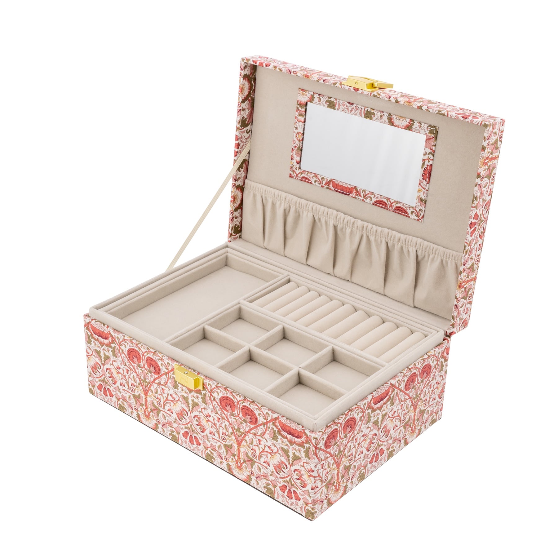 Smykkeskin fra Emilia By Bon Dep. Dette elegante, kvadratiske smykkeskrinet i Liberty-stoff med Lodden-print gir deg både vakker design og praktisk organisering av smykkene dine.