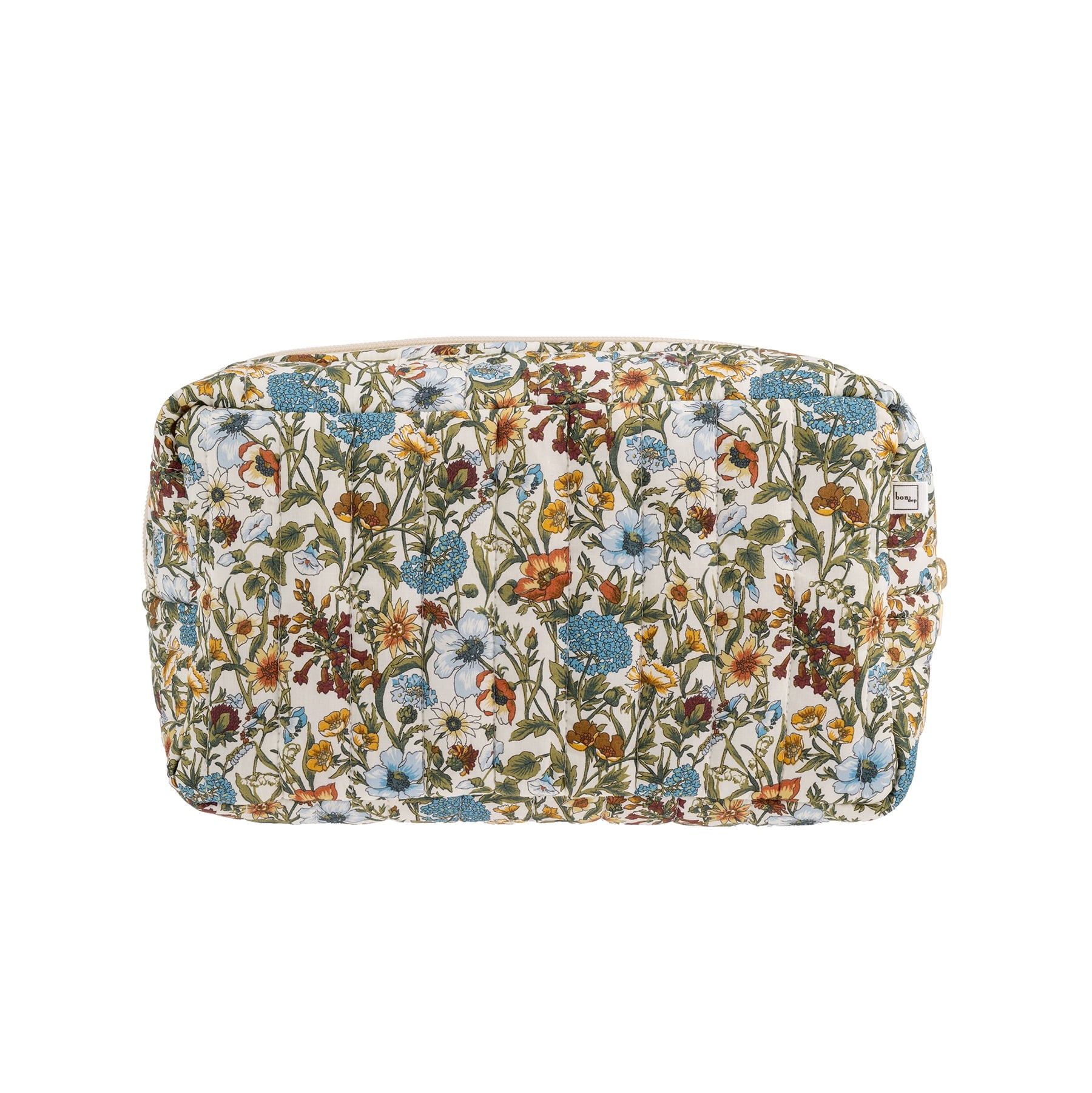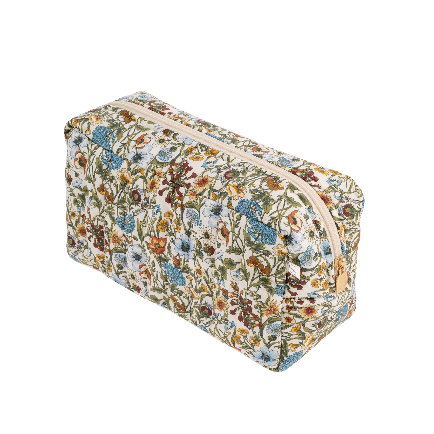 Toalettmappe fra Emilia By Bon Dep. Denne lekre kvadratiske toalettmappen i Liberty-stoff med Rachel-print kombinerer praktisk oppbevaring med et nydelig, blomstrende uttrykk.