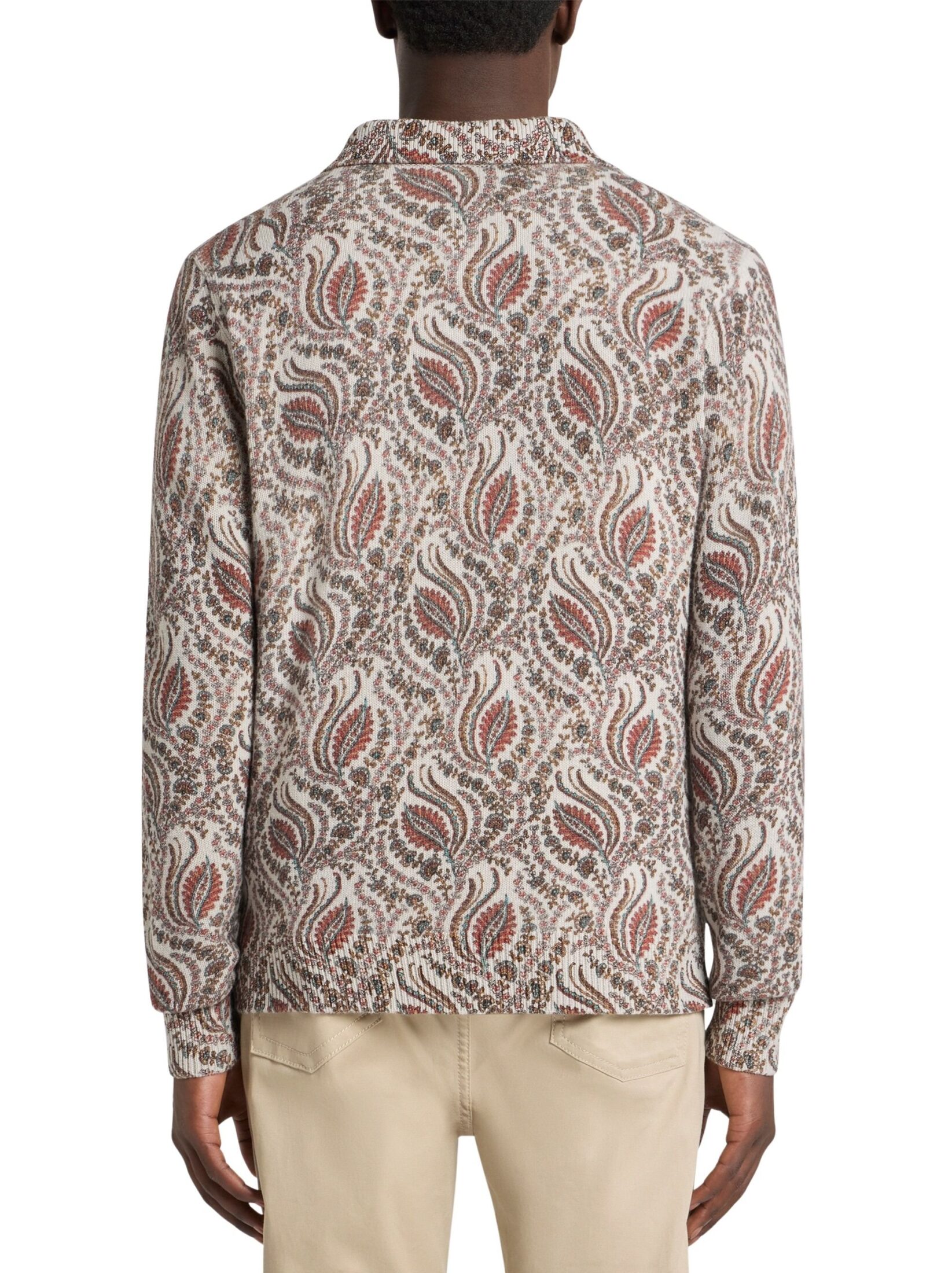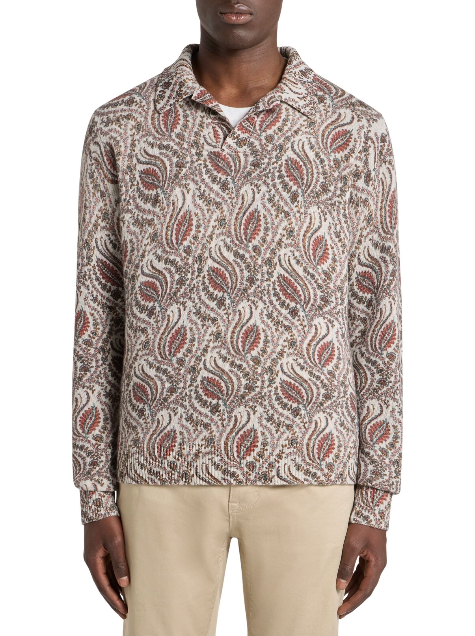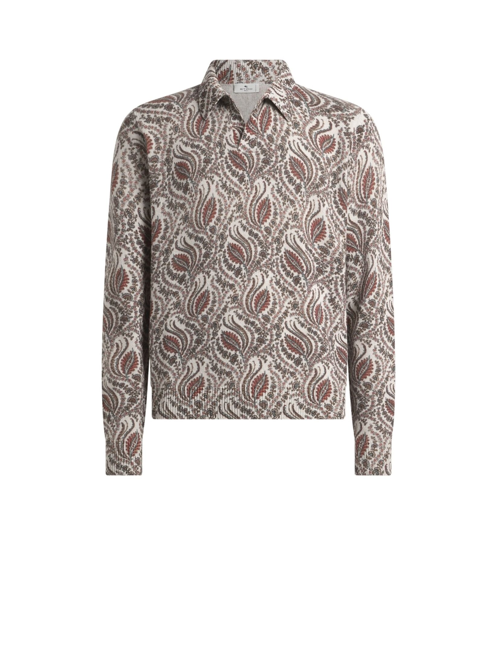 Genser til herre fra Etro i eksklusiv ullkvalitet med jacquardvevd mønster. Et sofistikert plagg med flerfarget bladmotiv og polokrage, perfekt for en elegant og uttrykksfull stil.