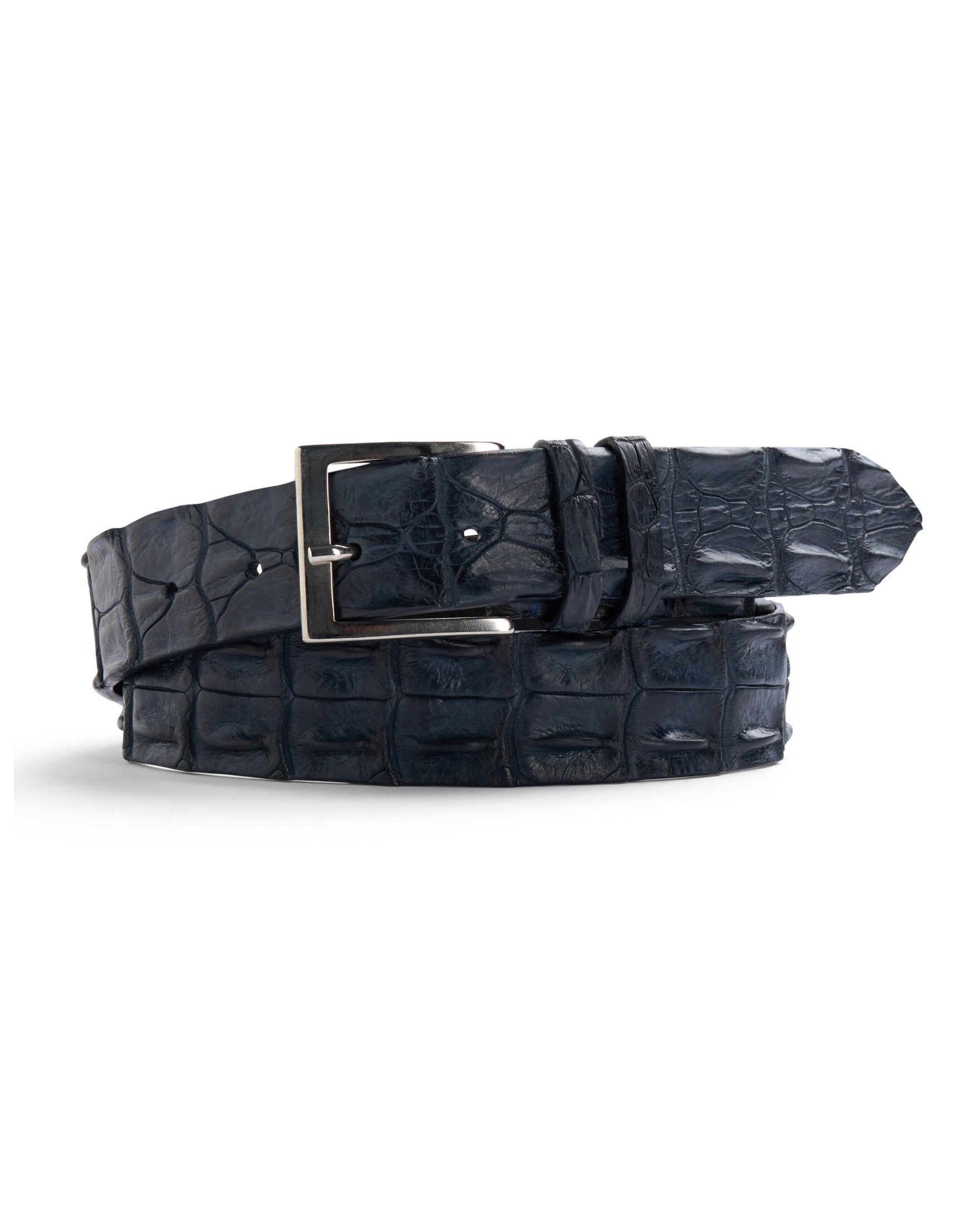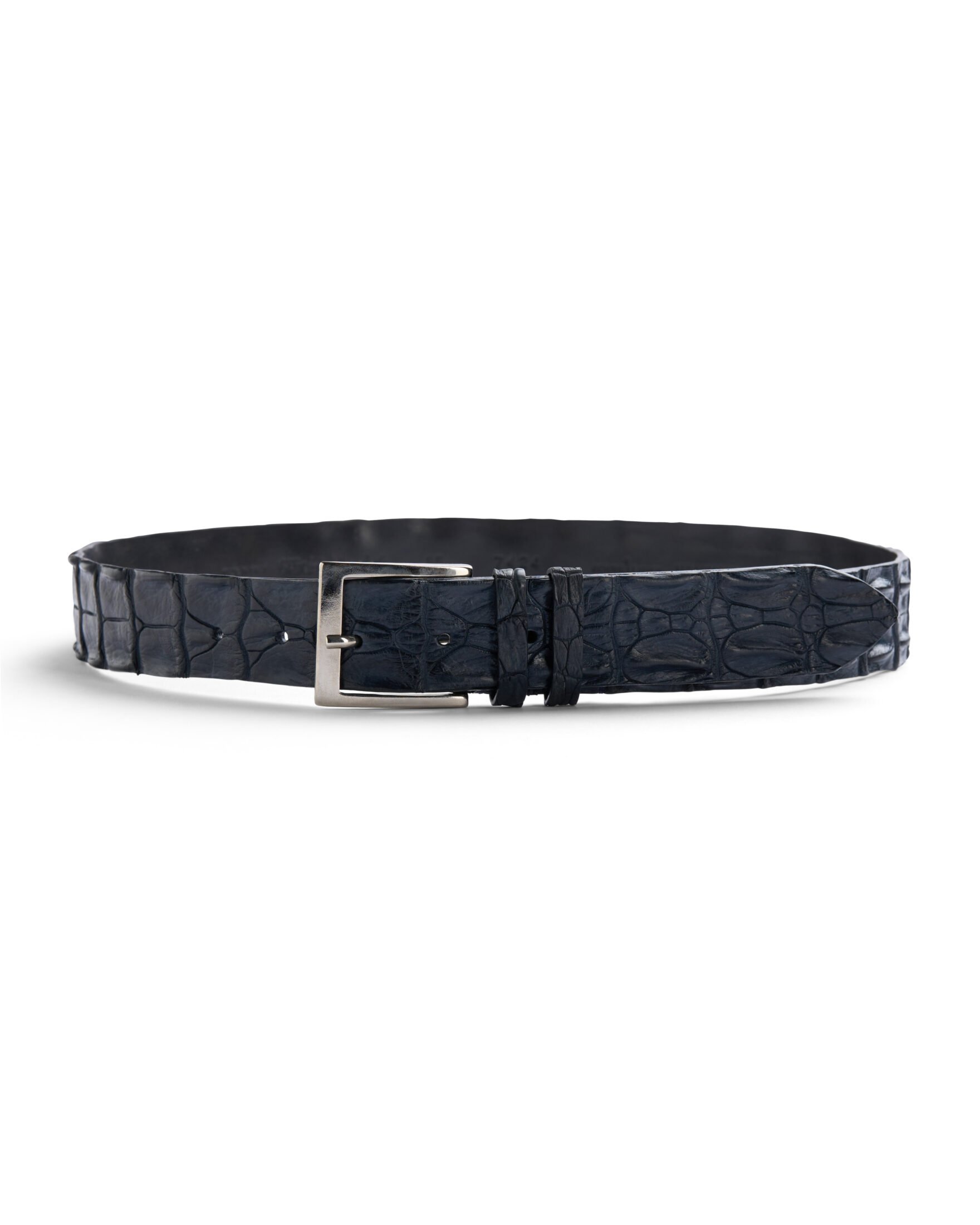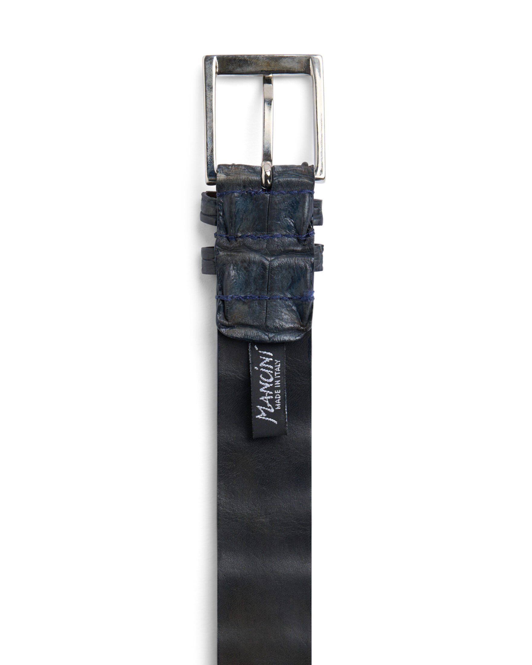 Luksuriøst belte til herre fra Fabrizio Mancini, laget av 100% skinn i Italia. Elegant mørk blå farge med preget krokodillemønster som gir et eksklusivt og sofistikert uttrykk. Den klassiske metallspennen tilfører et tidløst preg. Perfekt for deg som ønsker et stilrent og raffinert tilbehør til hverdagsantrekket.