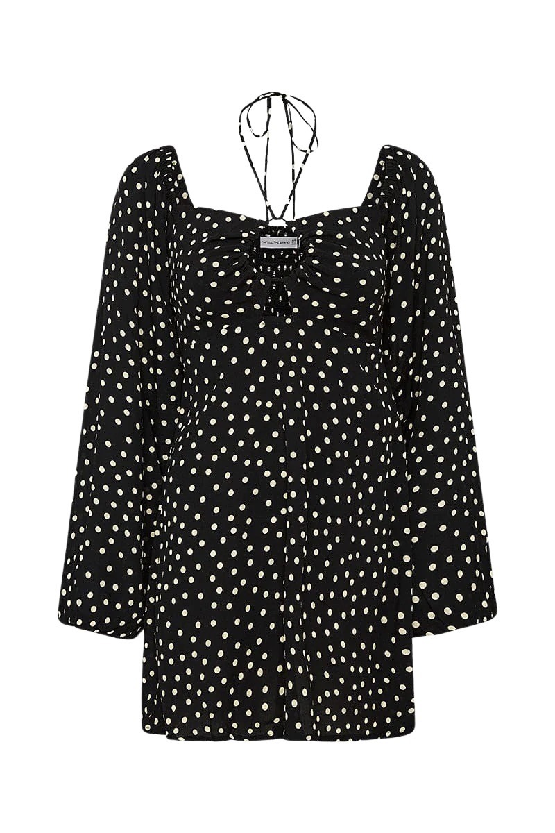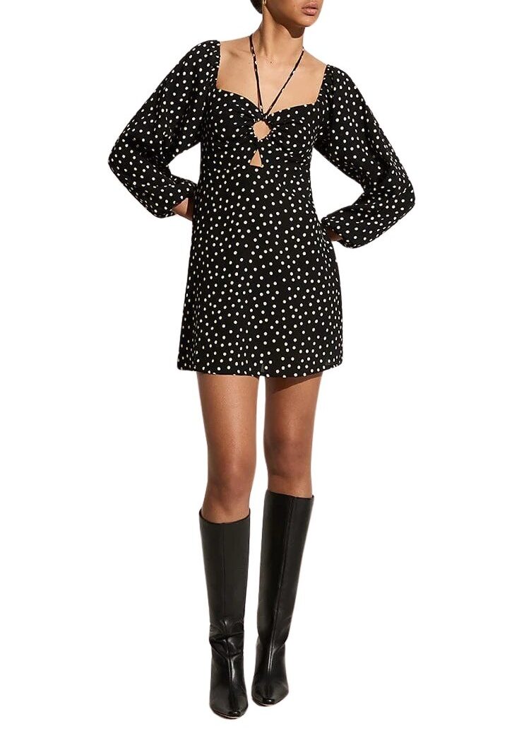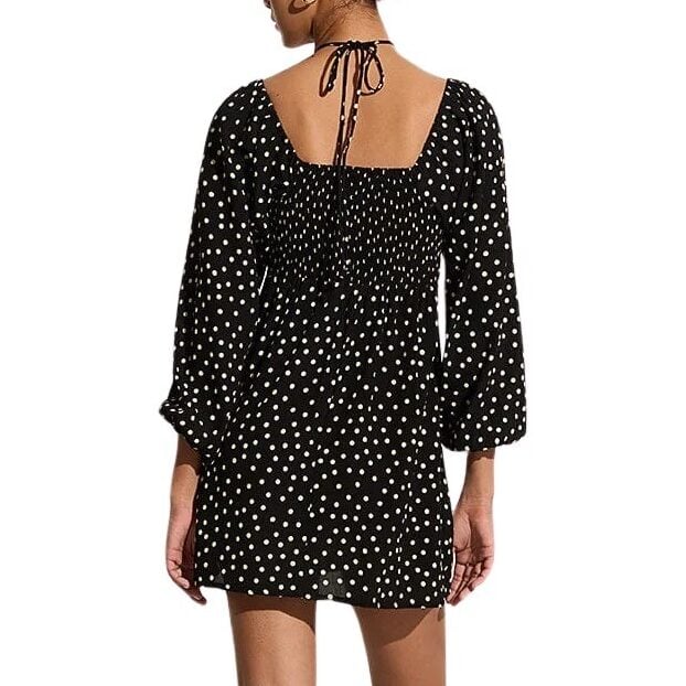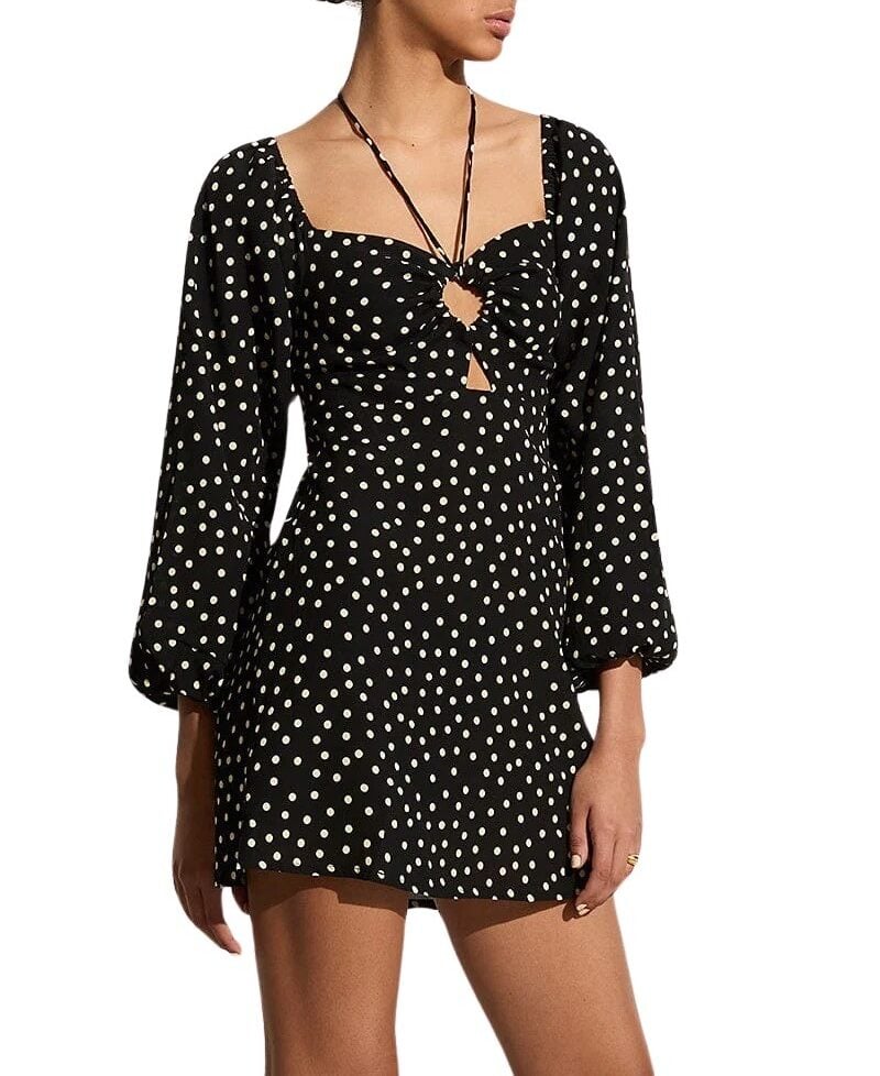 Kort kjole fra Faithful The Brand med polkadott mønster. Kjolen har en dyp utringning med en sjarmerende nøkkelhullsdetalj og en knyting som kan justeres rundt halsen eller foran. Denne lekne kjolen har en elastisk rygg ogs voluminøse ermer.