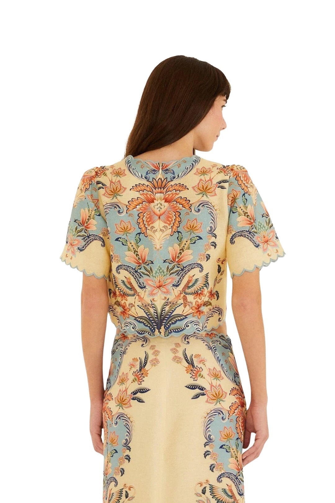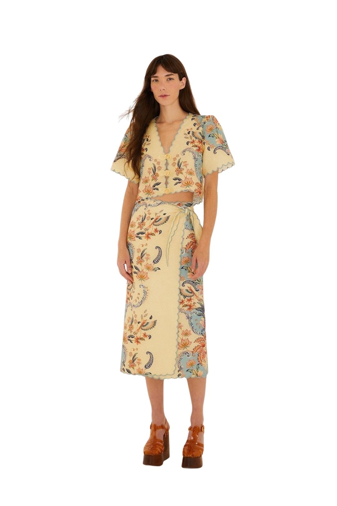 Bohemsk topp til dame fra Farm Rio. Laget i luftig Euroflax™-lin og byr på et vakkert print i myke, solvarme toner. Den feminine V-utringningen og dekorative kantene gir et delikat uttrykk, mens den avslappede passformen gjør den perfekt på varme dager. En lett og stilfull topp som setter prikken over i-en på sommergarderoben.