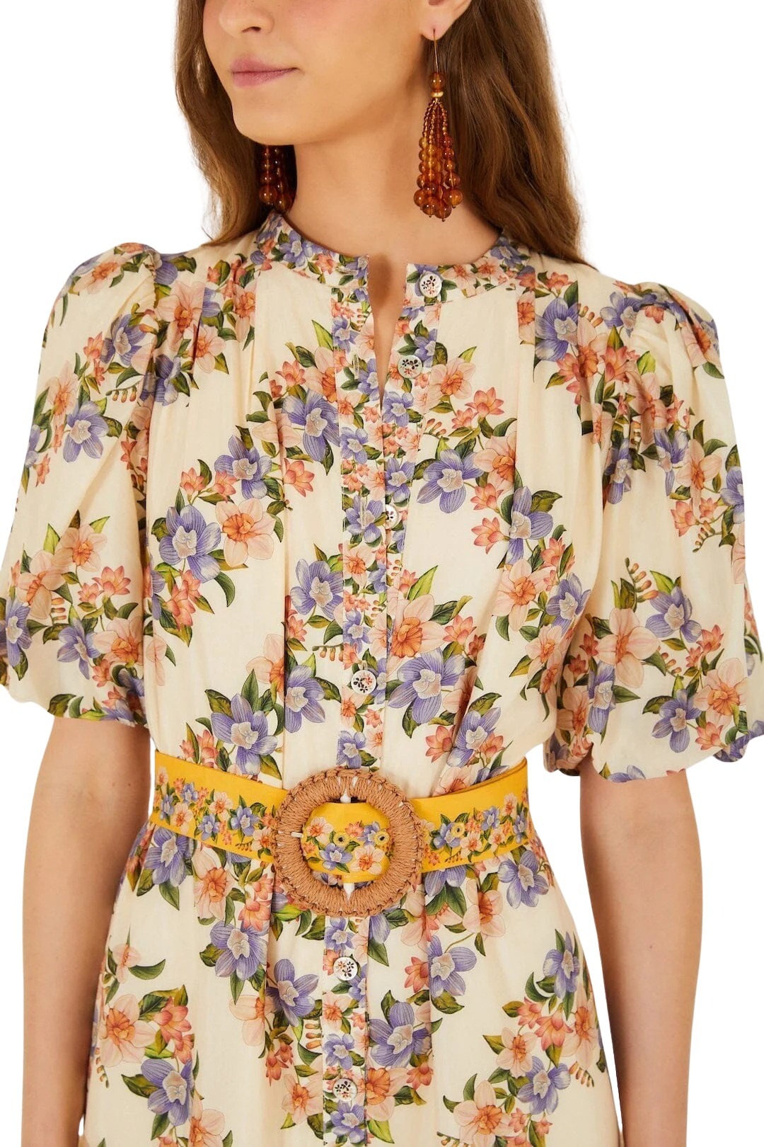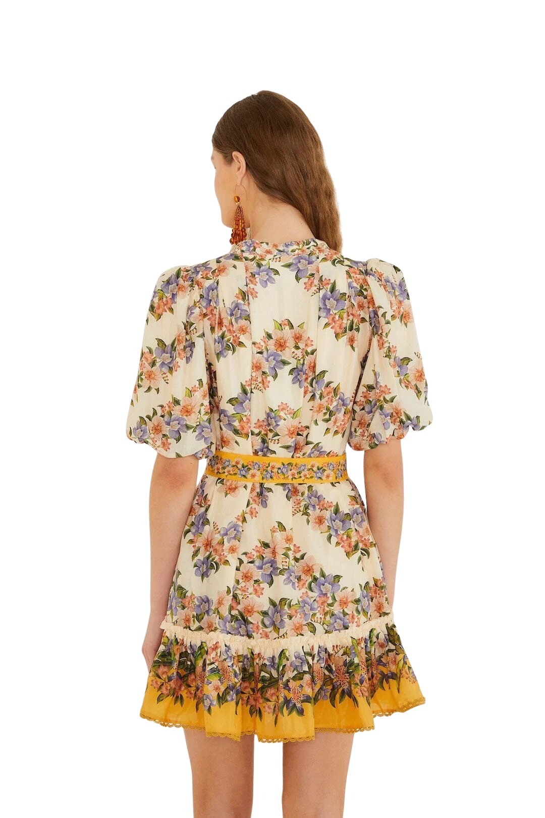Kjole til dame fra Farm Rio. En feminin minikjole med et romantisk blomsterprint i varme, solkyssede toner. Den markerte midjen med belte og de lette puffermene gir en flatterende og leken silhuett. Perfekt til sommerdager. Style med sandaler eller espadriller for en avslappet, elegant look.