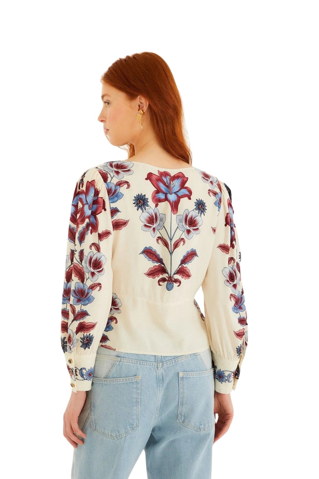 Bluse til dame fra Farm Rio. Elegant bluse laget av 100% viskose med et vakkert blomsterprint og delikat knappedetalj i front. Den lette, myke kvaliteten og flatterende fasongen gjør den perfekt både til hverdags og mer pyntede anledninger.