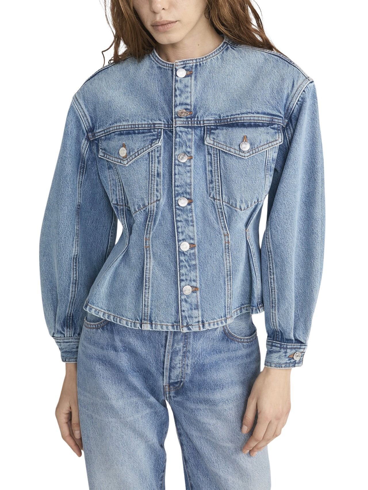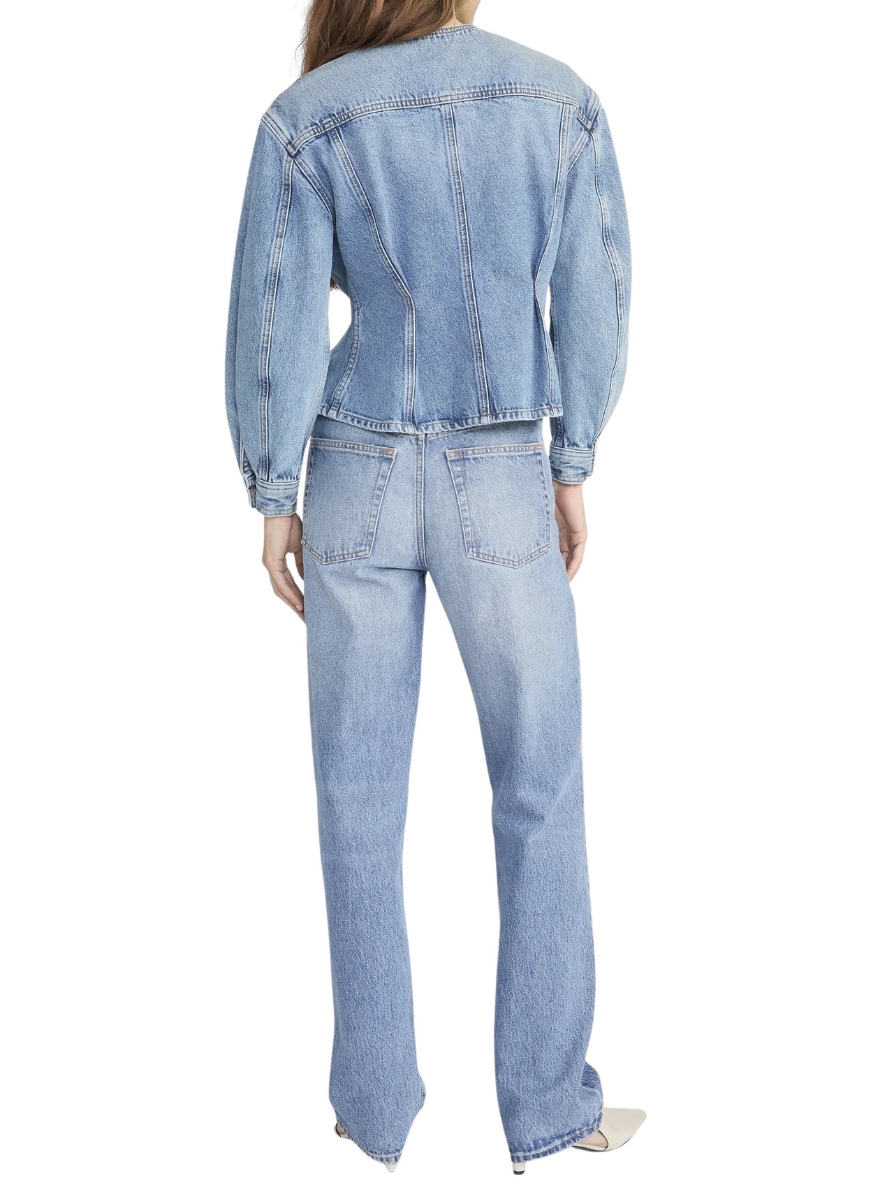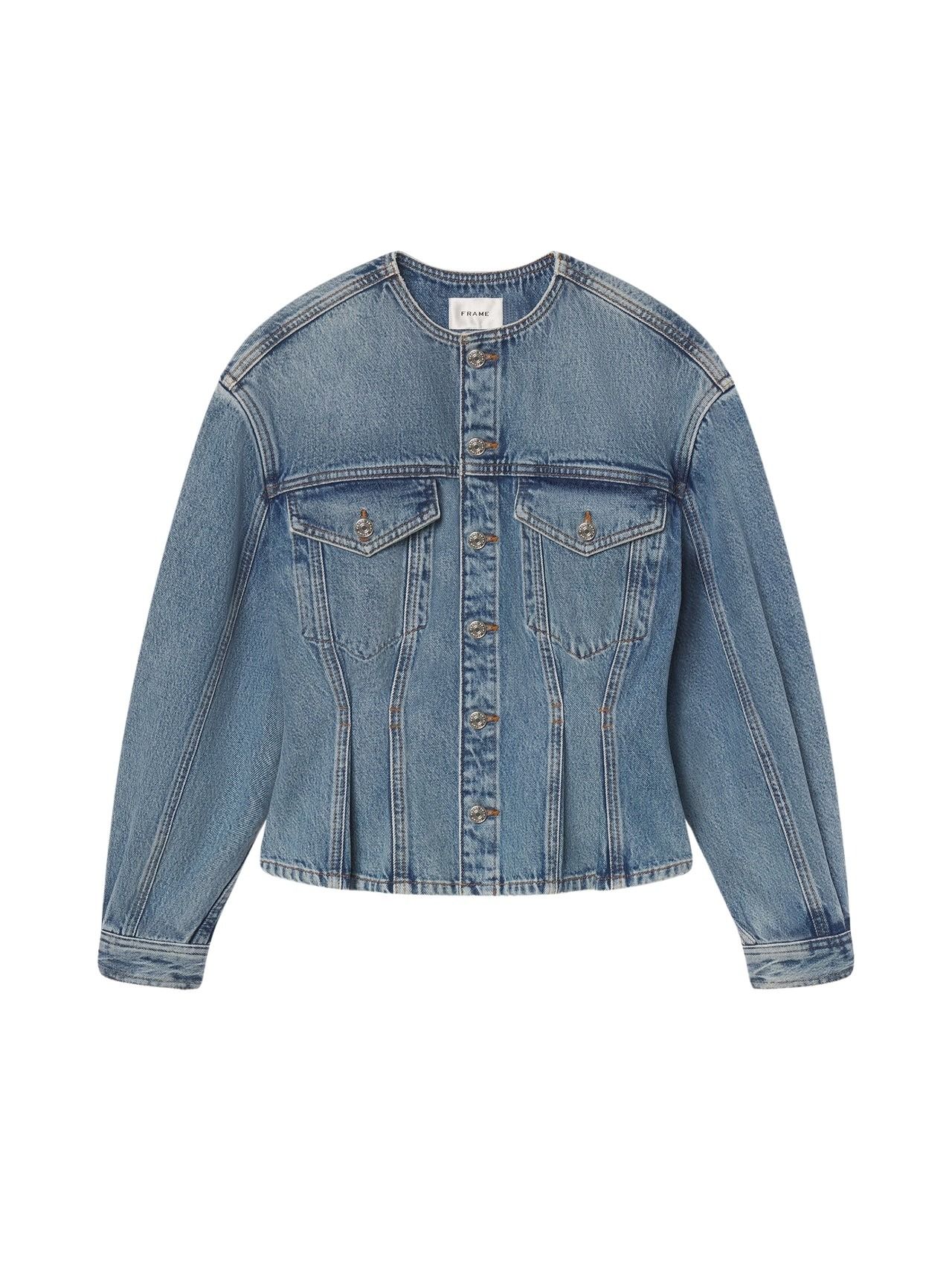 The Nipped Collarless Jacket fra FRAME. Laget i 100 % bomullsdenim og har et rent, krageløst design. Den innsvingte midjen og den feminine peplum-silhuetten gir jakken et elegant og moderne uttrykk. En sofistikert tolkning av den klassiske denimjakken.