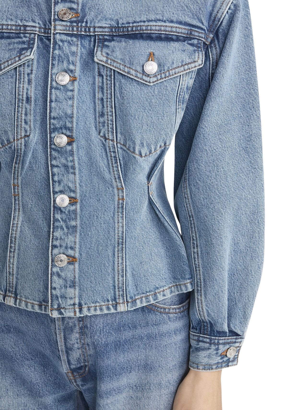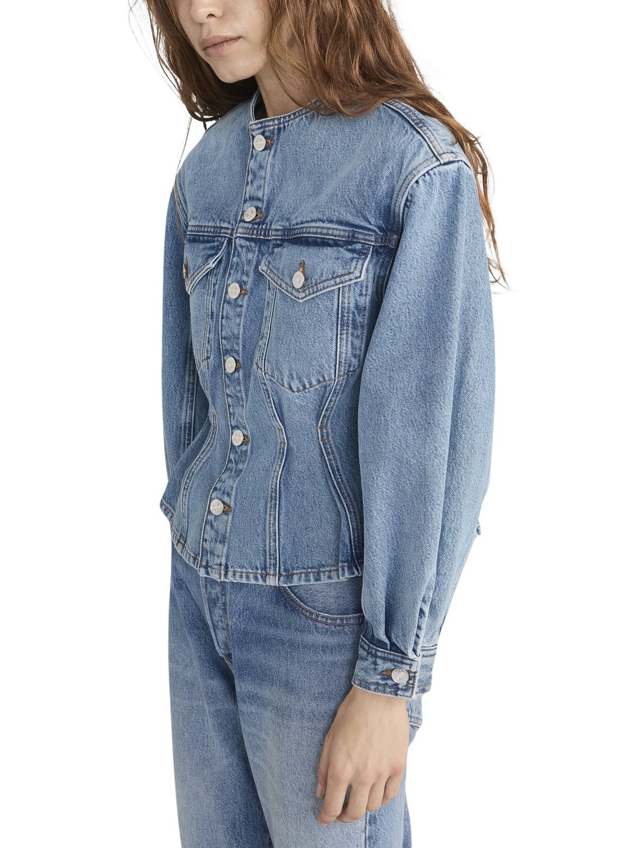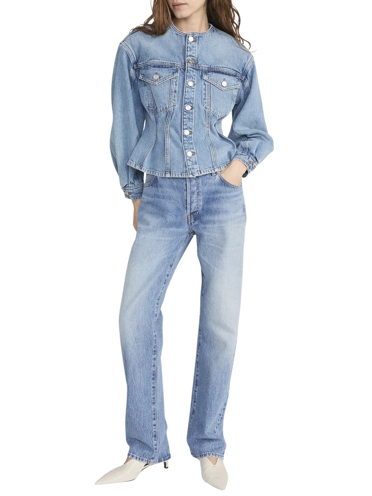 The Nipped Collarless Jacket fra FRAME. Laget i 100 % bomullsdenim og har et rent, krageløst design. Den innsvingte midjen og den feminine peplum-silhuetten gir jakken et elegant og moderne uttrykk. En sofistikert tolkning av den klassiske denimjakken.