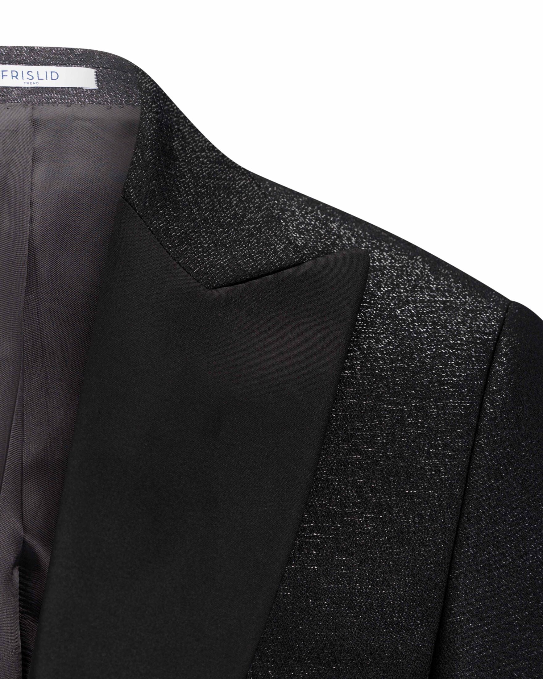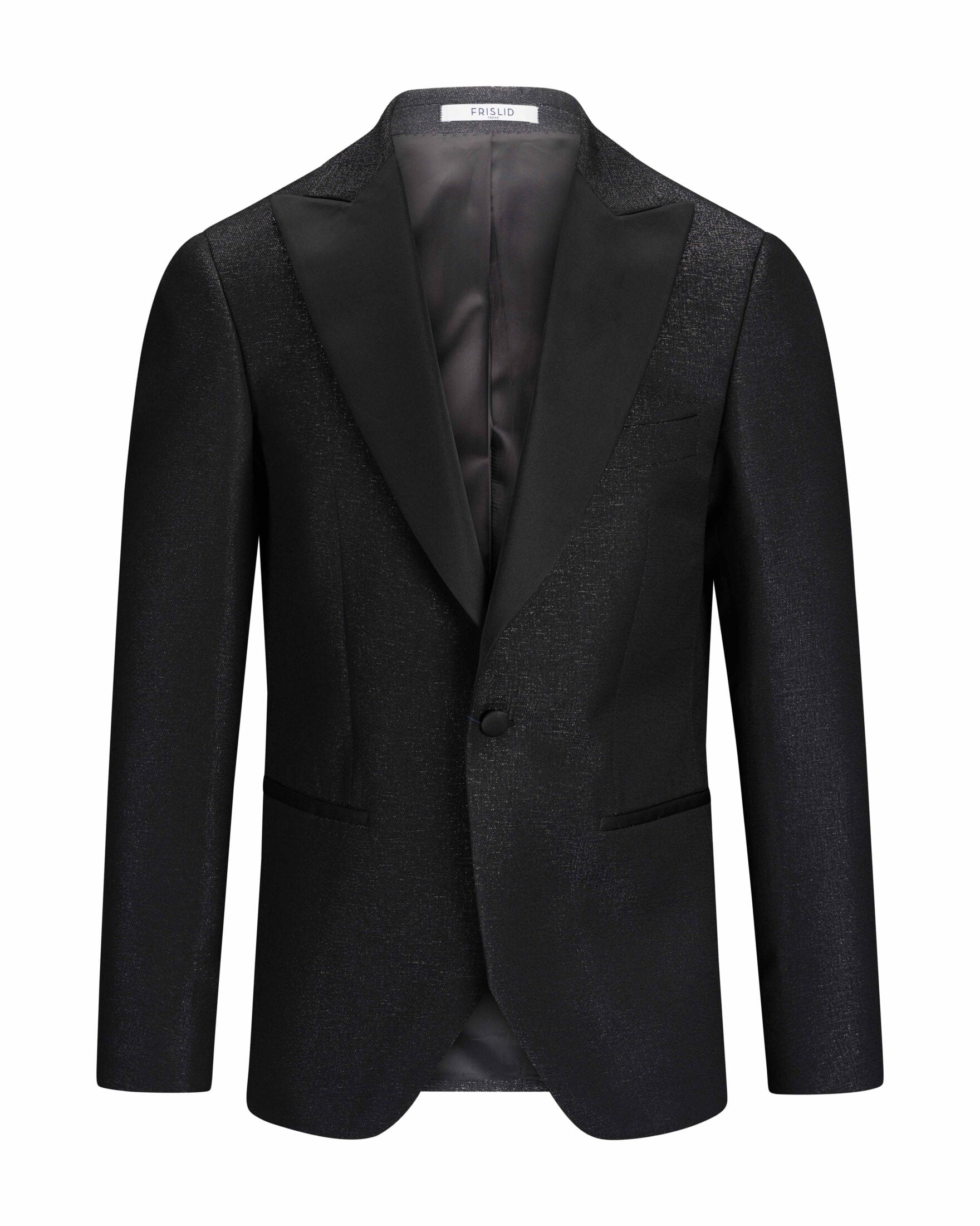 James fra Frislid. En moderne smokingjakke i en eksklusiv blanding av ull og polyester, med en subtil glans som gir et sofistikert og festklart uttrykk. De brede sjalreversene i silkematt finish tilfører en elegant kontrast og et luksuriøst preg. Et perfekt valg for høytidelige anledninger der du ønsker et markant og stilrent look.
