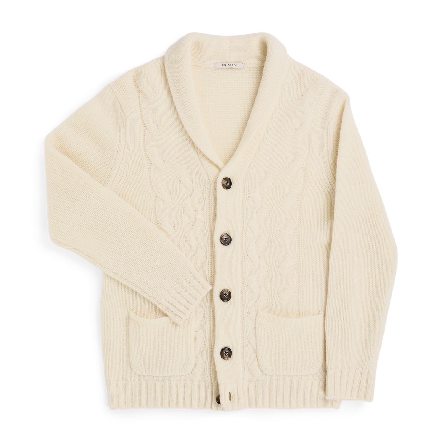 Flott strikket cardigan til herre fra Frislid. Cardiganen har shawl-krage, klassiske knapper og kraftig flettedetalj i front. En jakke som skaper et avslappet, men fortsatt kledd uttrykk.