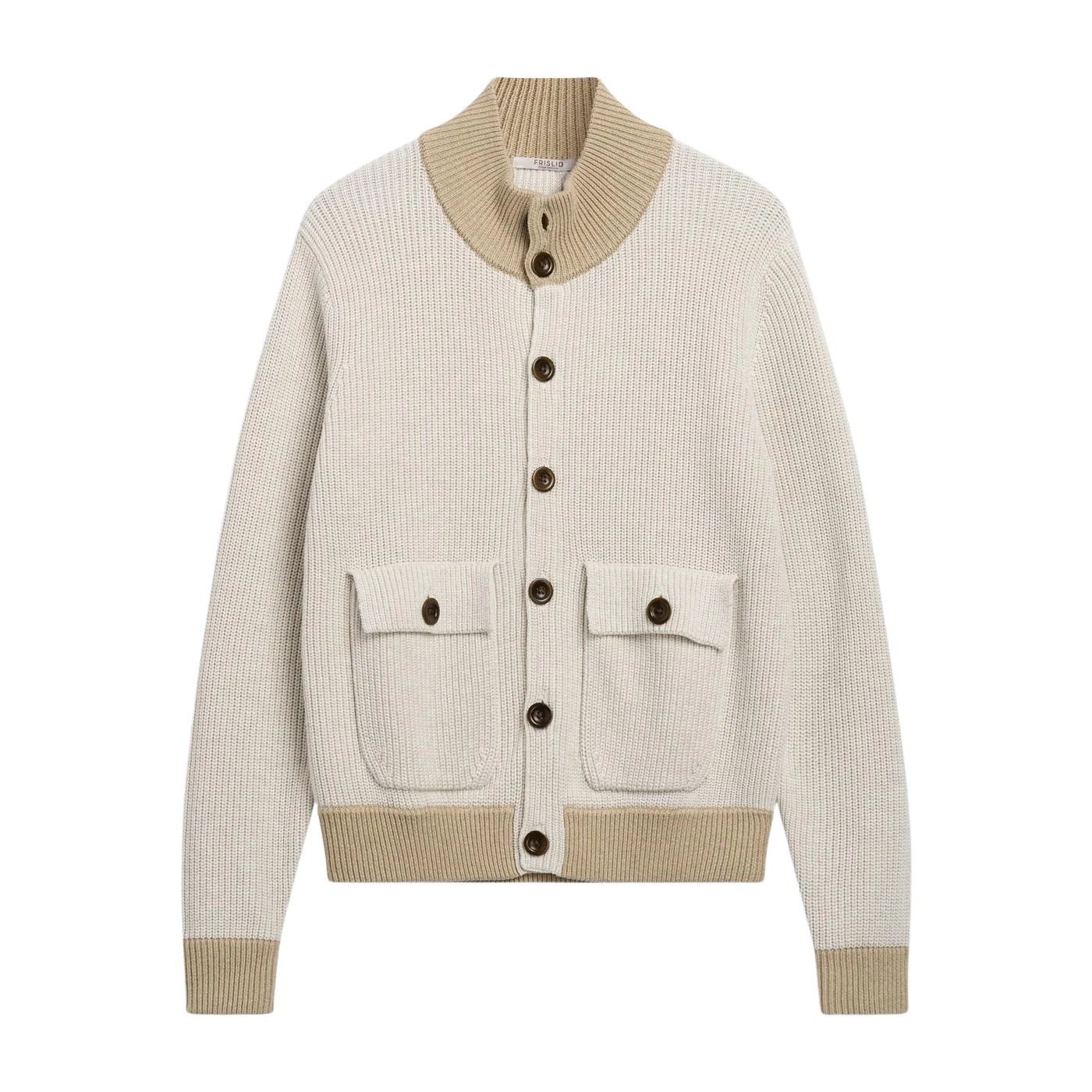 Cardigan til herre fra Frislid. Strikket i 100% bomull med strukturert overflate og kontrastdetaljer i krage, ermer og fald. Designet med høy ribbekrage og frontlommer som gir et sofistikert, men avslappet uttrykk.