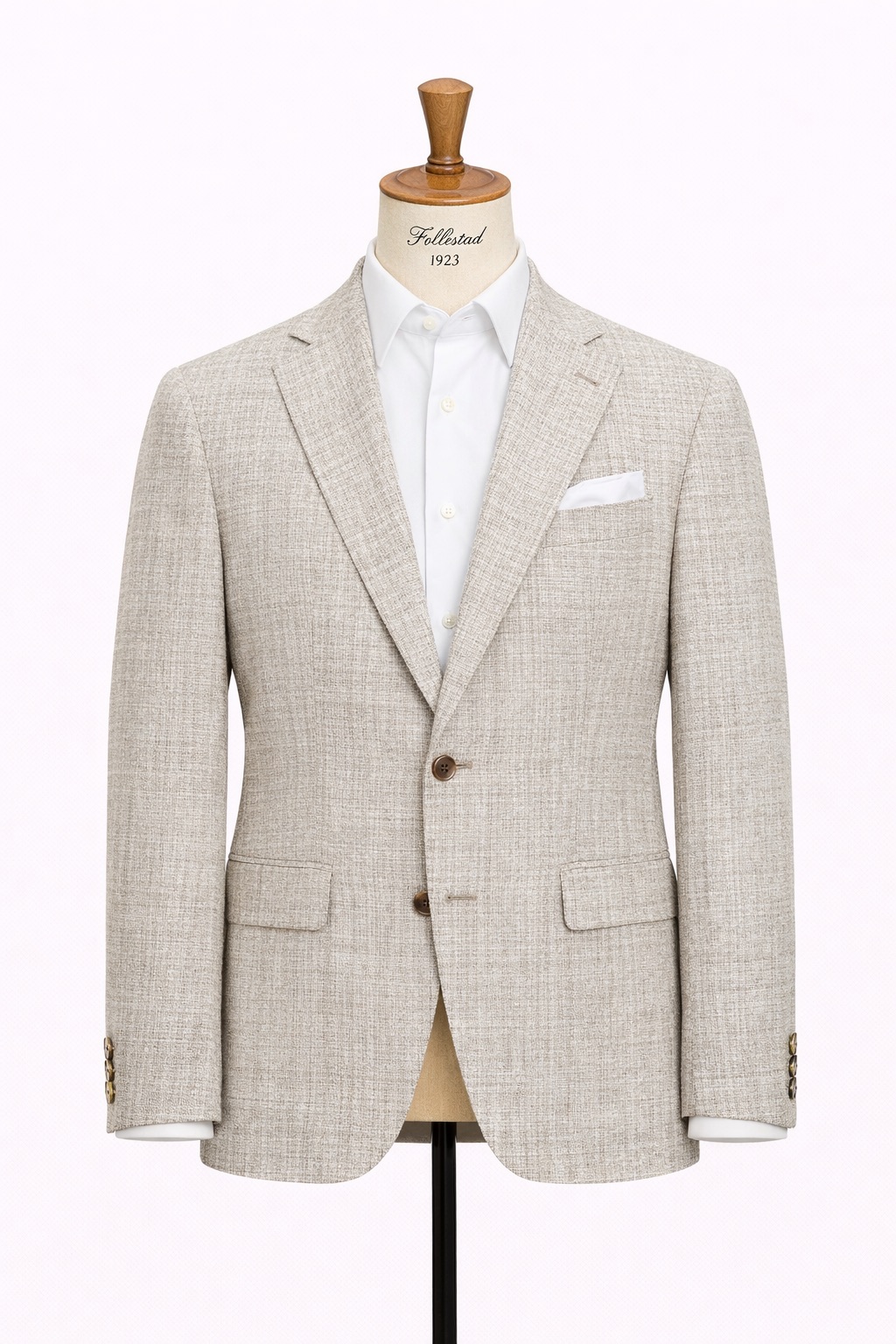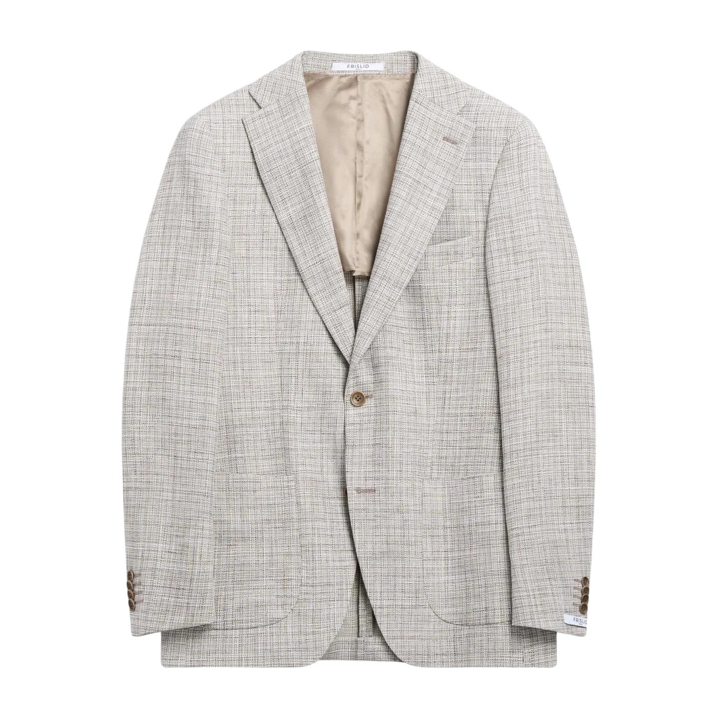 Blazer til herre fra Frislid. Enkeltspent modell med klafflommer og rett passform. Laget i en eksklusiv blanding av ull, bomull og lin med lett stretch som gir komfort og struktur. Et sofistikert valg med matchende knapper og tidløst mønster.