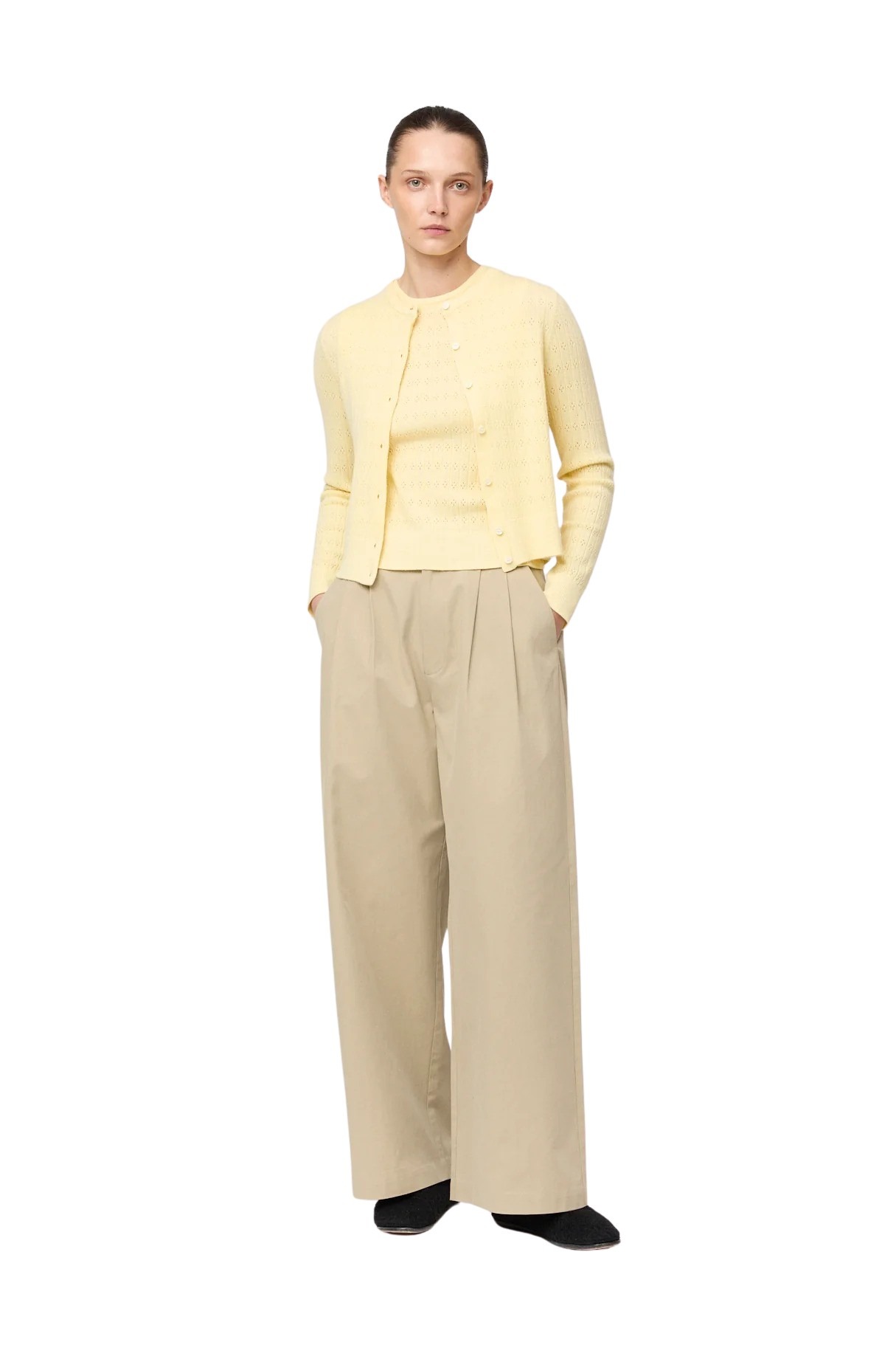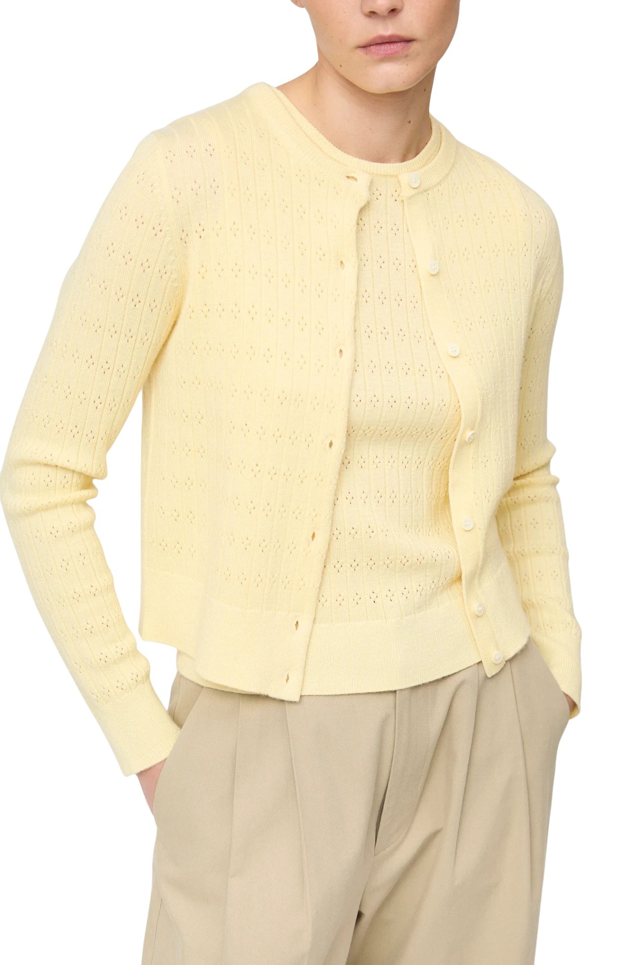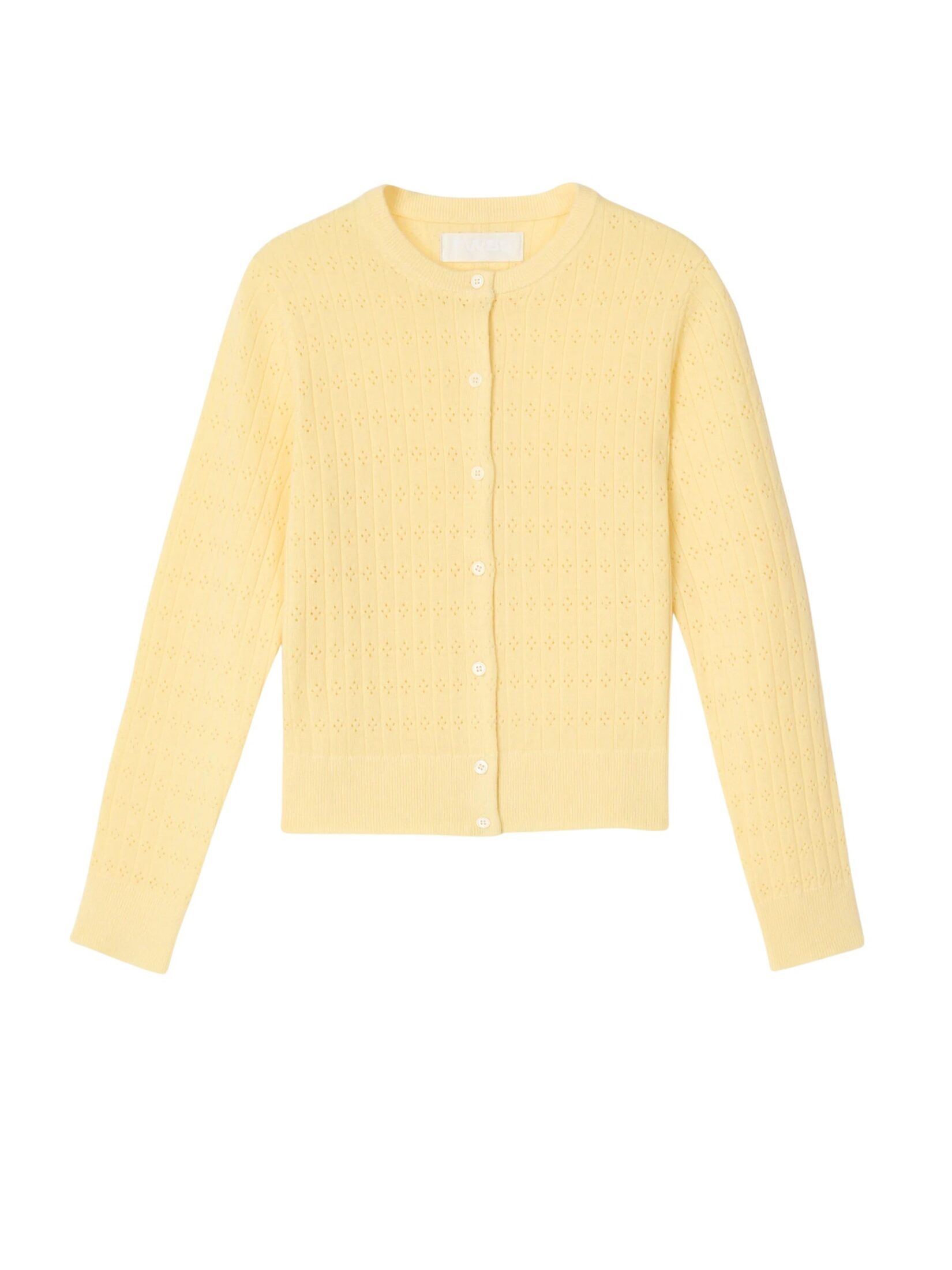 Pointelle Classic Cardigan fra FWSS. Strikket i myk merinoull med et delikat pointelle-mønster som gir et lett og feminint uttrykk. Den korte lengden som treffer i midjen skaper en moderne og flatterende silhuett. Style den gjerne sammen med Pointelle Classic Tank for et gjennomført og elegant sett.