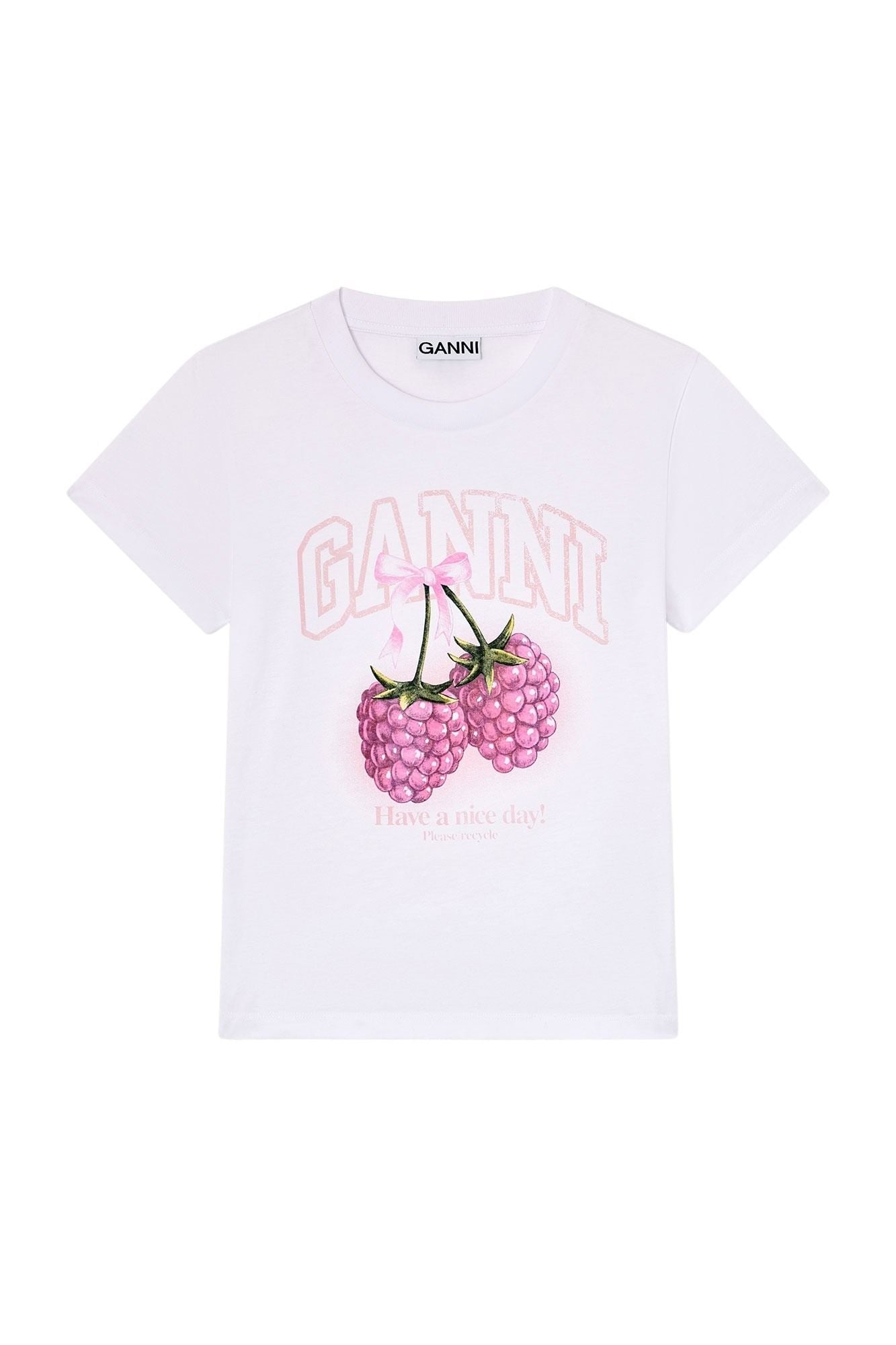 T-skjorte til dame fra Ganni. En fresh og feminin baby tee i myk bomullsjersey med rett passform. Den har klassisk rund hals og et lekent GANNI-print med bringebærmotiv som gir antrekket en søt, trendy twist. Perfekt til jeans, skjørt eller under en blazer for en effortless hverdagslook.