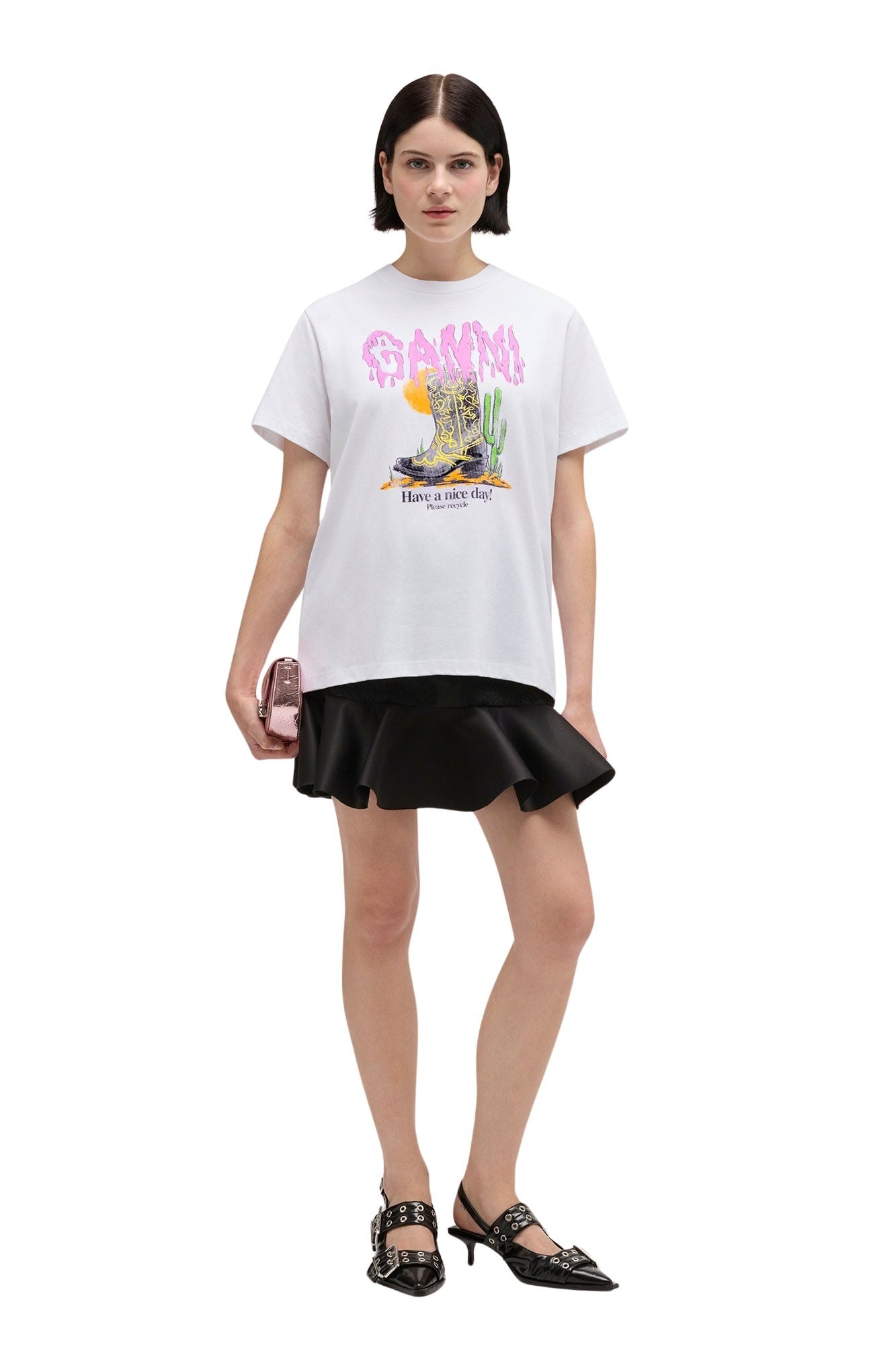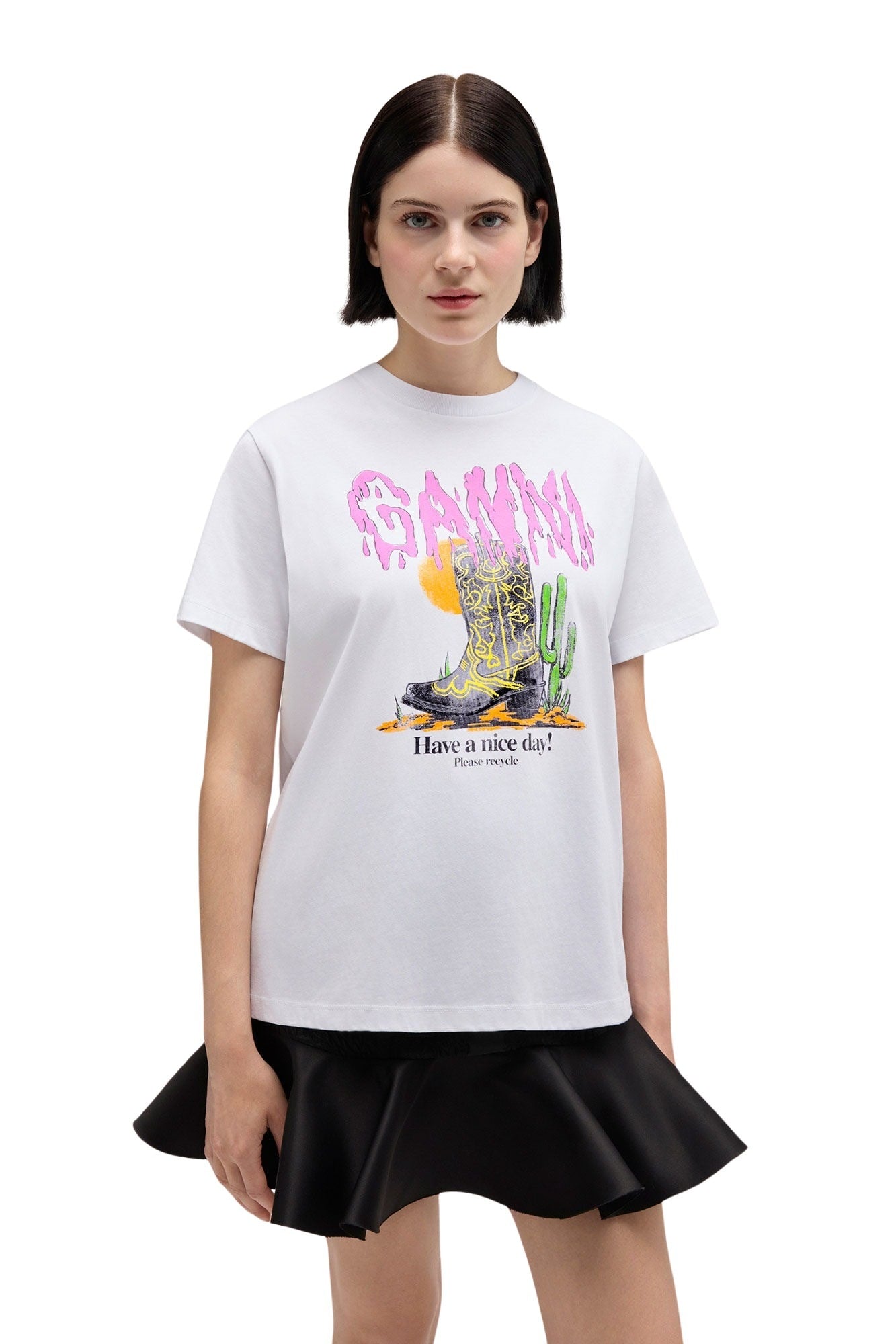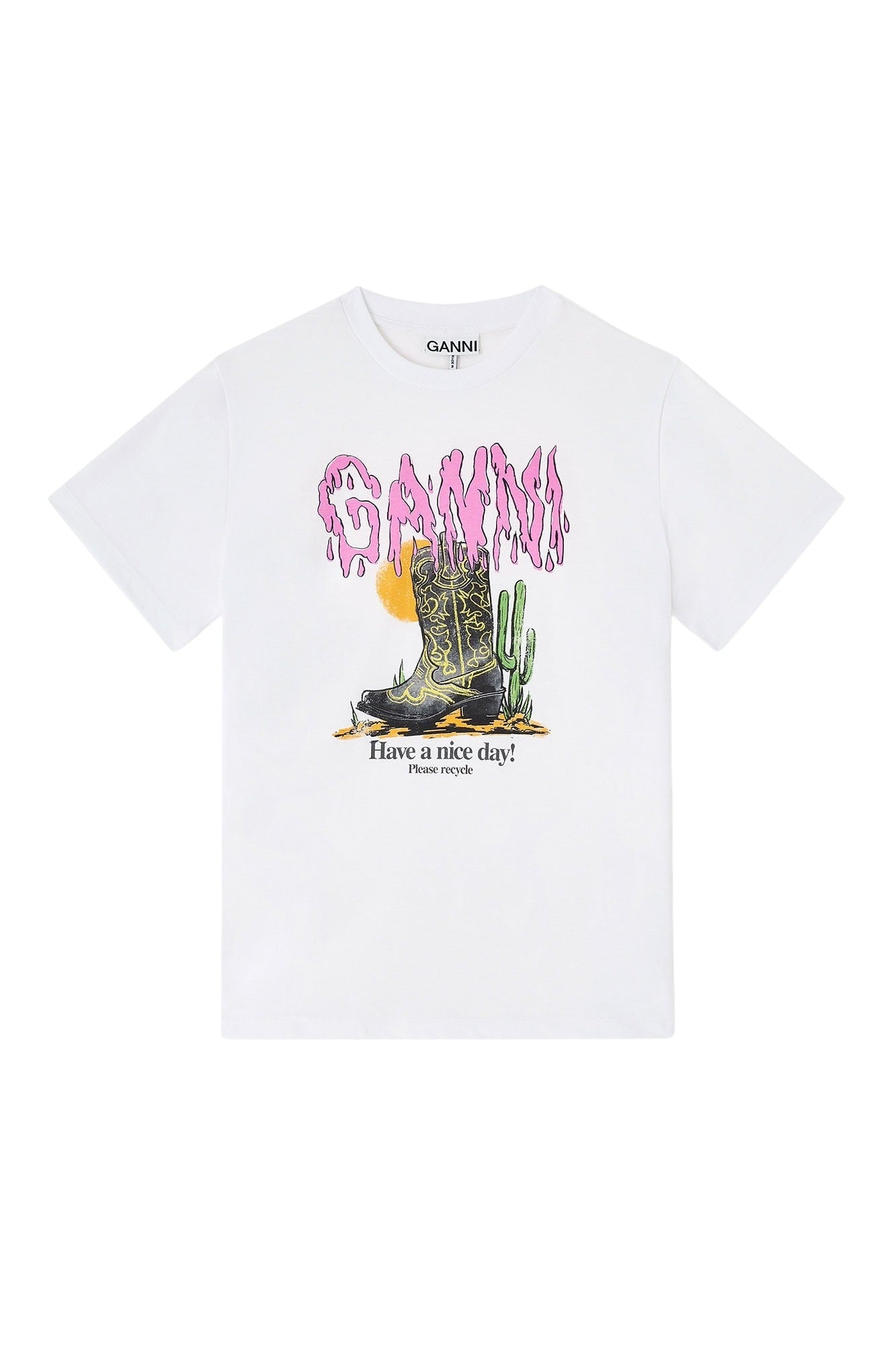 T-skjorte til dame fra GANNI. En myk og komfortabel t-skjorte i 100% bomullsjersey, med et fargerikt og lekent GANNI-print. Klassisk passform gjør den enkel å style til både jeans, shorts og skjørt, mens cowboyboot-motivet tilfører en kul, grafisk edge.