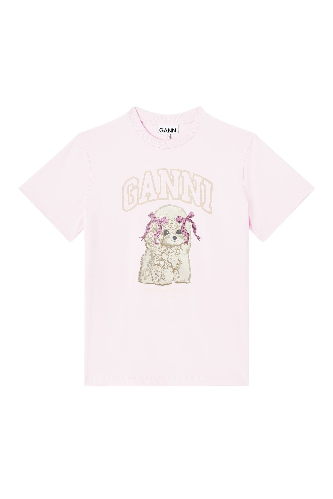 T-skjorte til dame fra GANNI. En supermyk og komfortabel t-skjorte i 100% bomullsjersey, med et søtt og lekent GANNI-print. Klassisk passform gjør den enkel å style til både jeans, shorts og skjørt, mens hundemotivet og pastellfargen tilfører masse personlighet.