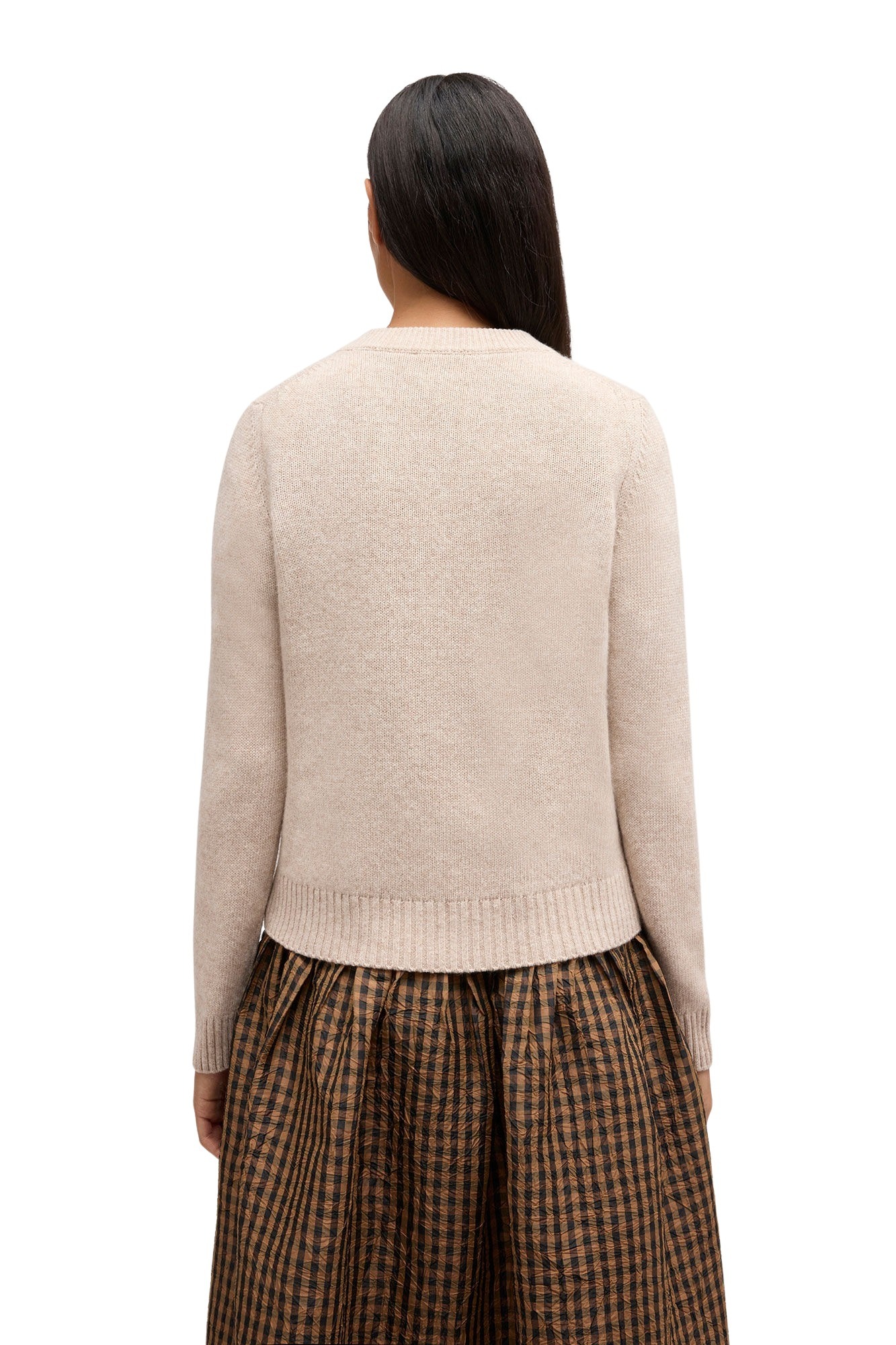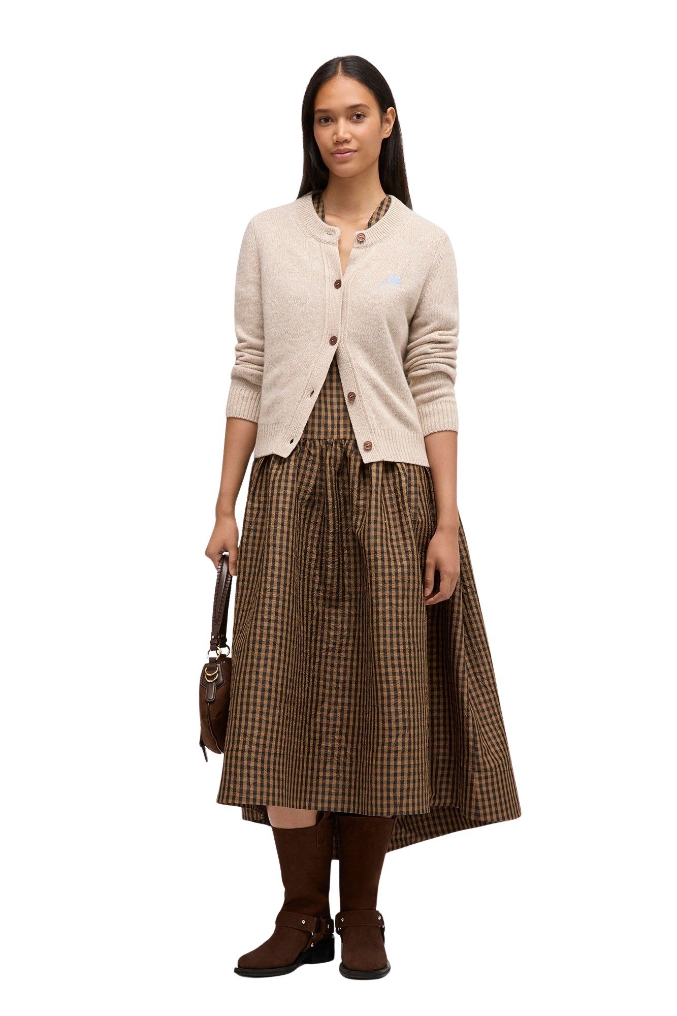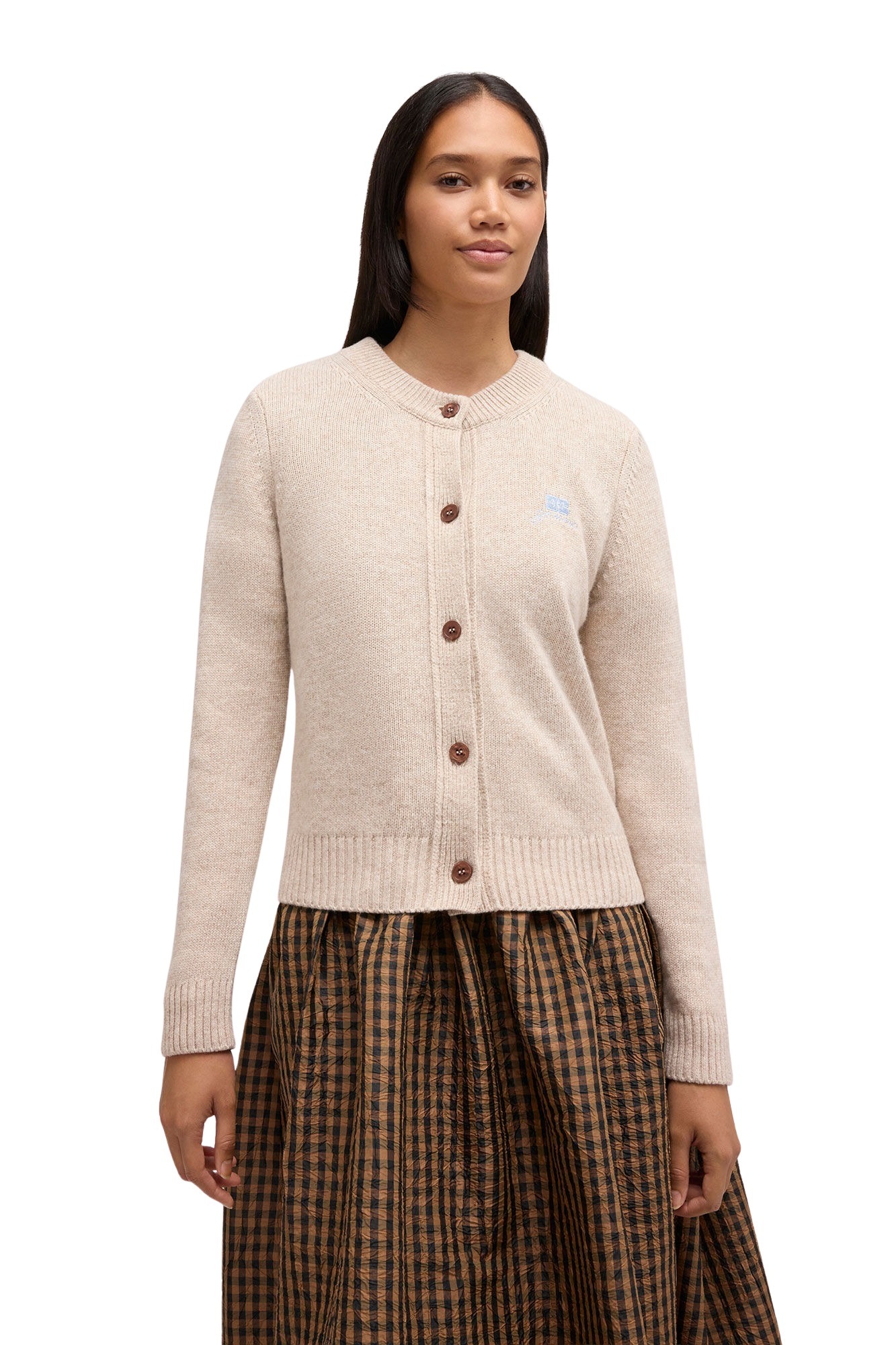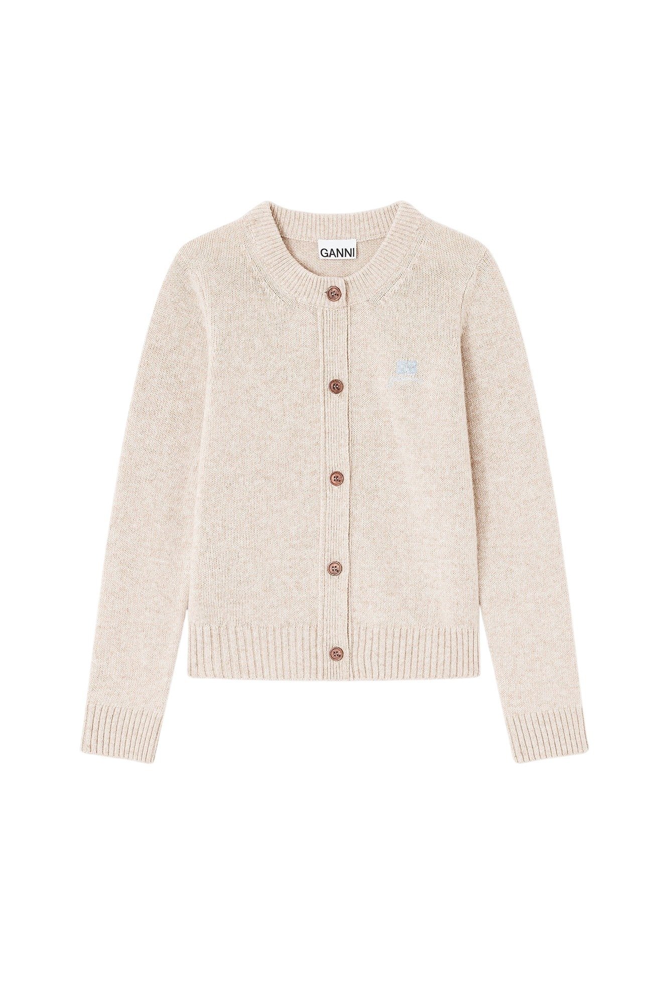 Cardigan til dame fra Ganni. En tidløs og allsidig cardigan i myk ullblanding. Den har klassisk rund hals, ribbestrikkede kanter og fine knapper i front. Den nøytrale beige tonen gjør den enkel å style både til jeans, skjørt og over kjoler. Perfekt for lag-på-lag hele året.