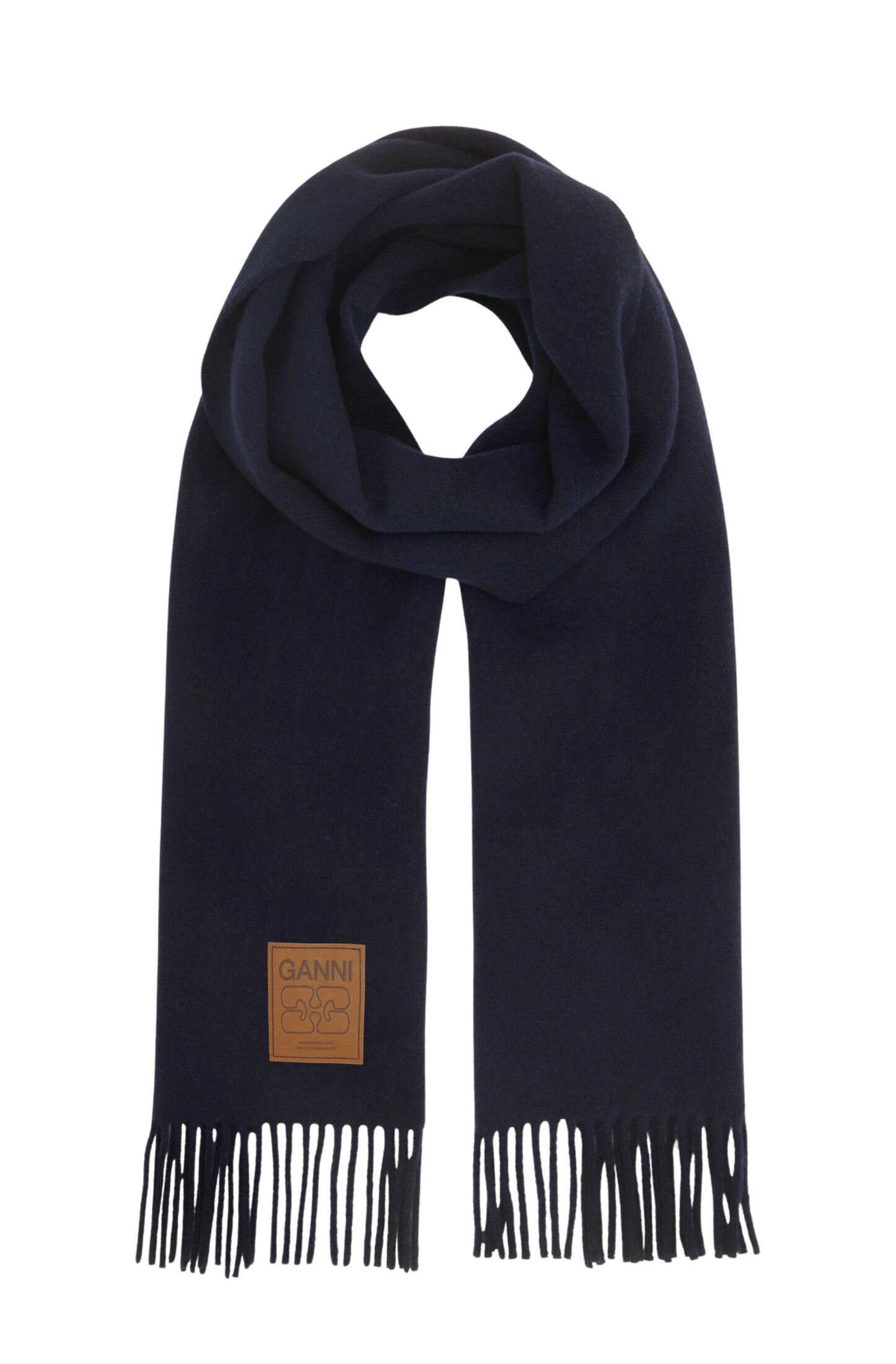 Ullskjerf til dame fra GANNI i ull med frynsete kanter og påsydd GANNI-logo. Et tidløst og varmt tilbehør som løfter både yttertøy og hverdagsantrekk.