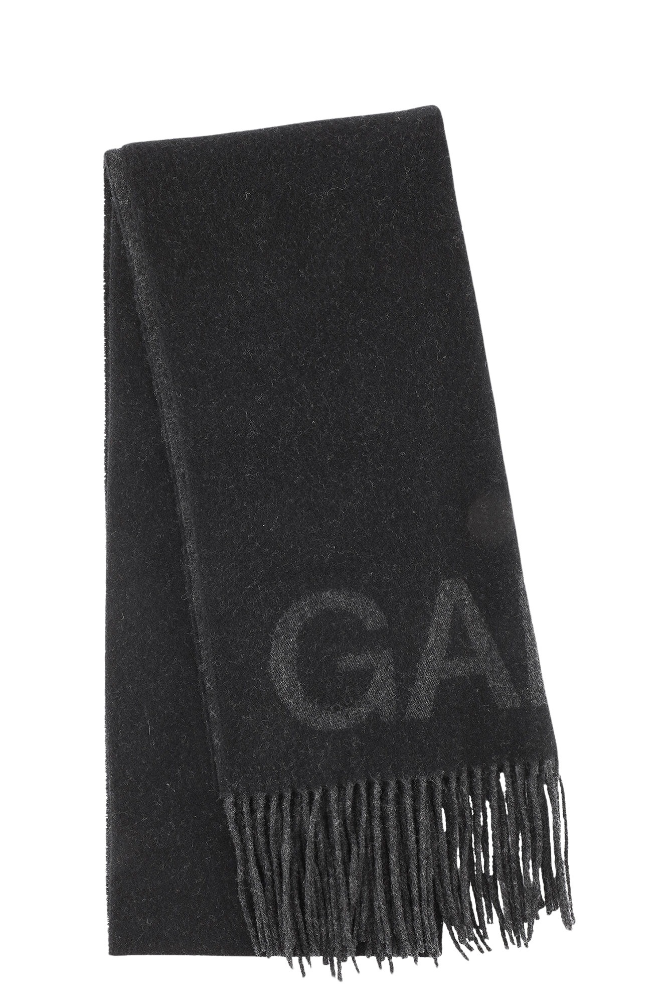 Skjerf til dame fra GANNI i resirkulert, varmende ull. Skjerfet er prydet med frynsete kanter og GANNI-logo.