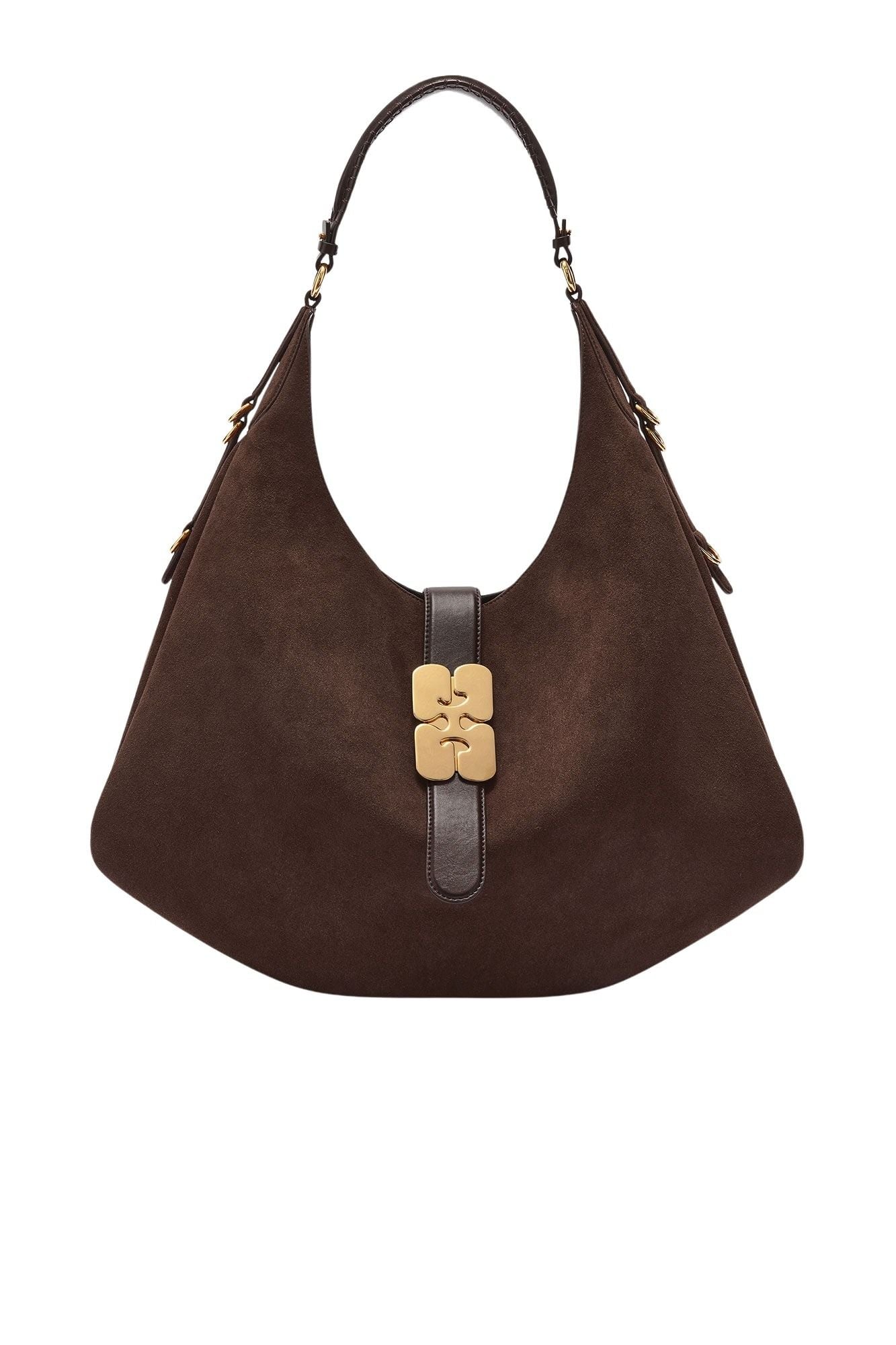 Veske fra GANNI. En elegant og romslig skulderveske i myk resirkulert semsket skinnkvalitet med eksklusivt preg. Den buede silhuetten og den ikoniske gullfargede GANNI butterfly-logoen gir et sofistikert uttrykk, mens den brede skulderreimen sikrer komfort hele dagen. Perfekt til både jobb og hverdagsbruk når du trenger god plass.