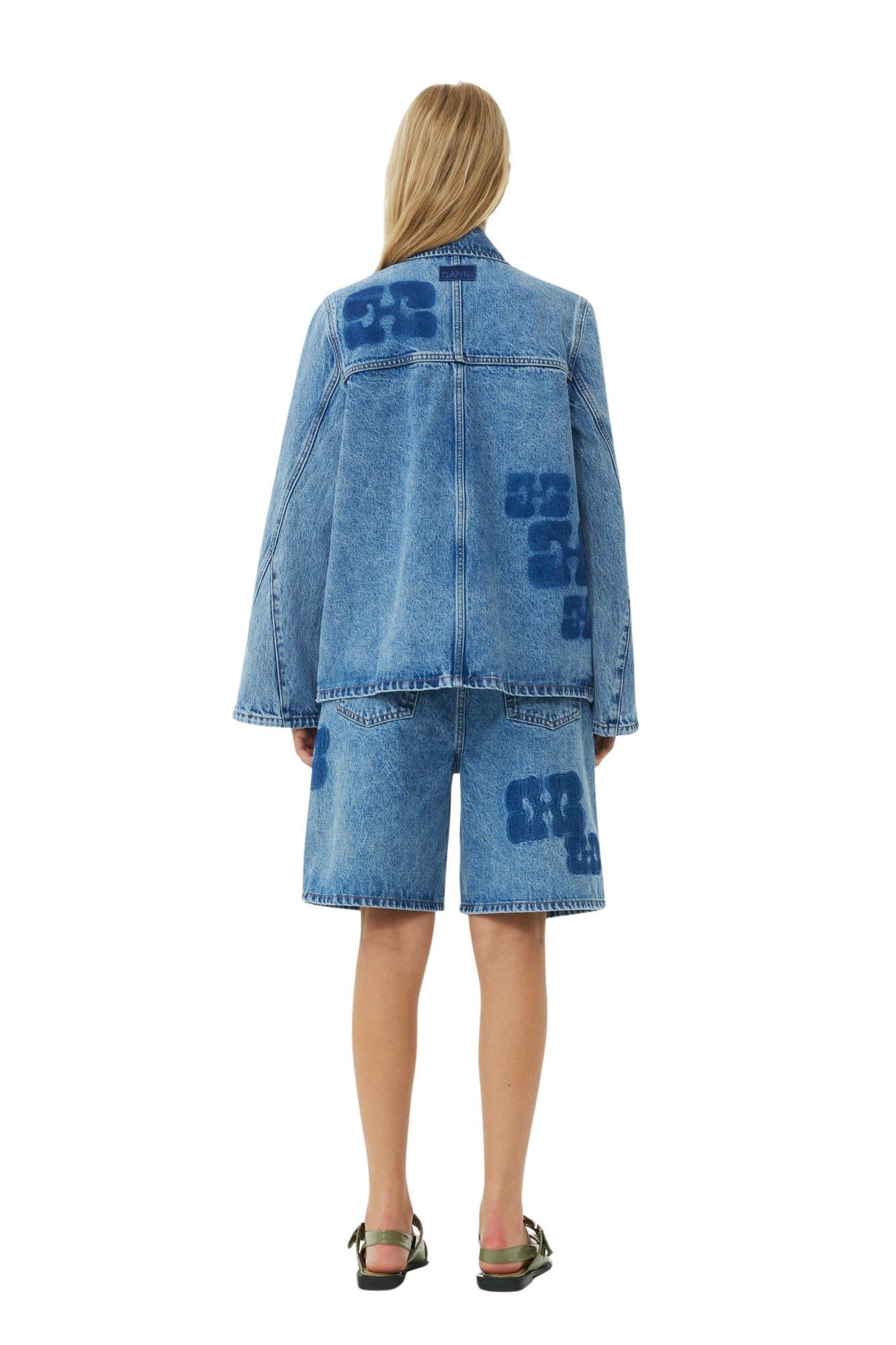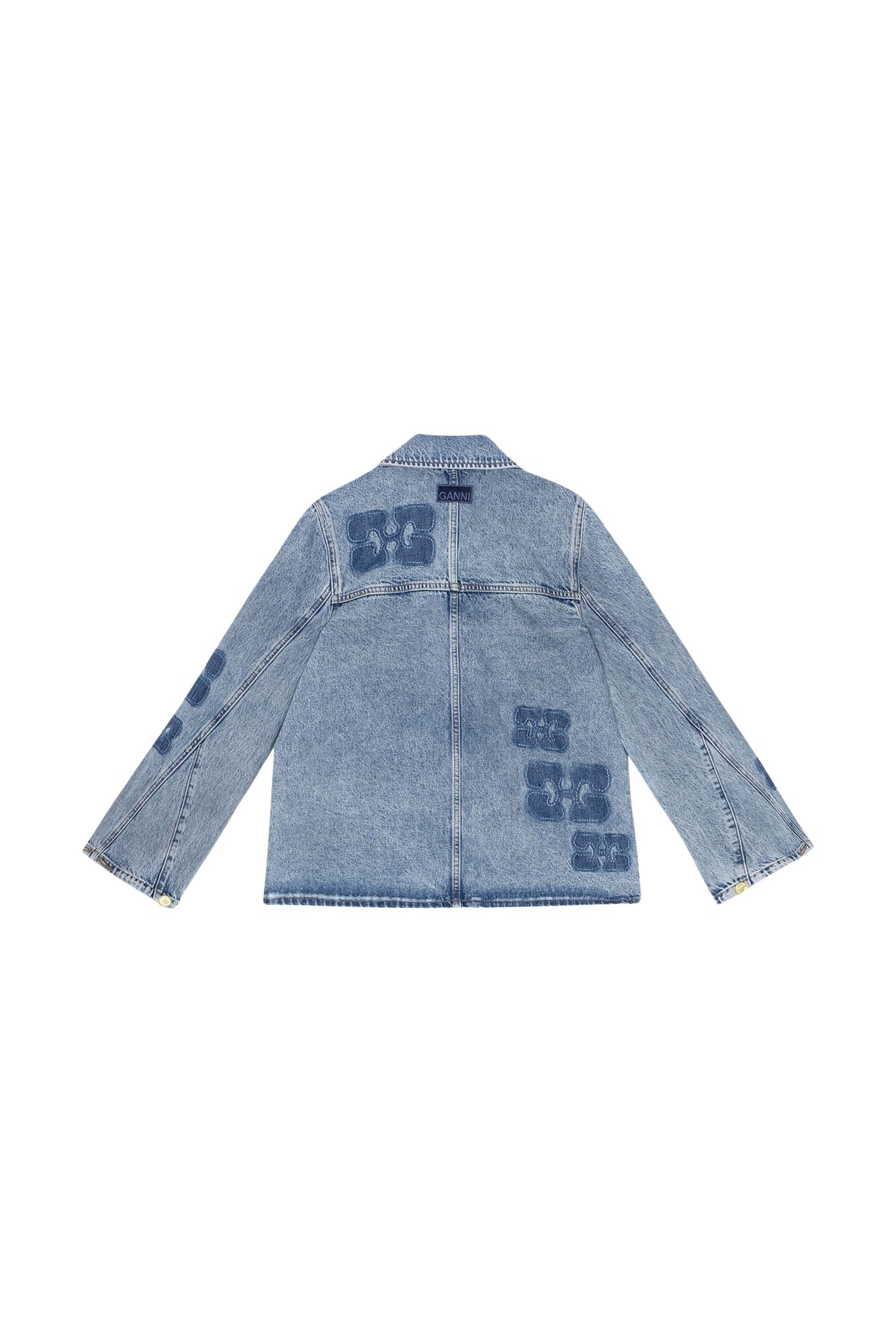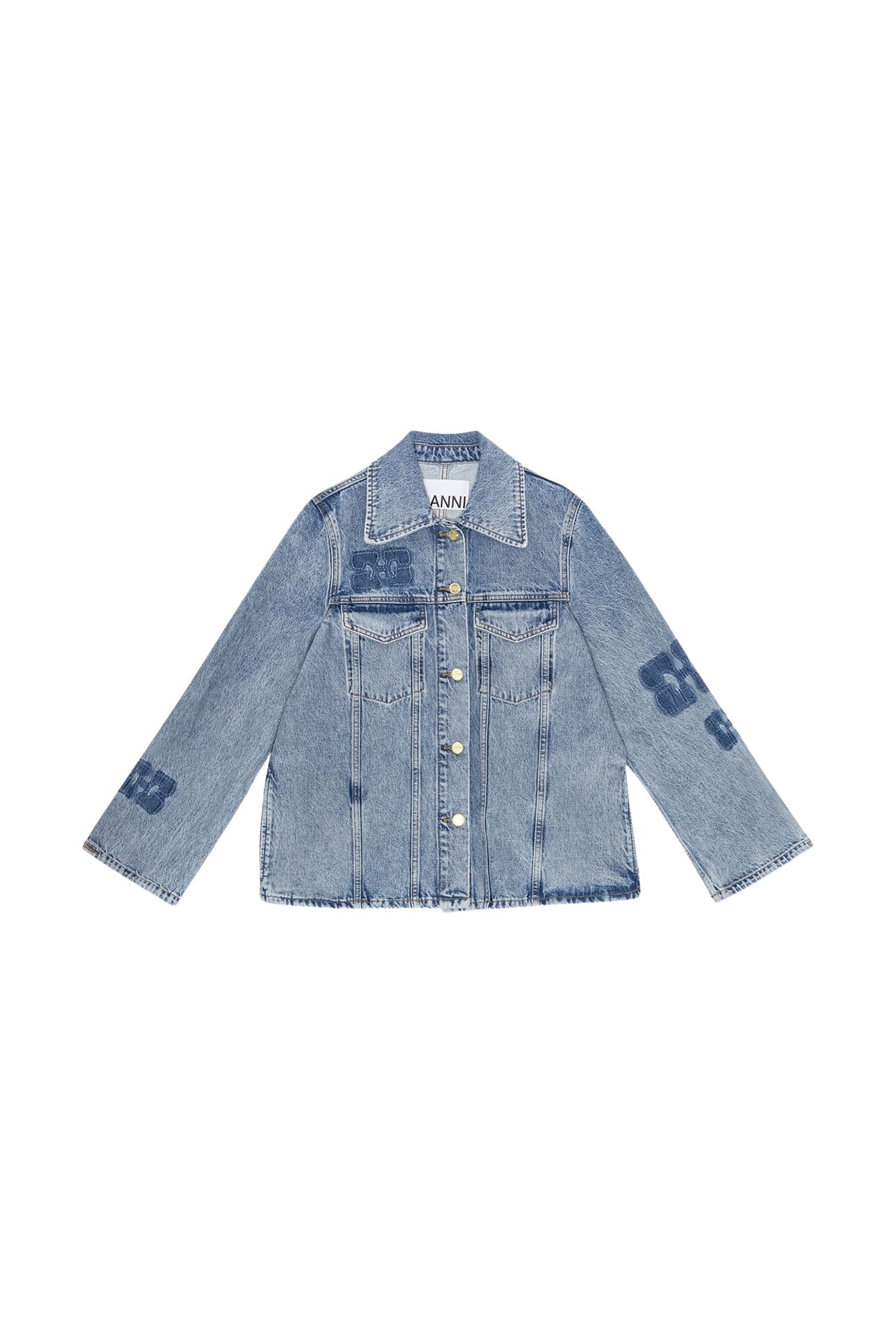 Denimjakke fra GANNI med en avslappet, vid passform. Jakken har klassiske denimdetaljer og er prydet med deres ikoniske logo patcher over hele.
