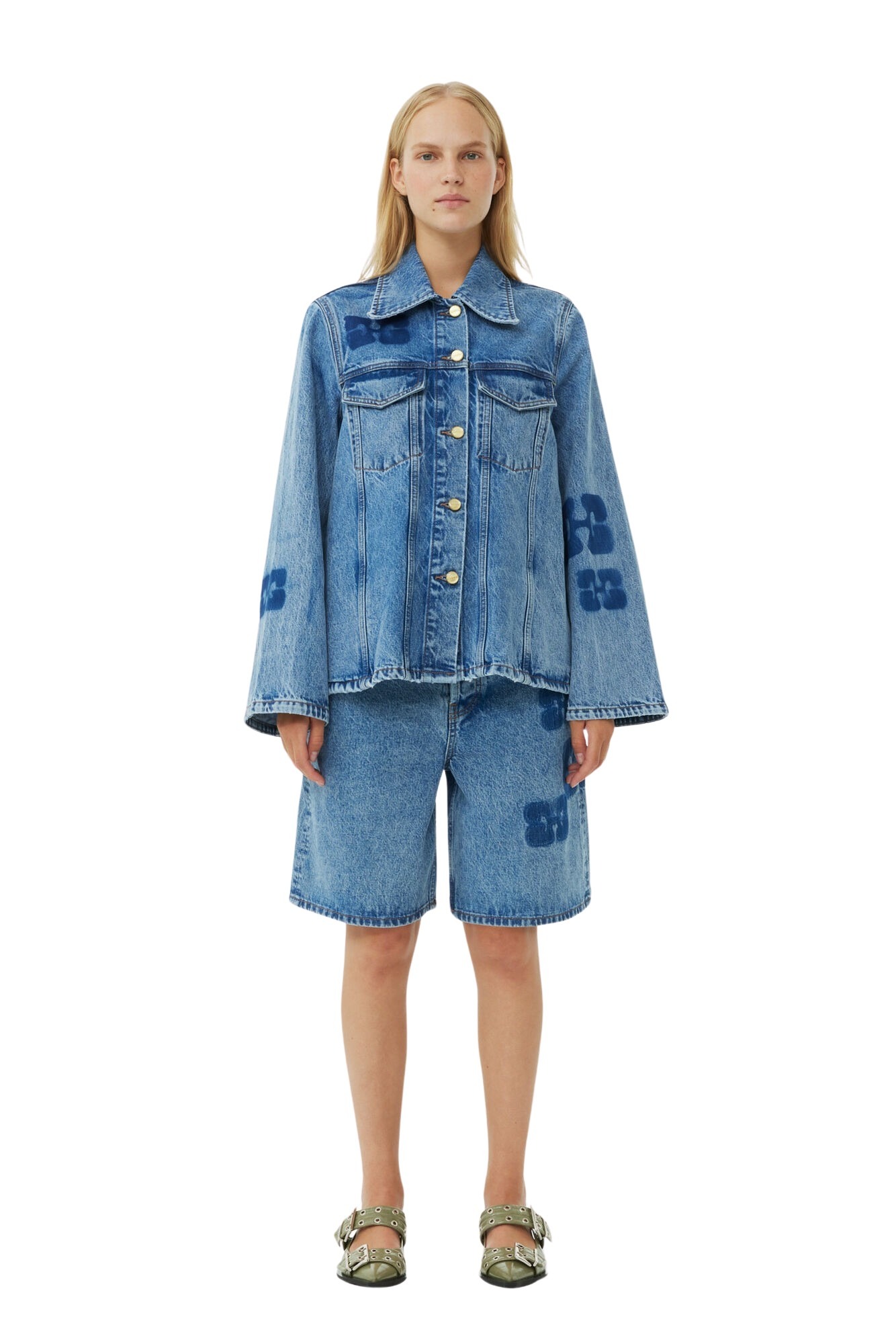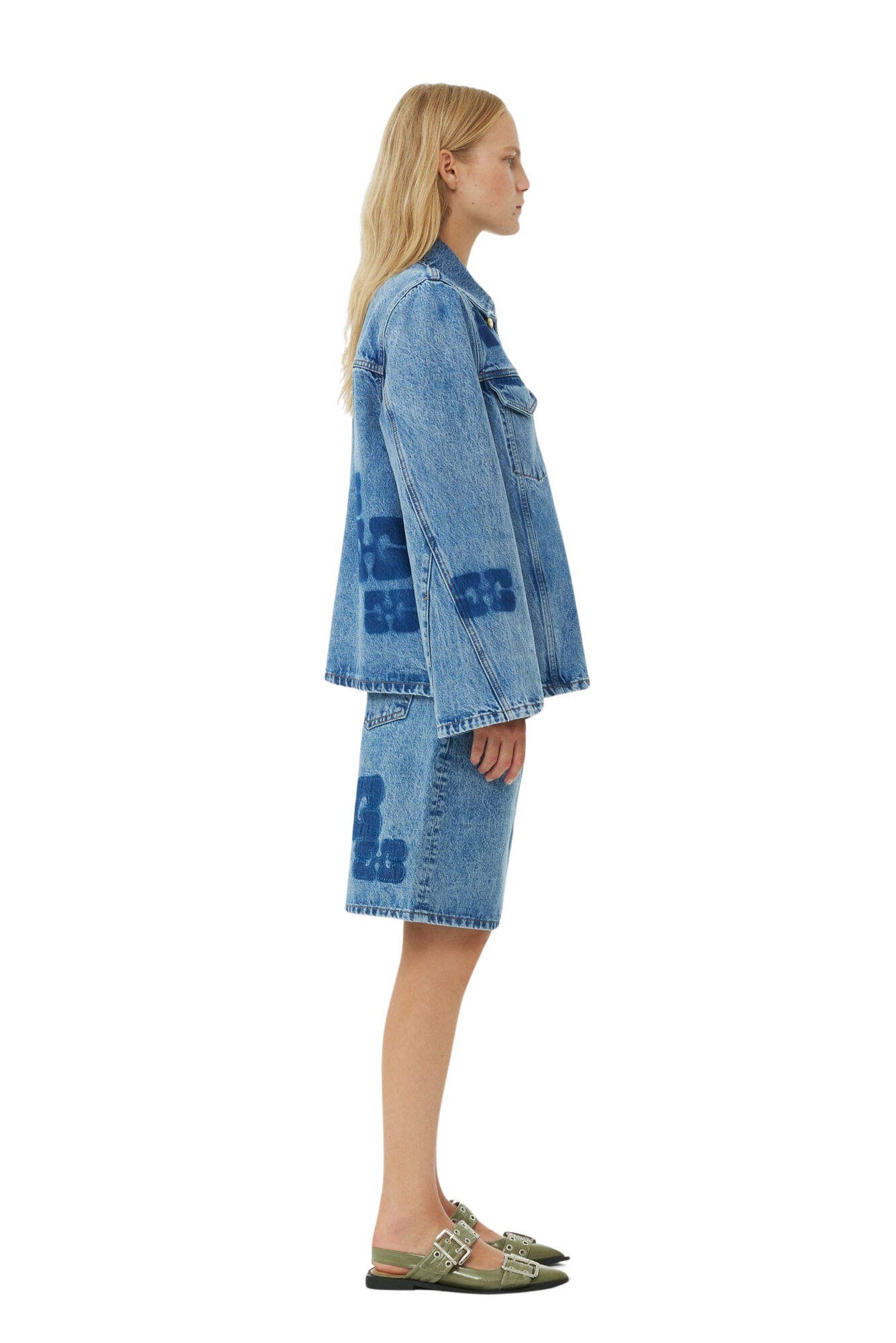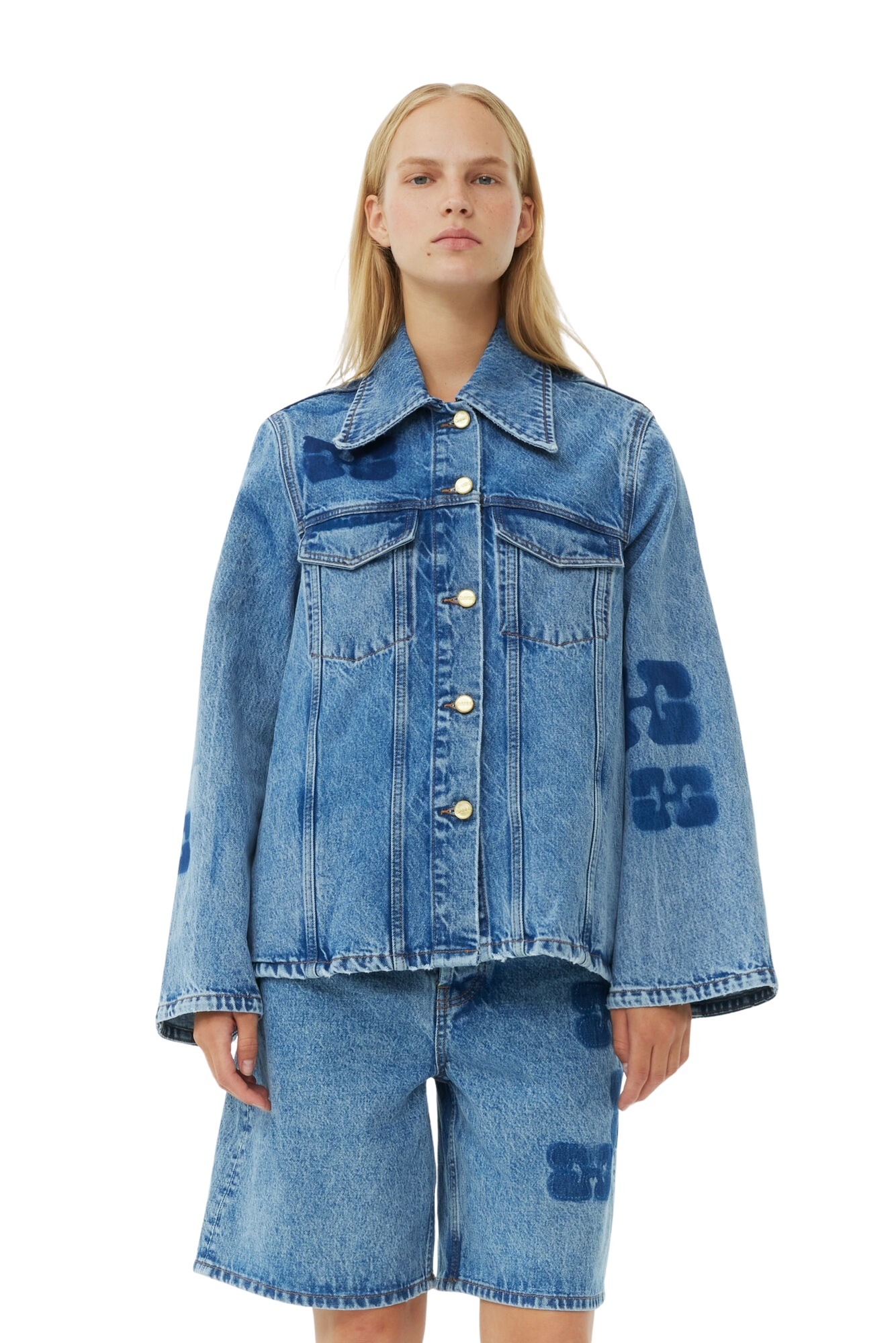 Denimjakke fra GANNI med en avslappet, vid passform. Jakken har klassiske denimdetaljer og er prydet med deres ikoniske logo patcher over hele.