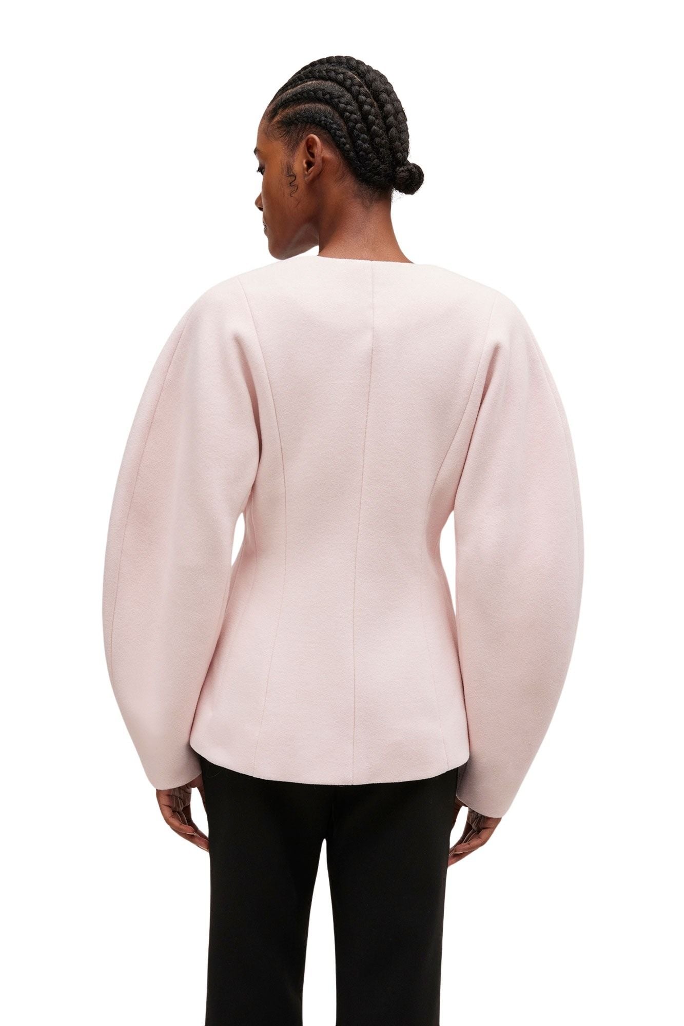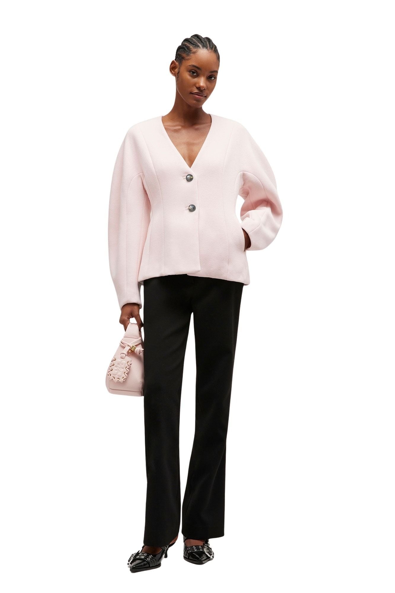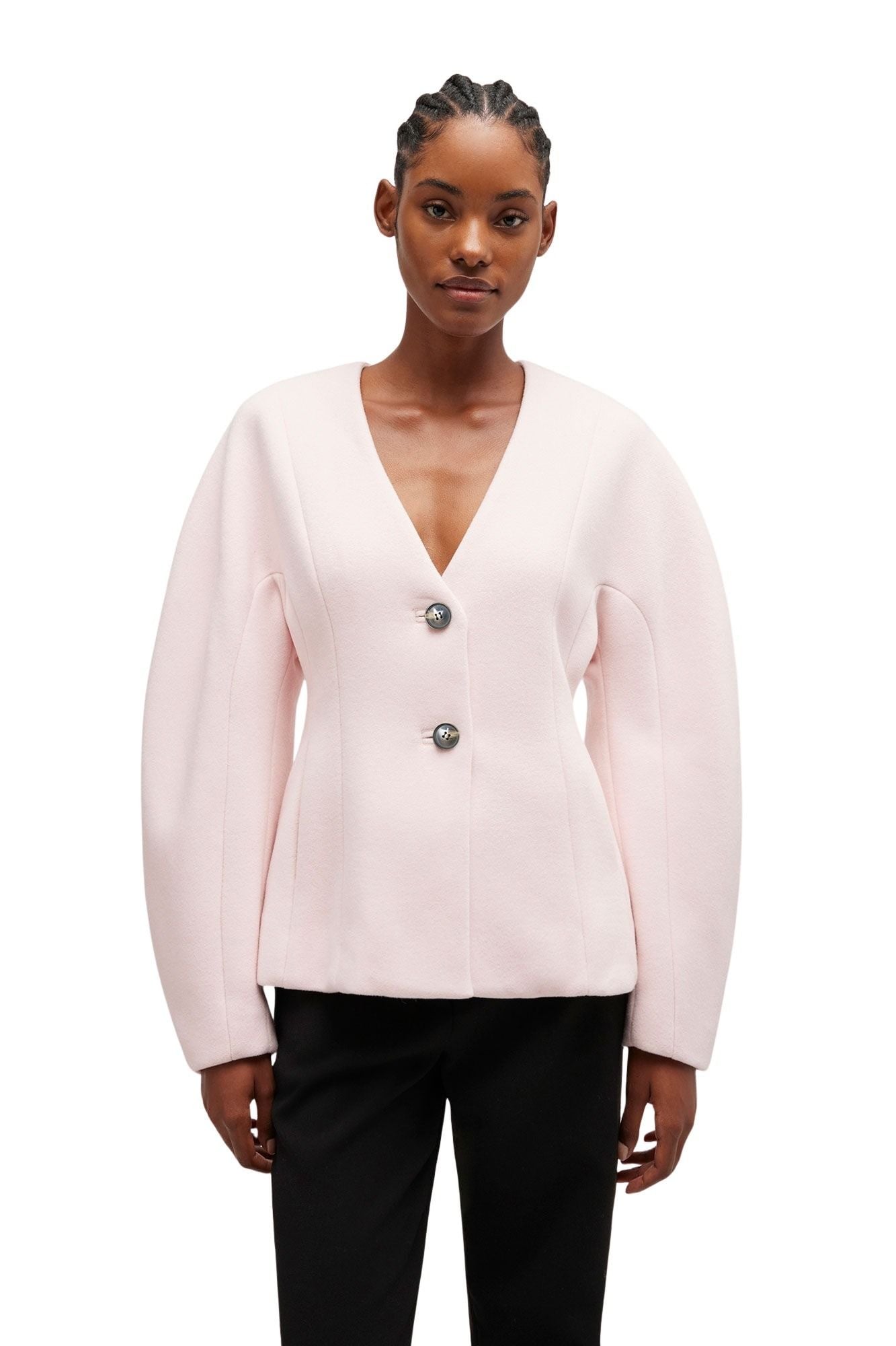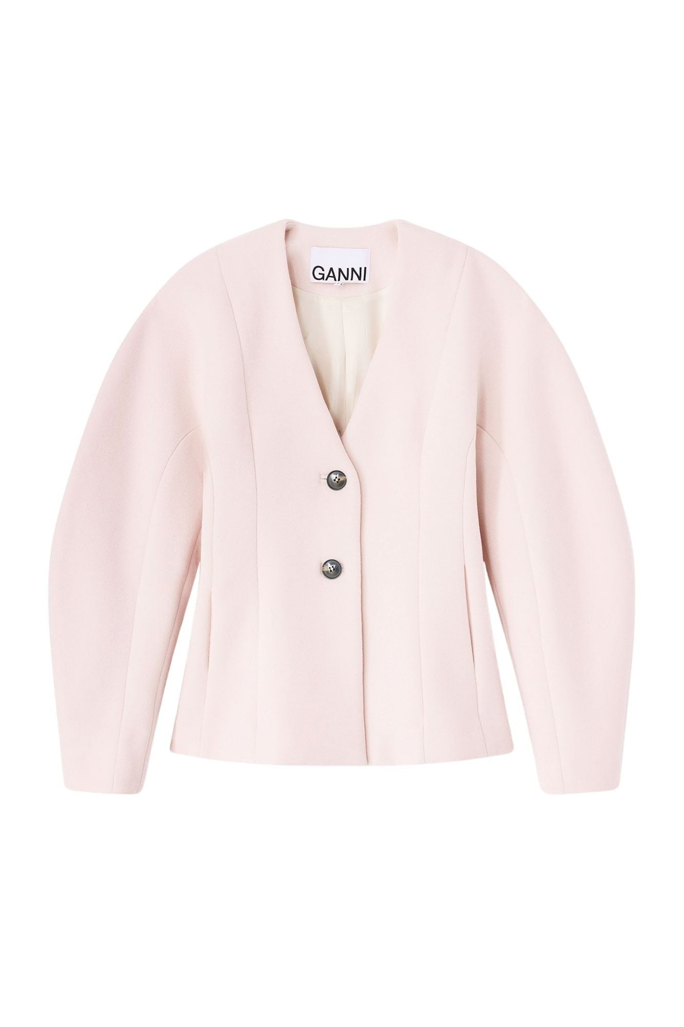 Blazer til dame fra Ganni. En elegant og skreddersydd blazer i myk ullblanding, designet med en feminin, innsvinget silhuett. De rene linjene, dype V-utringningen og de markerte knappene gir et moderne uttrykk, mens den lyse pastelltonen tilfører et sofistikert preg. Perfekt både til jobb, middag og festlige anledninger.