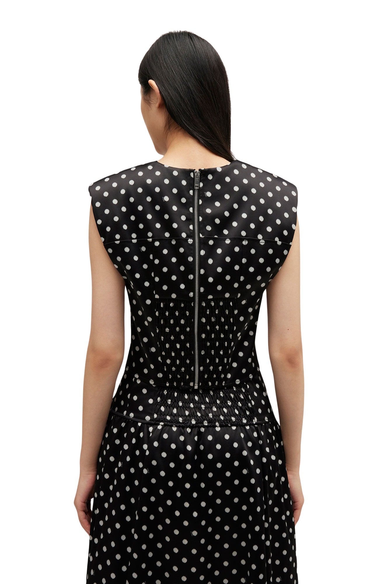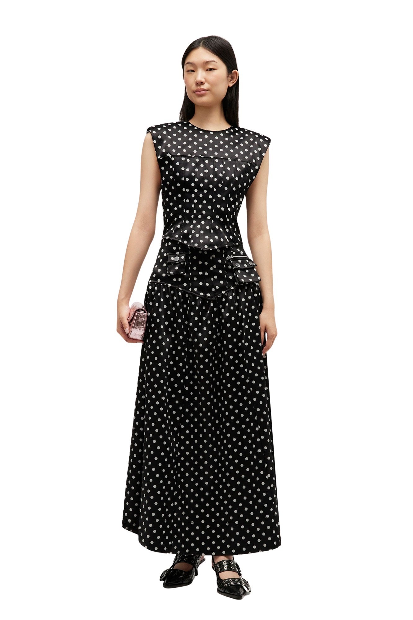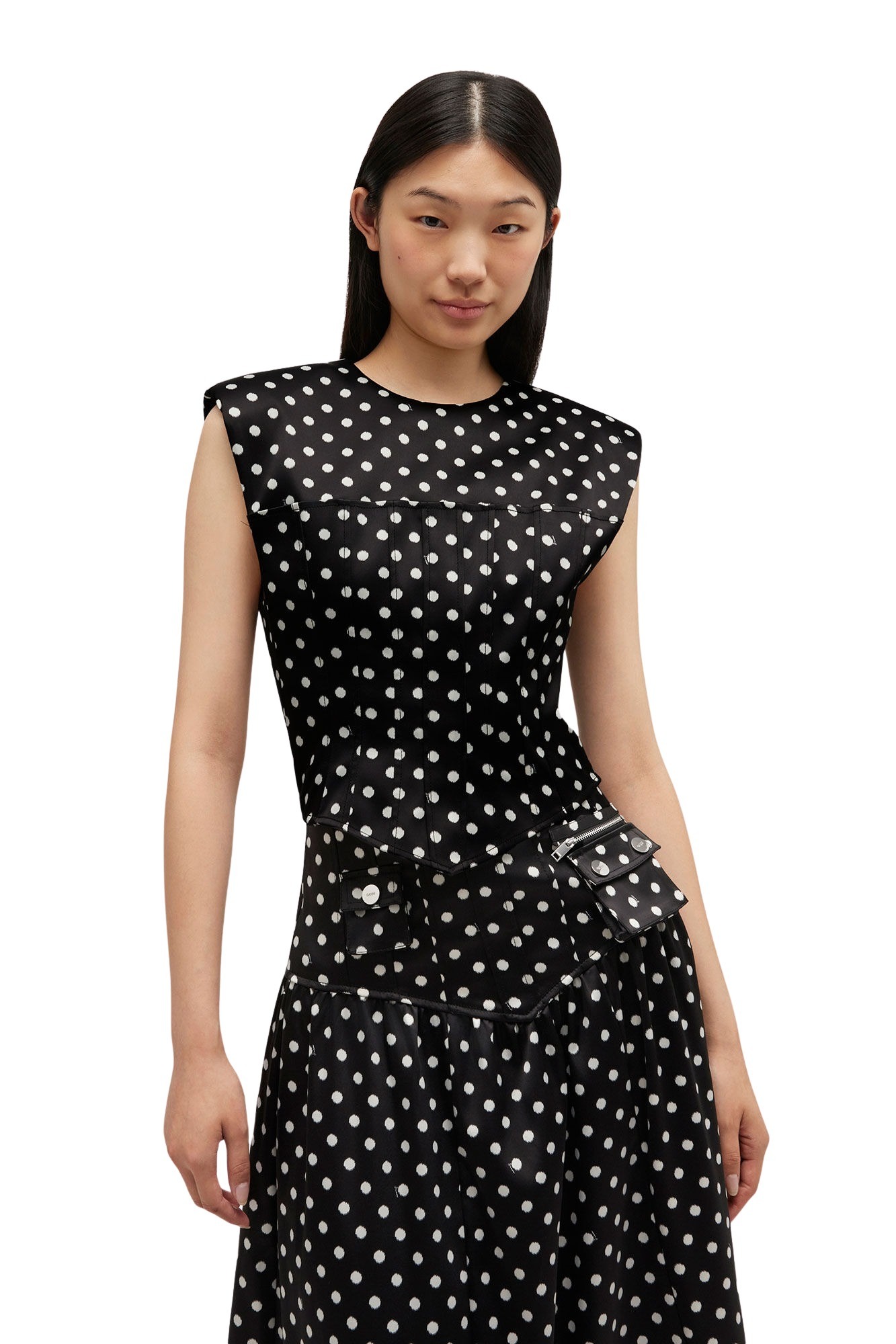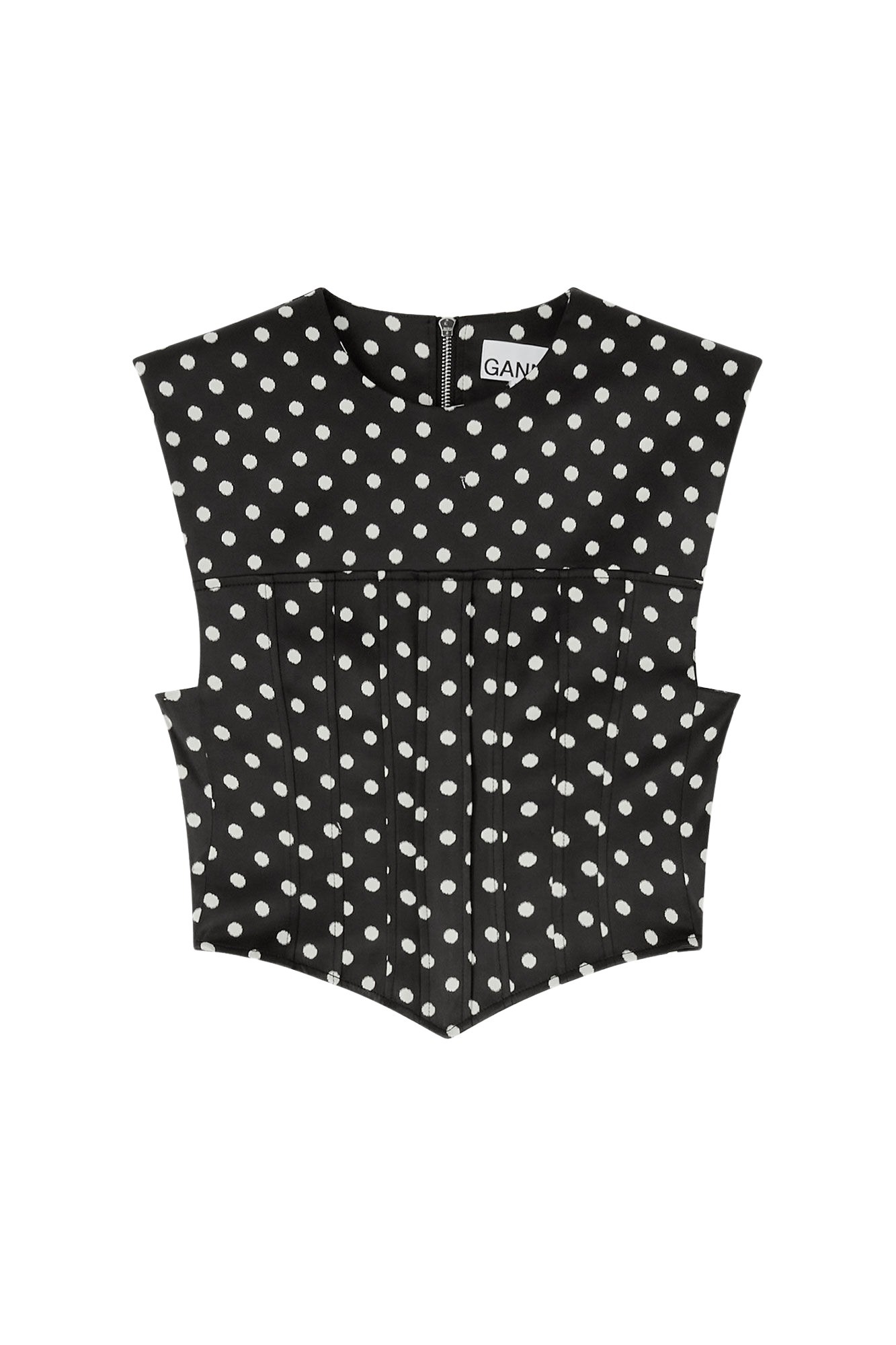 Topp til dame fra GANNI. En elegant og edgy korsettopp i blank double satin med klassisk polkaprint. Den strukturerte passformen og de markerte sømmene fremhever midjen og gir et moderne, figurnært uttrykk. Perfekt til både skjørt og bukser – og spesielt fin sammen med det matchende Printed Double Satin Corset Skirt.