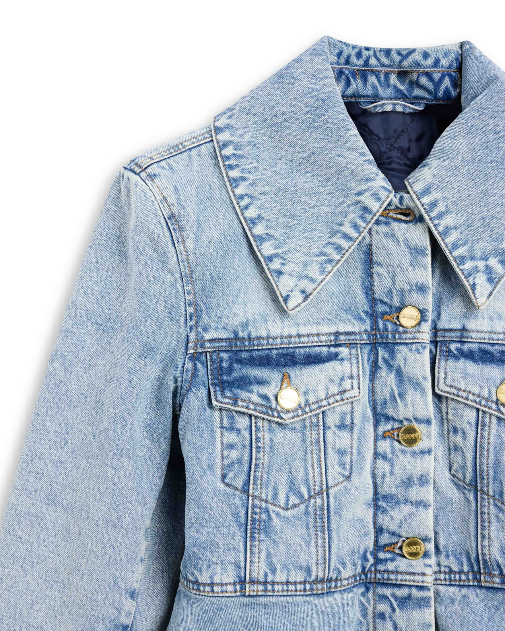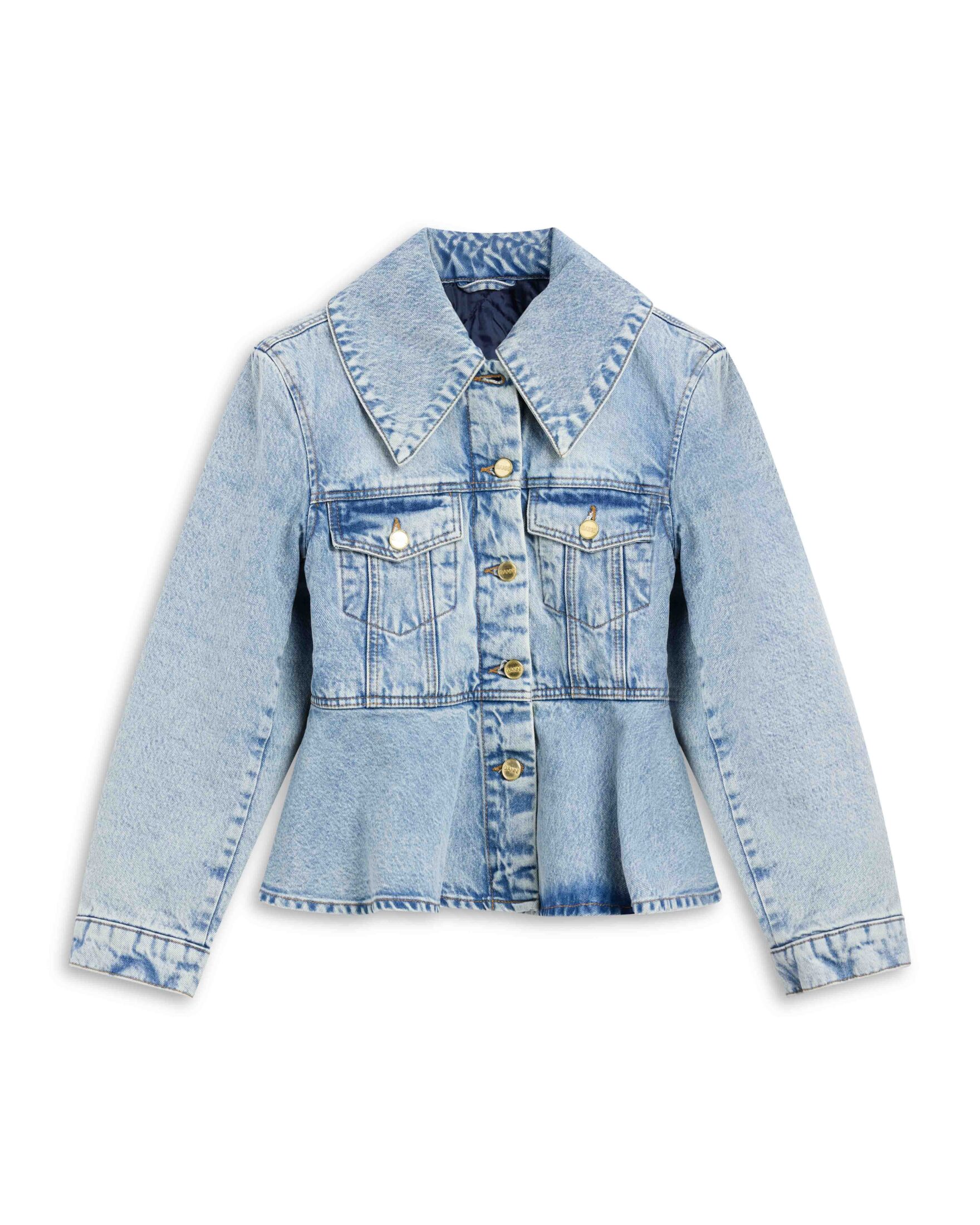 Rigid Denim Padded Peplum Jacket fra Ganni. En moderne denimjakke med markert peplum-fasong som fremhever midjen og gir en feminin silhuett. Den store kragen og gylne knappene tilfører et stilrent statement, mens den lett polstrede kvaliteten gir struktur og komfort. Perfekt som overgangsjakke, like fin til kjole som til en full denim-look.
