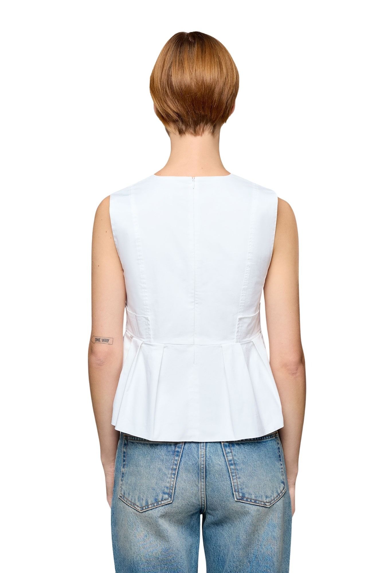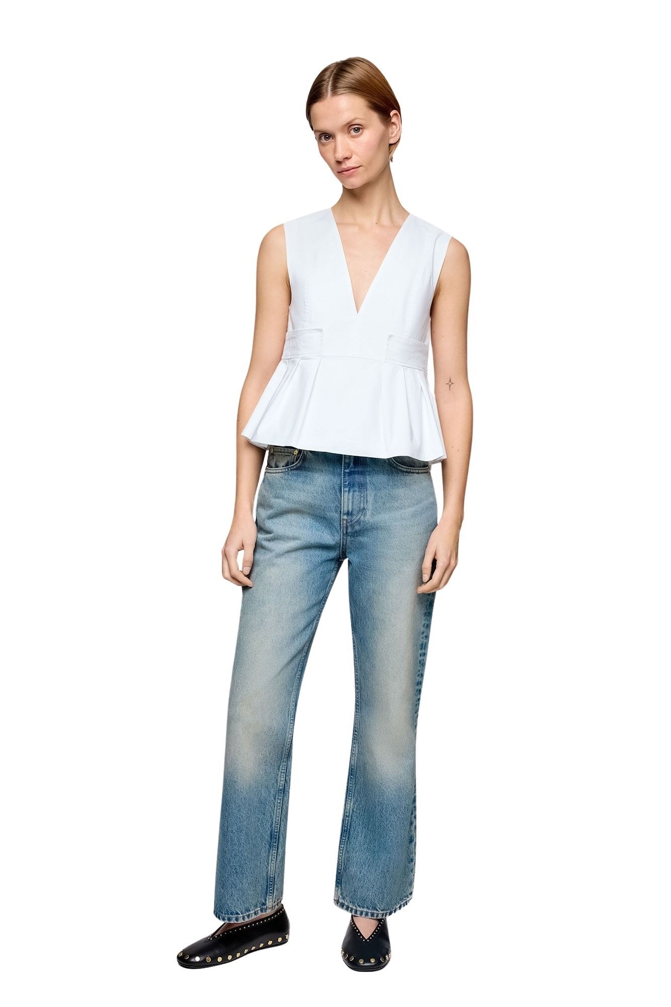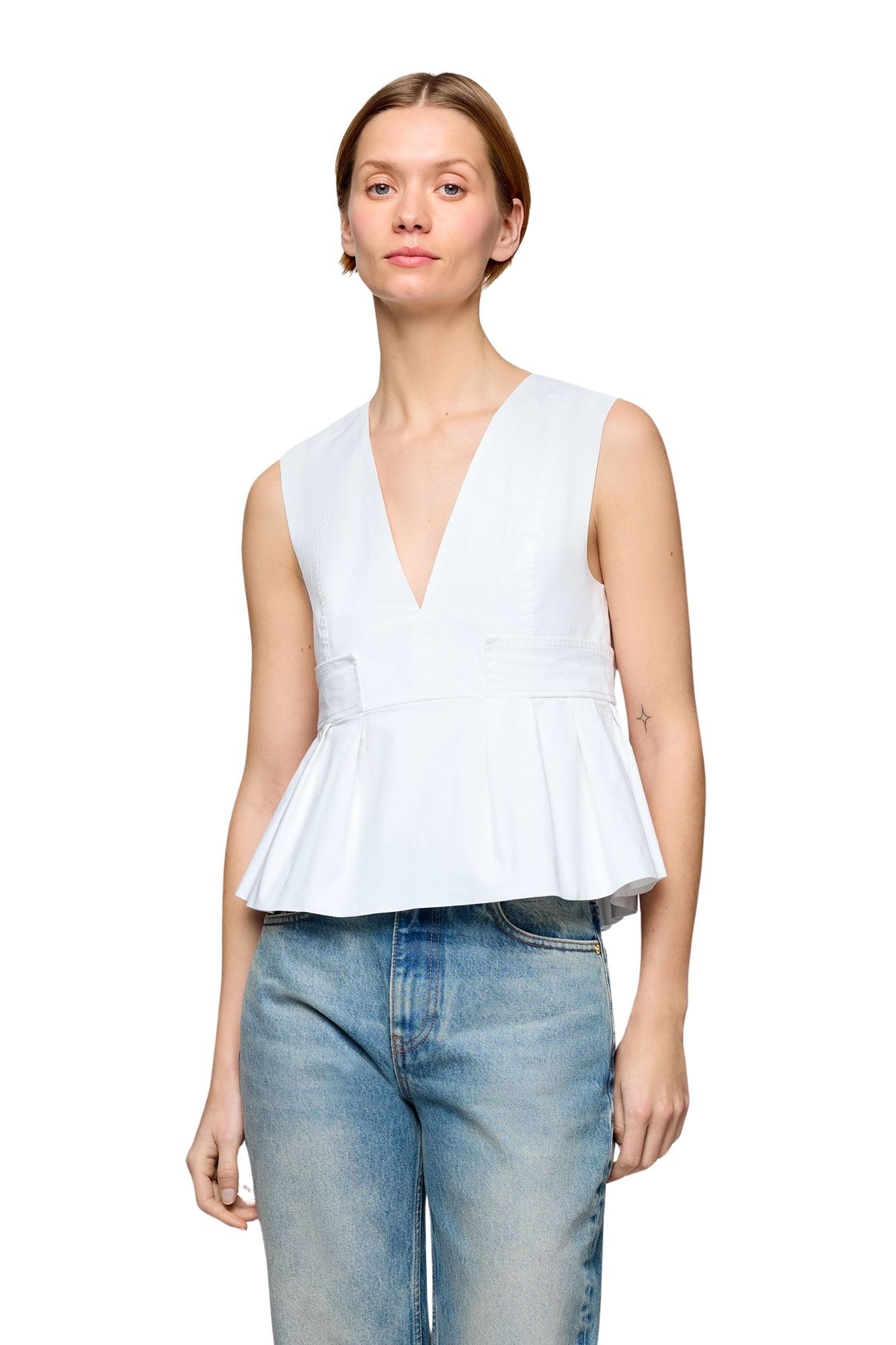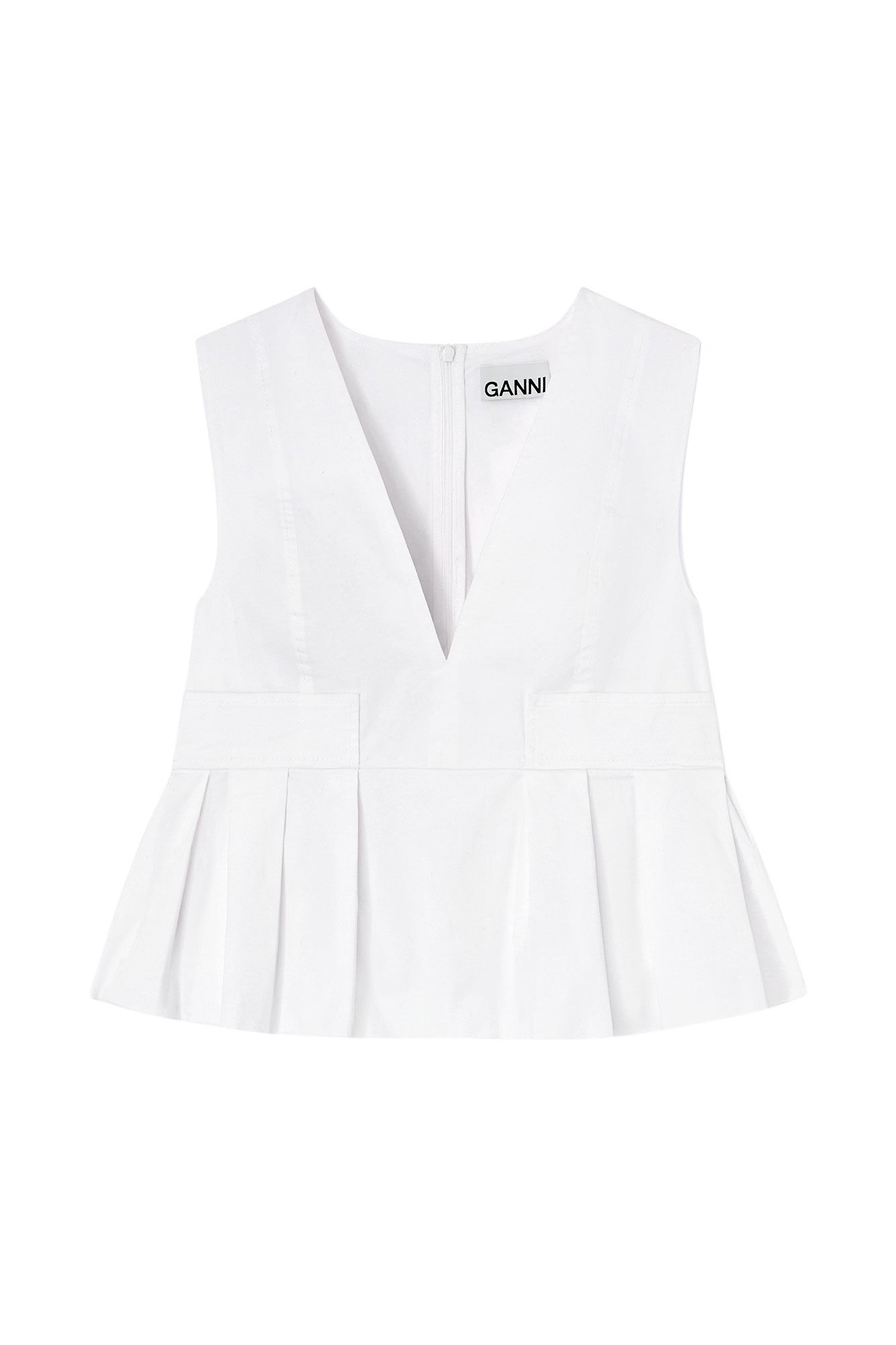 Topp til dame fra Ganni. En feminin topp med dyp V-hals og elegant, strukturert passform. Den plisserte kanten gir et flatterende og sofistikert uttrykk, mens glidelåsen bak sikrer en ren finish. Perfekt til både dressbukser og skjørt for en chic look.
