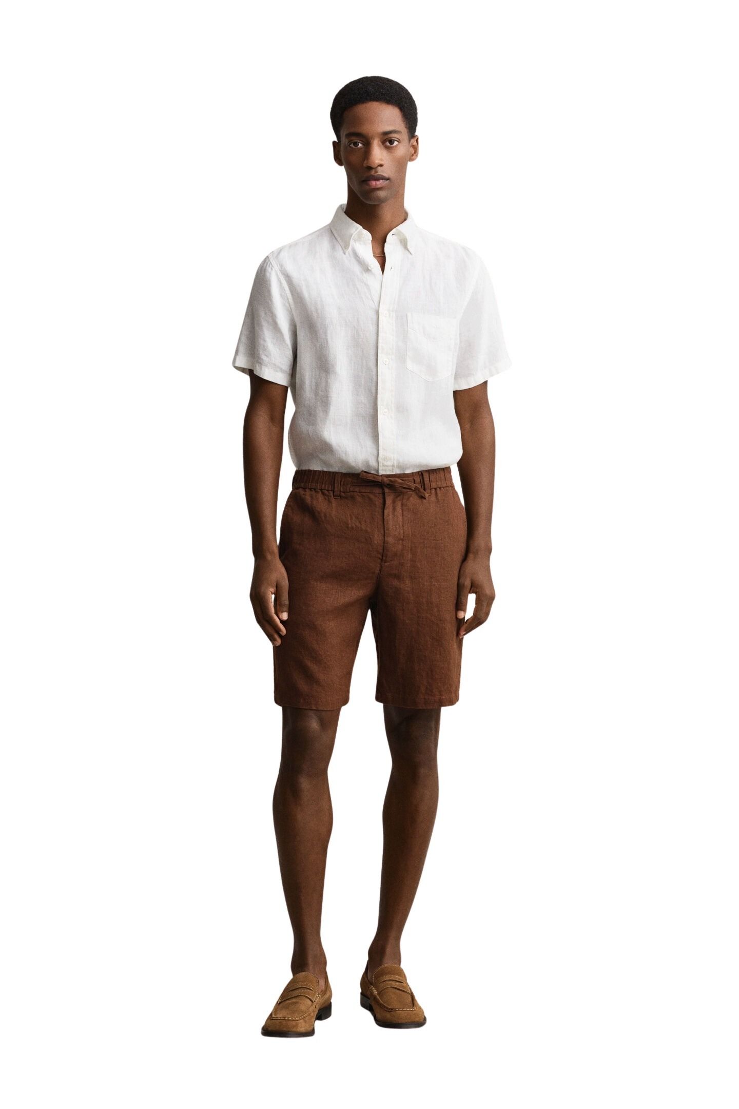 Linshorts til herre fra Gant. Lette sommershorts i lin som gir en sval og behagelig følelse. De har normal passform, elastisk liv med snøring og lengde til over kneet. Praktiske lommer og diskret logo gir et rent og avslappet uttrykk.
