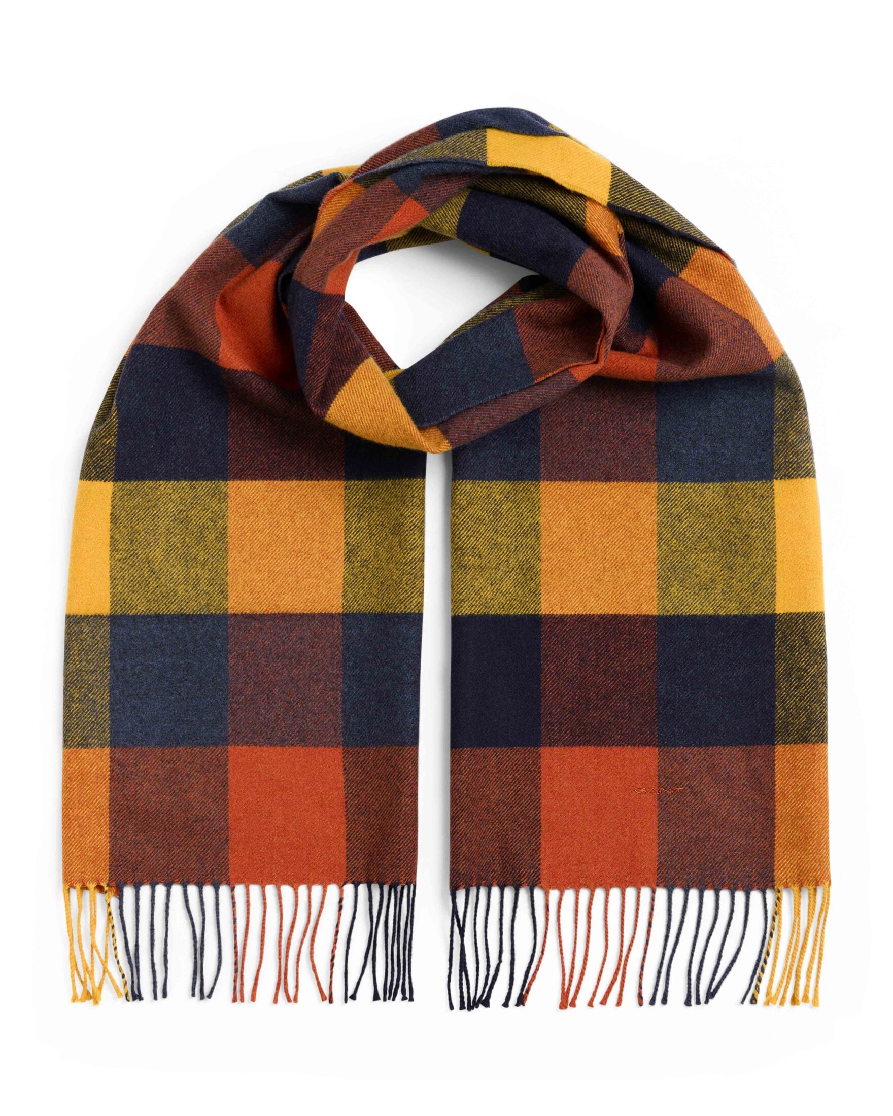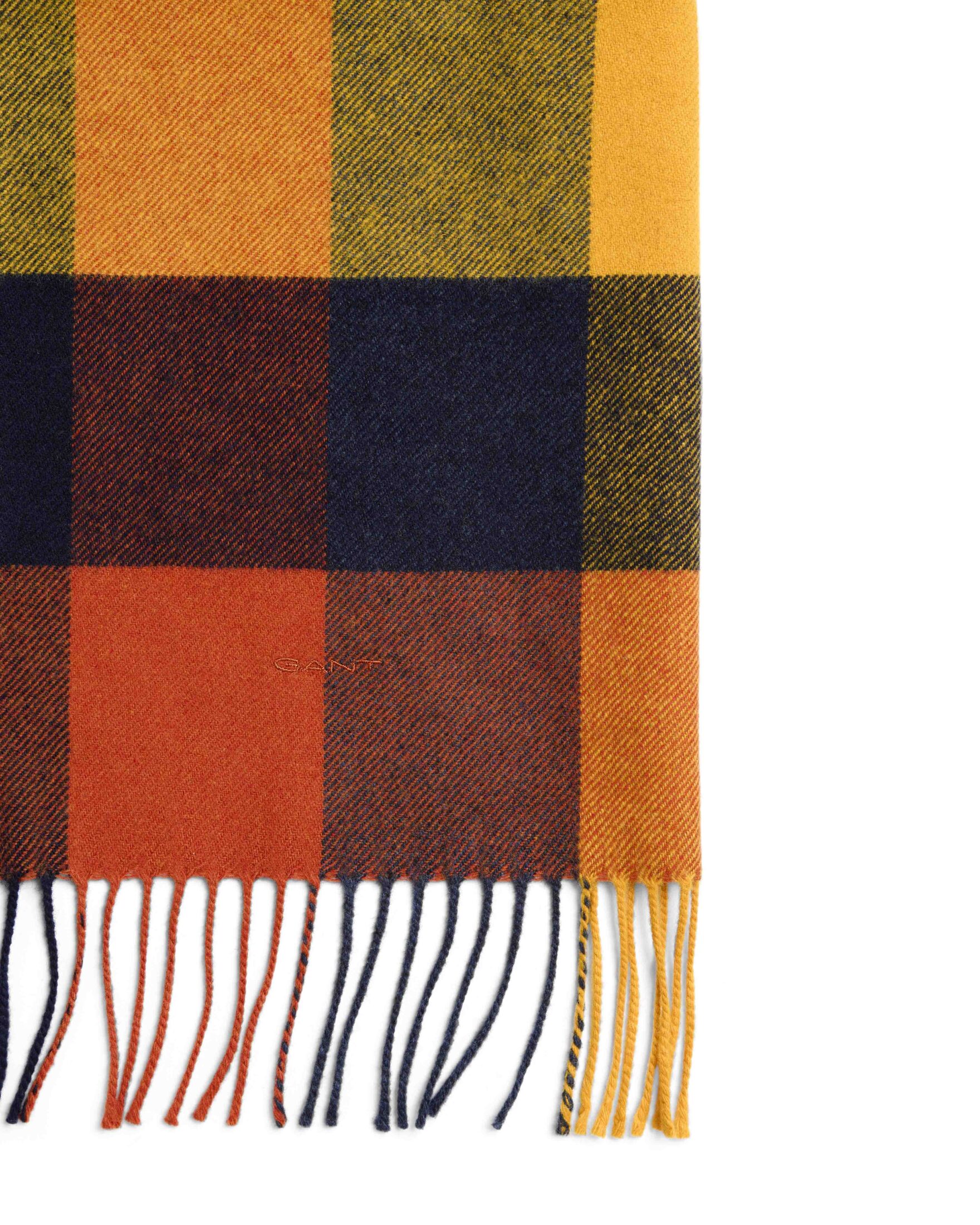 Skjerf til herre fra Gant. Laget av 100 % ull i et flerrutete design. Detaljert med frynser i begge ender og ton-i-ton Gant-broderi.