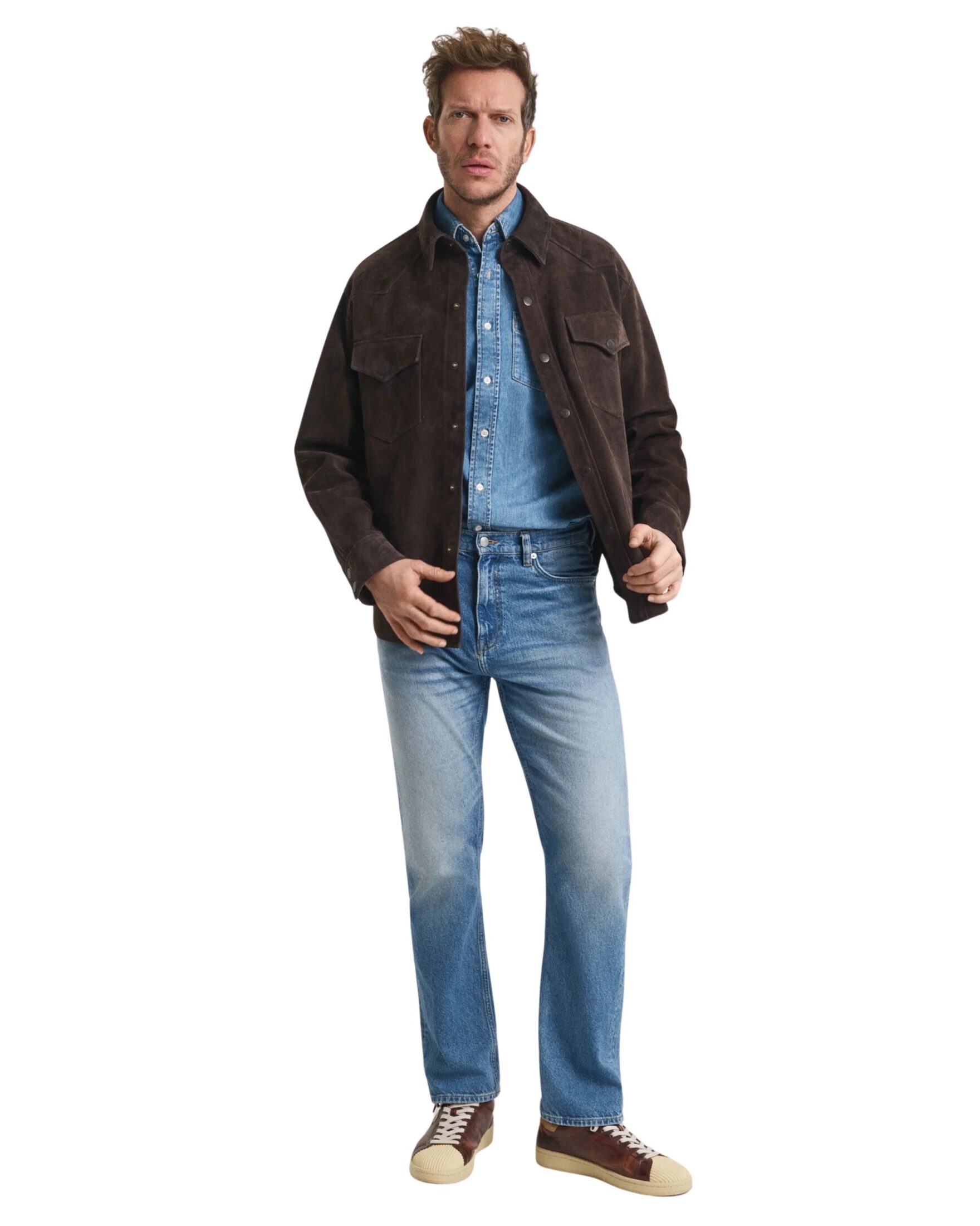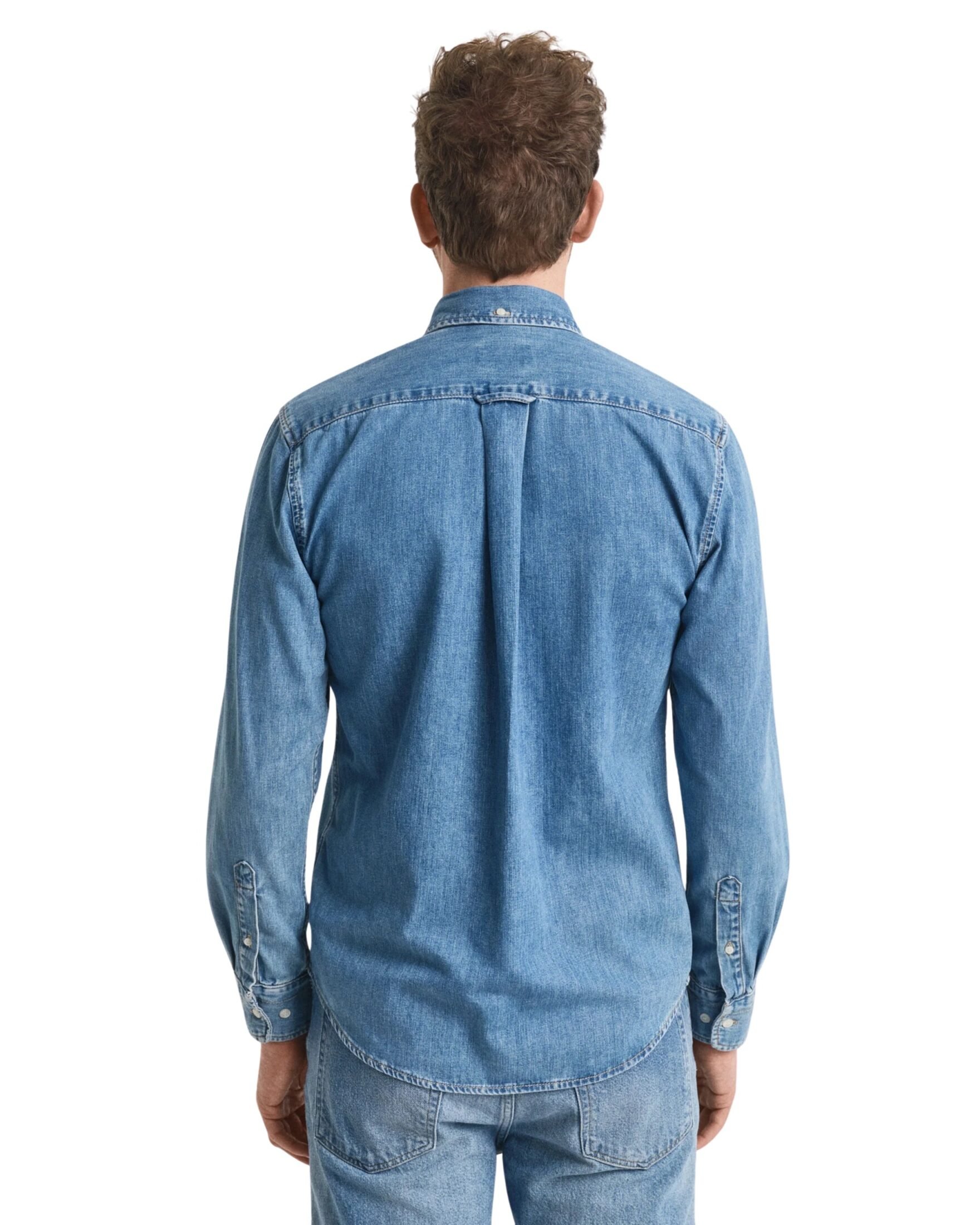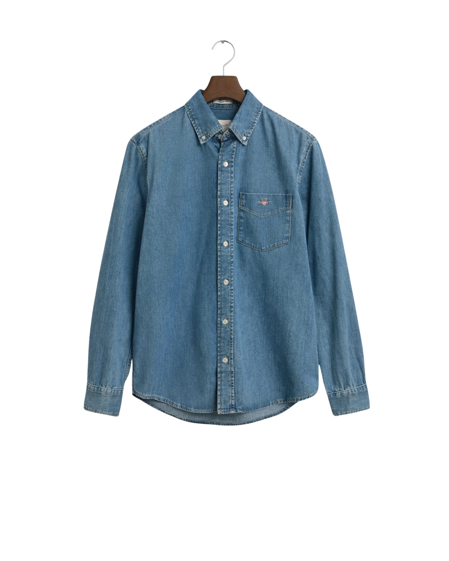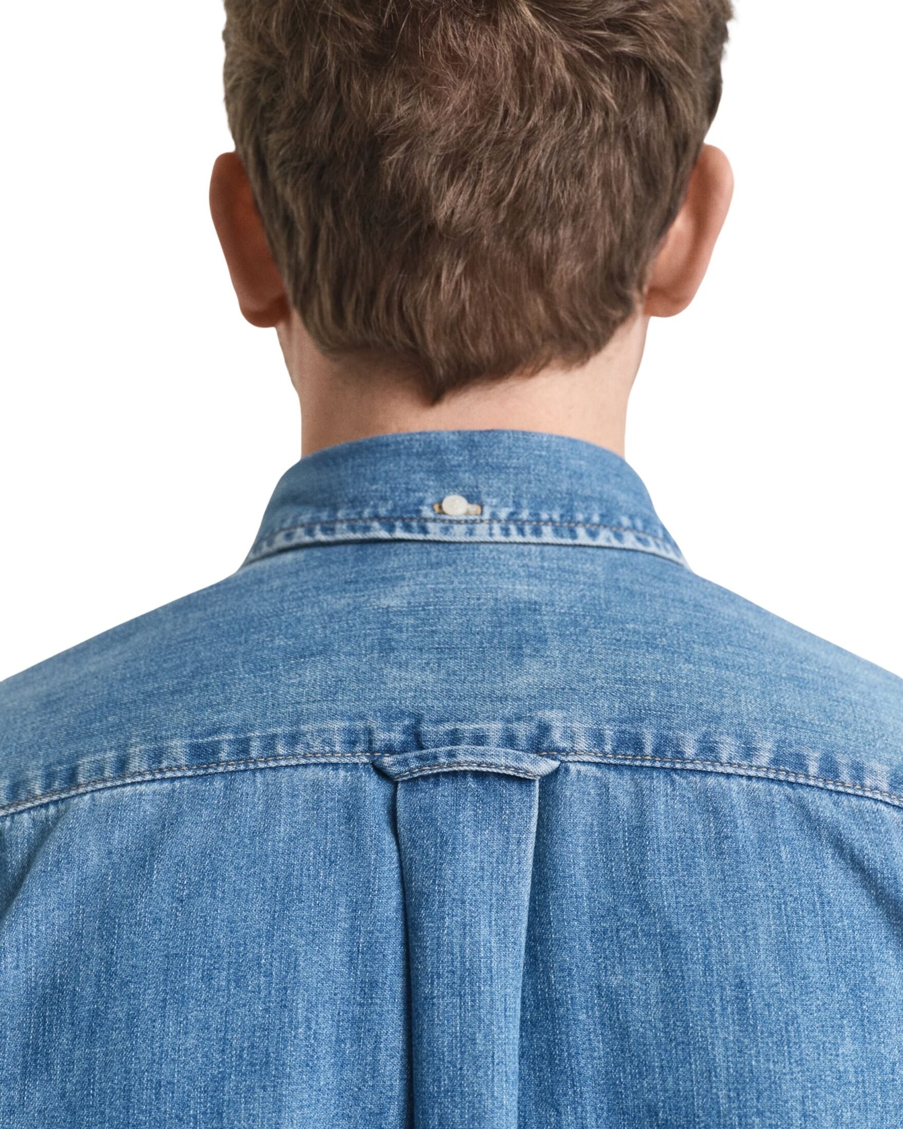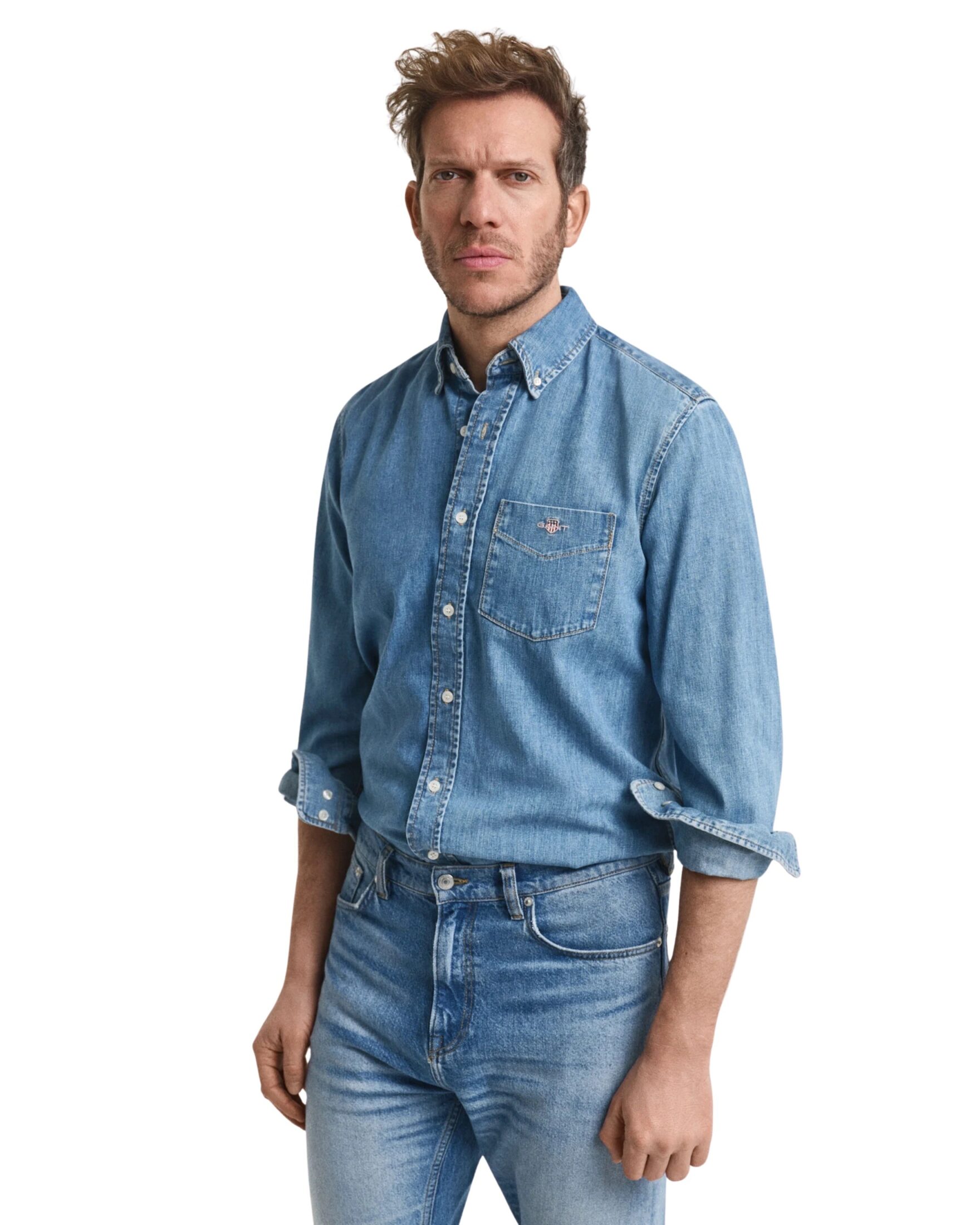 Denimskjorte til herre fra Gant. Laget av en lett bomullskvalitet i en vasket effekt for et autentisk utseende. Designet med klassisk button down-krage, justerbare mansjetter og en buet fald. Utsmykket med en GANT-skjoldlogo brodert på brystlommen og en boksfold med deres signaturhempe bak.