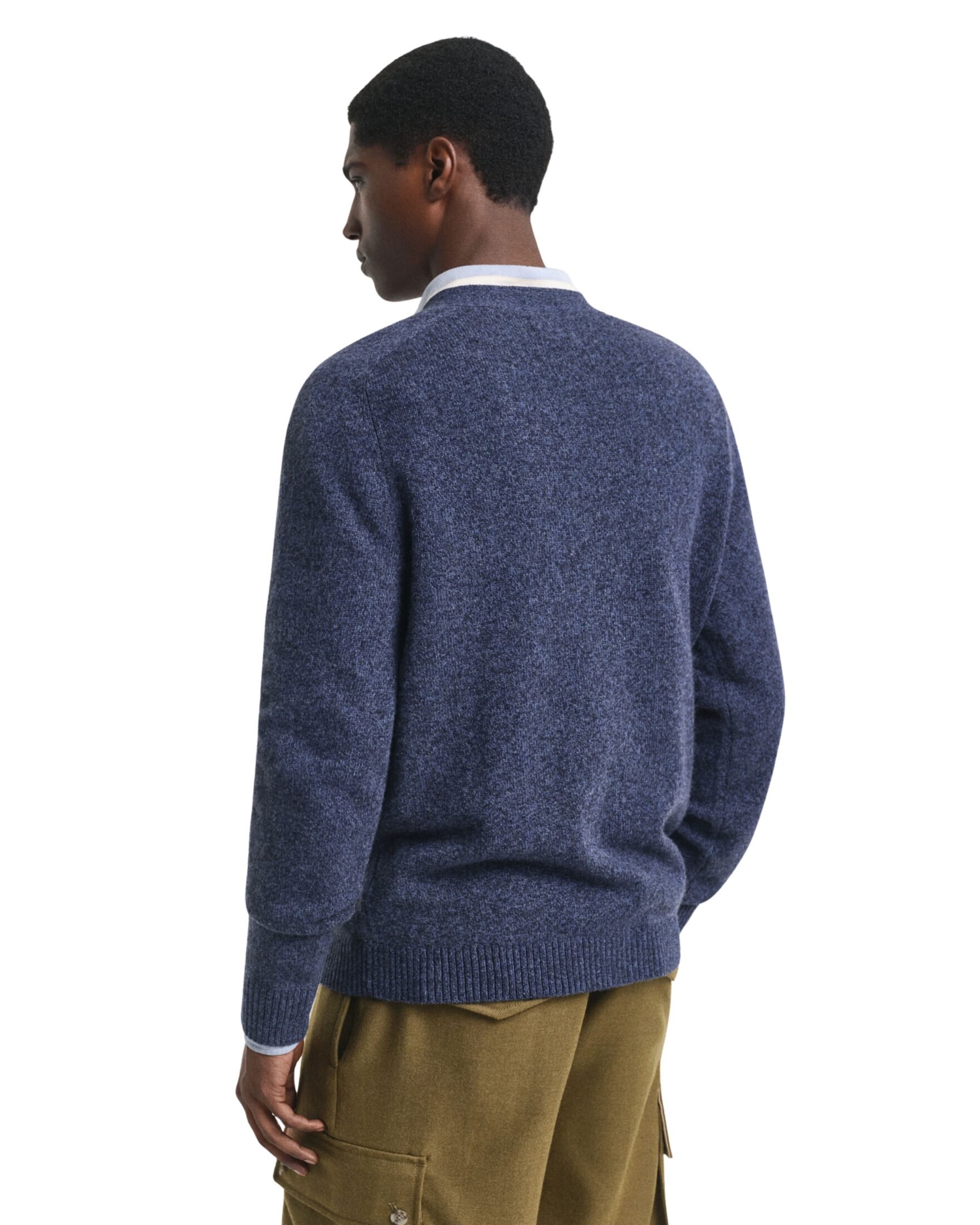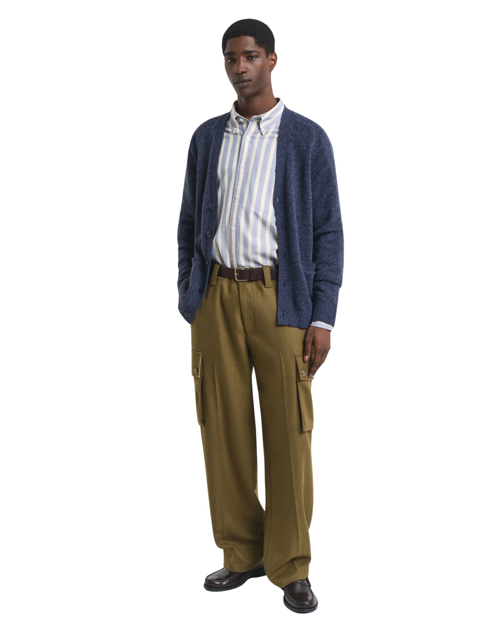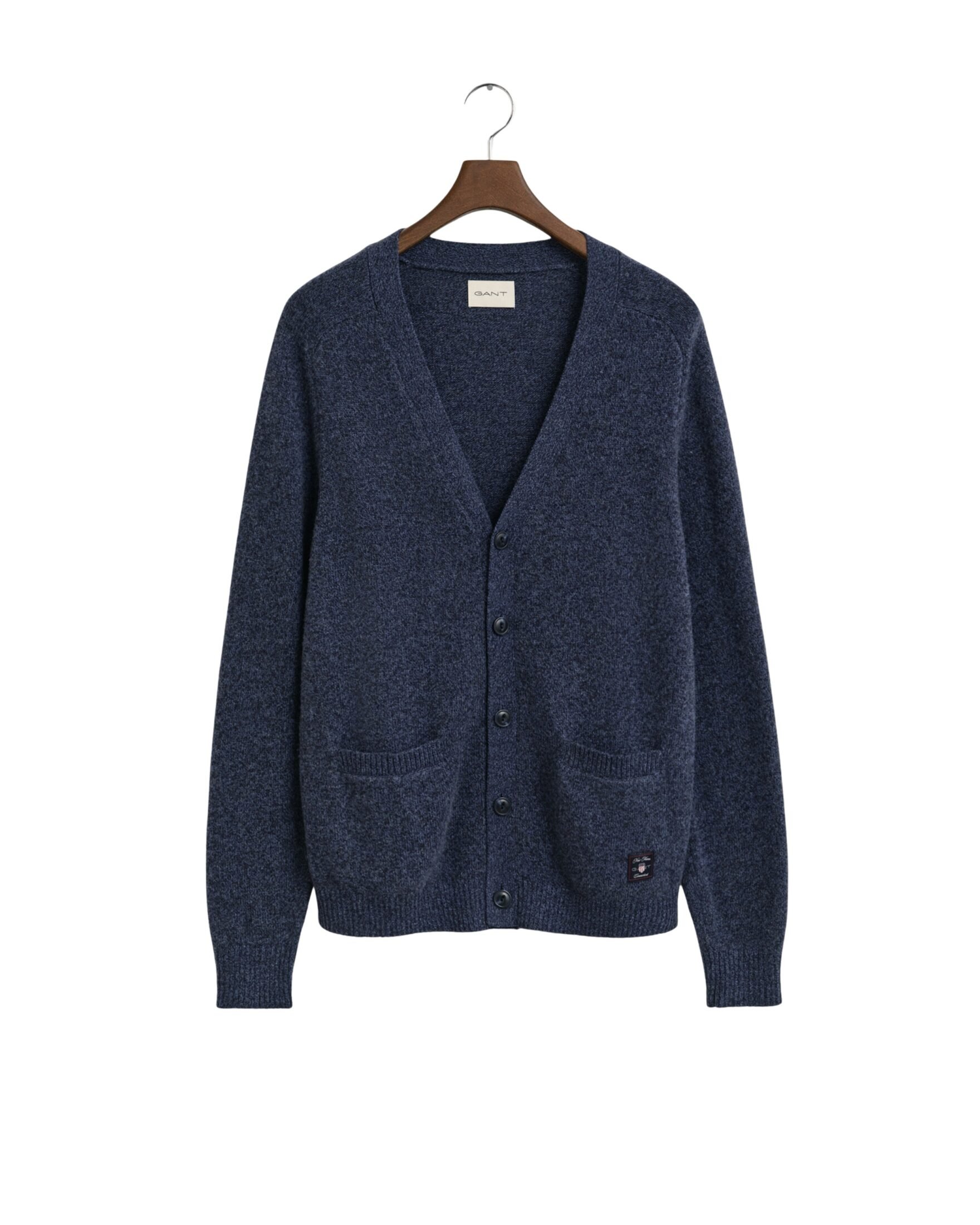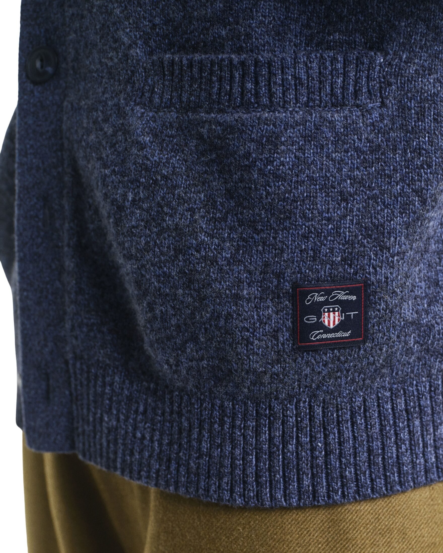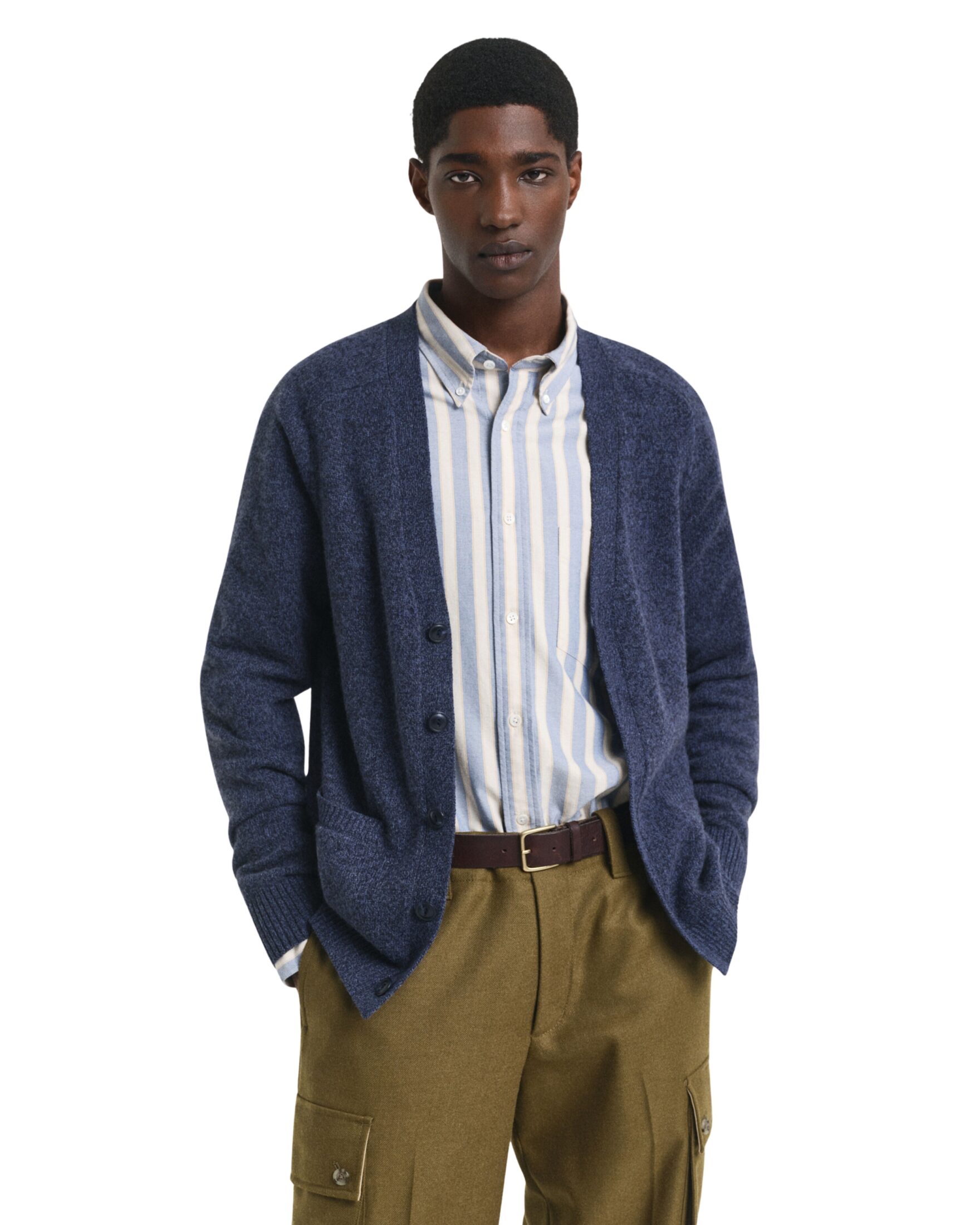 Cardigan til herre fra Gant. Laget av en myk blanding av bomull og ull. Strikket i tofarget moulinégarn, noe som resulterer i en diskré vridd overflate. Den har en rett passform, V-hals, knappelukking foran, passepoilerte lommer, droppede skuldre og ribbekanter i falden og mansjettene. Prydet med GANT-merkelapp nederst.