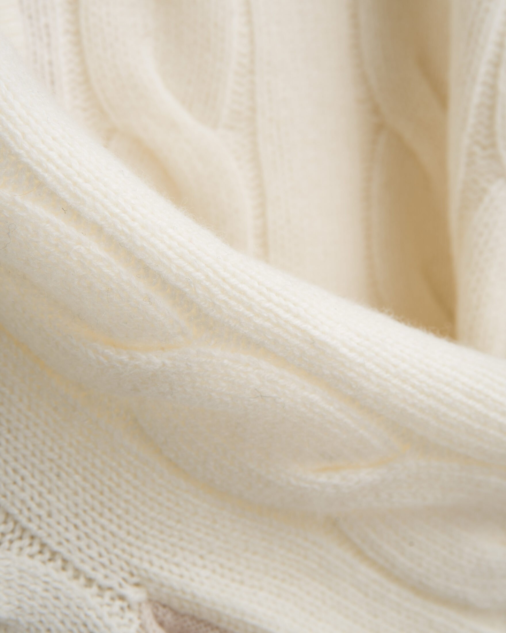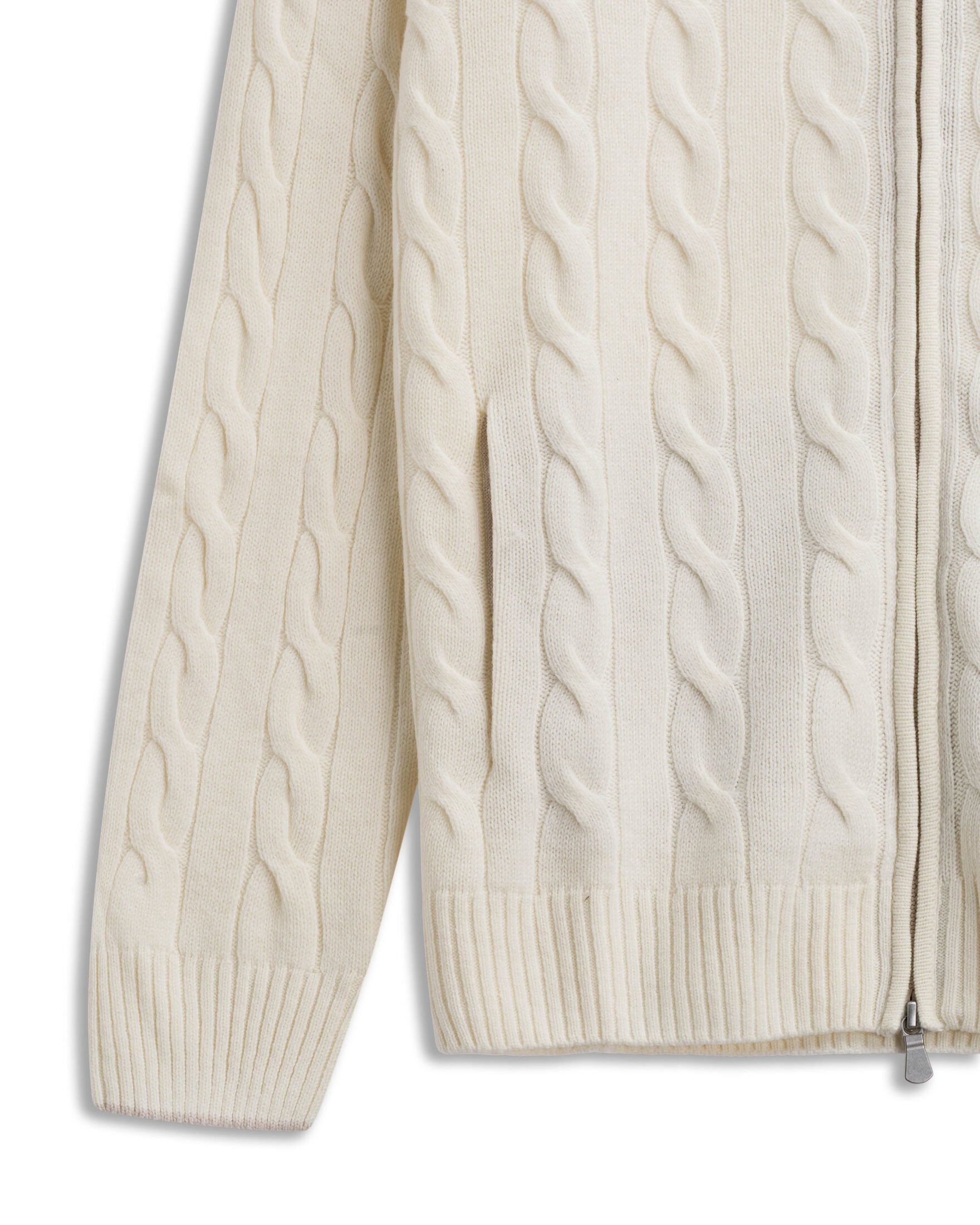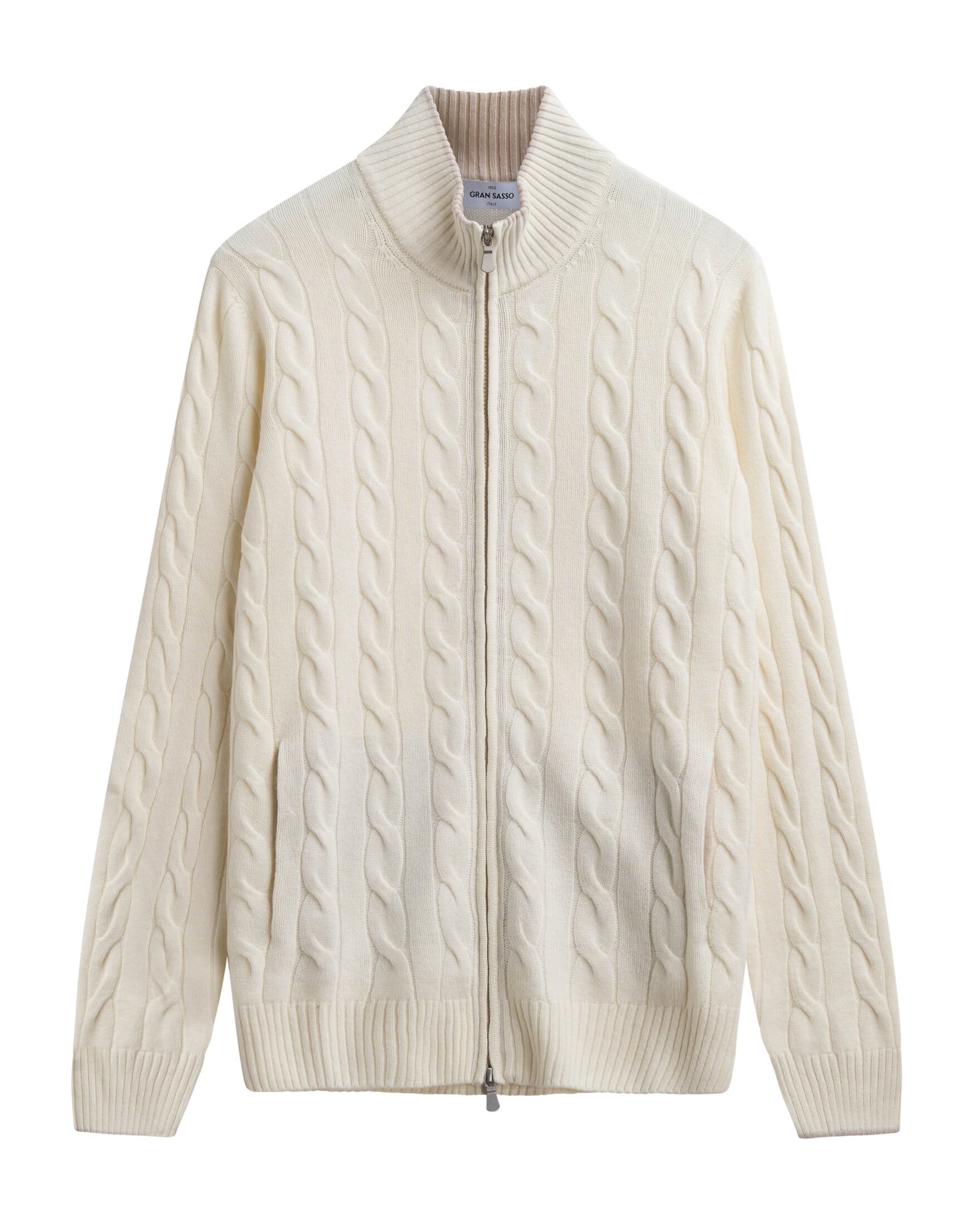 En klassisk cardigan til herre fra Gran Sasso, laget i en luksuriøs blanding av ull, kasjmir og viskose. Den har et tidløst kabelstrikket mønster, høy ribbestrikket krage og glidelåslukning med toveis glidelås for økt komfort og funksjonalitet. Den myke kvaliteten gir en behagelig følelse mot huden, samtidig som plagget gir et raffinert og avslappet uttrykk. Perfekt både til hverdags og til mer formelle anledninger.