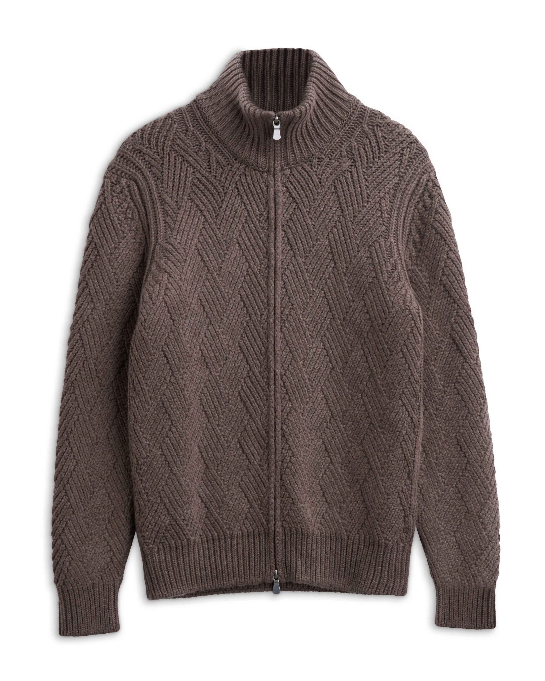 En luksuriøs jakke fra Gran Sasso, strikket i 100% kasjmir. Det karakteristiske mønsteret gir en elegant og sofistikert struktur. Jakken har høy krage og glidelåslukking som gjør plagget både praktisk og stilfullt. Et eksklusivt plagg som hever enhver garderobe.