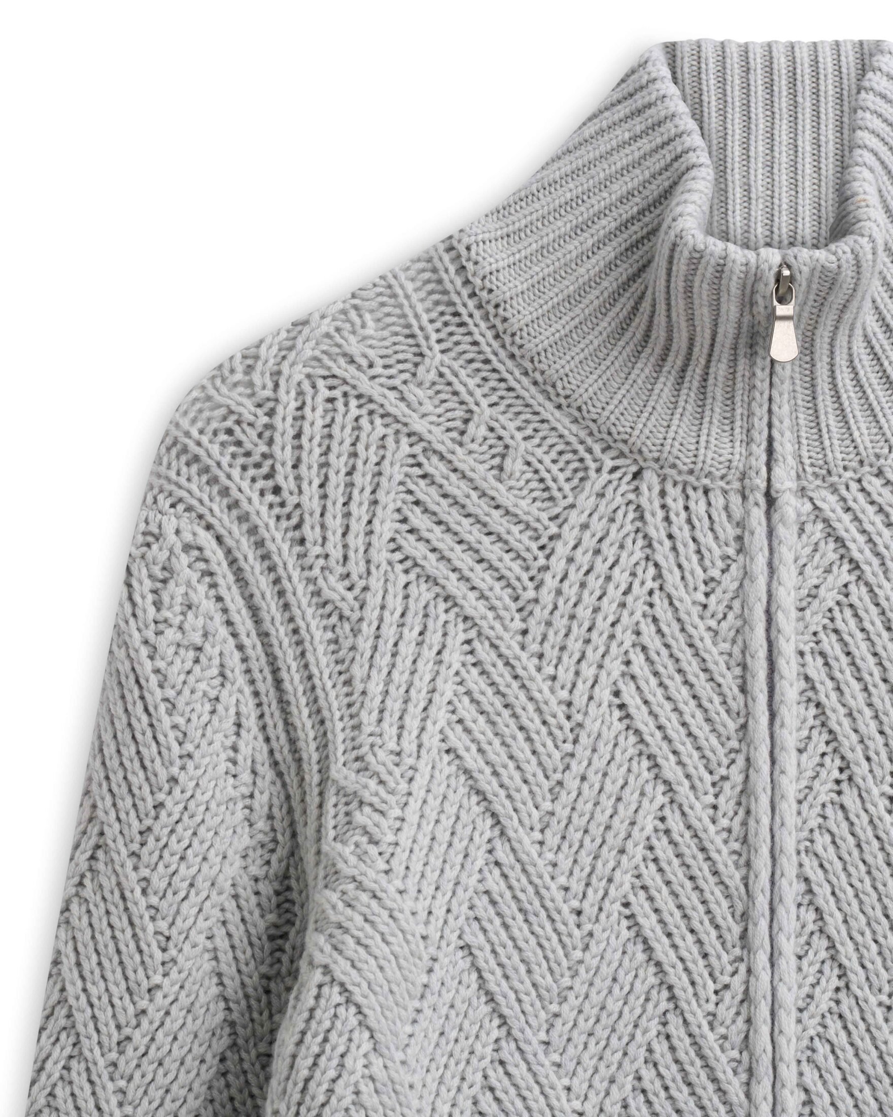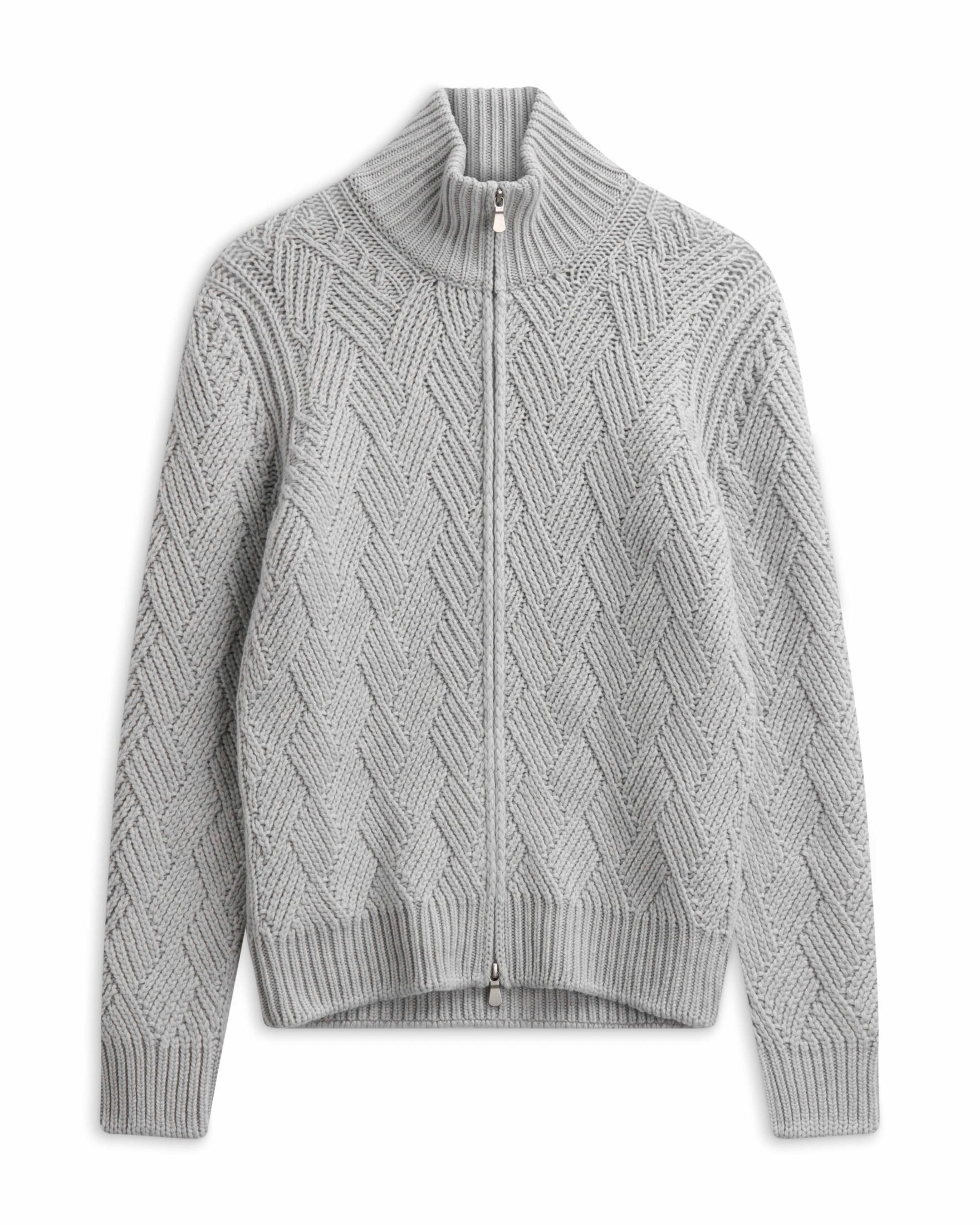 En luksuriøs jakke fra Gran Sasso, strikket i 100% kasjmir. Det karakteristiske mønsteret gir en elegant og sofistikert struktur. Jakken har høy krage og glidelåslukking som gjør plagget både praktisk og stilfullt. Et eksklusivt plagg som hever enhver garderobe.