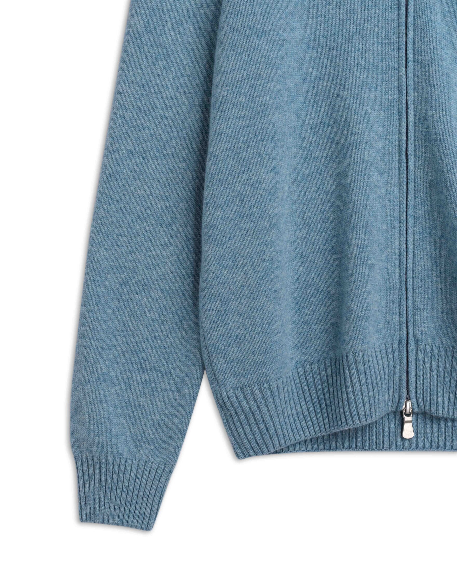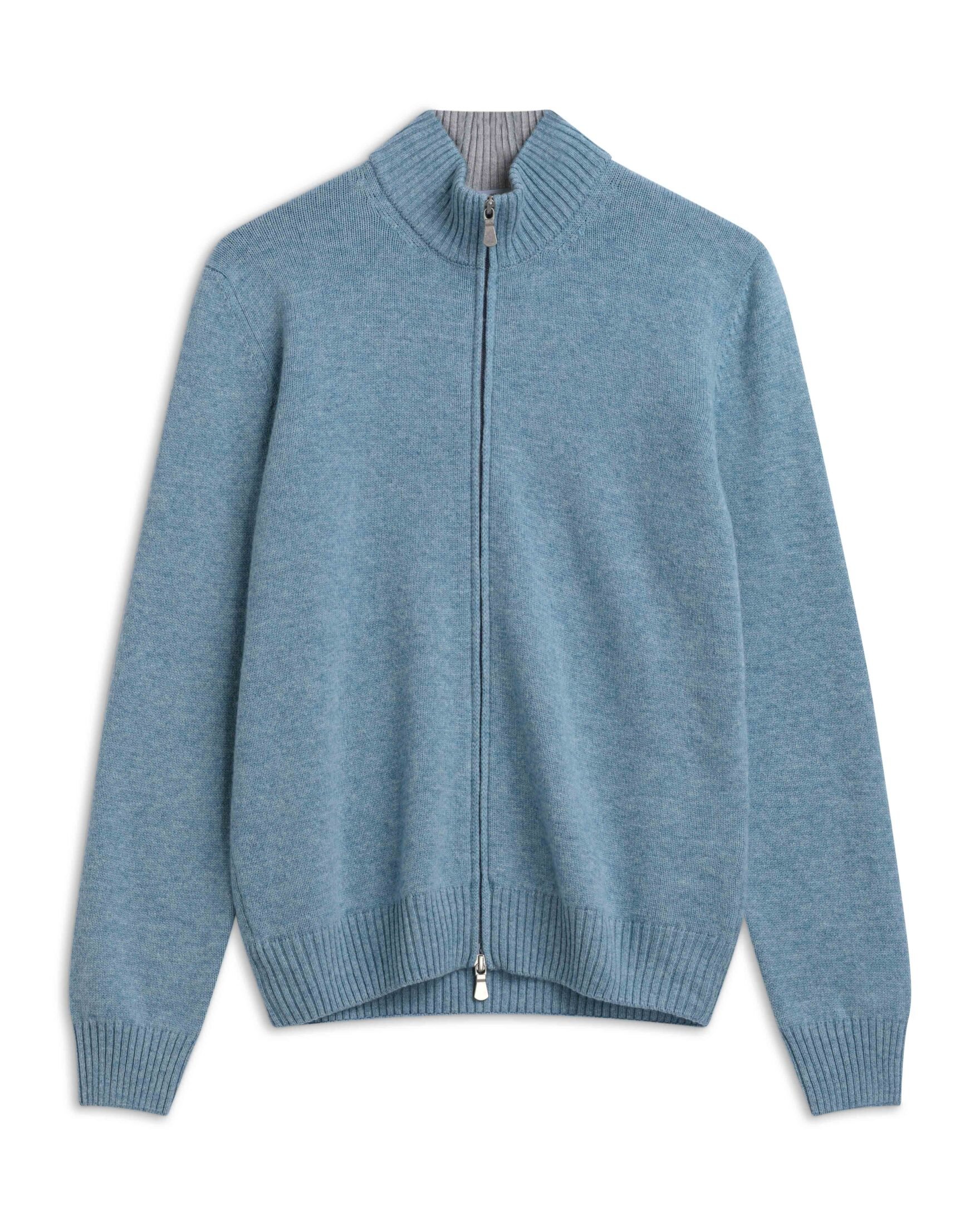 En elegant og allsidig cardigan til herre fra Gran Sasso, laget i en eksklusiv blanding av ull, viskose og kasjmir. Den har høy ribbestrikket hals, toveis glidelås og ribb nederst og på ermene for en komfortabel og tidløs passform. Den myke kvaliteten og rene designet gjør plagget perfekt til både hverdagsbruk og mer formelle anledninger.