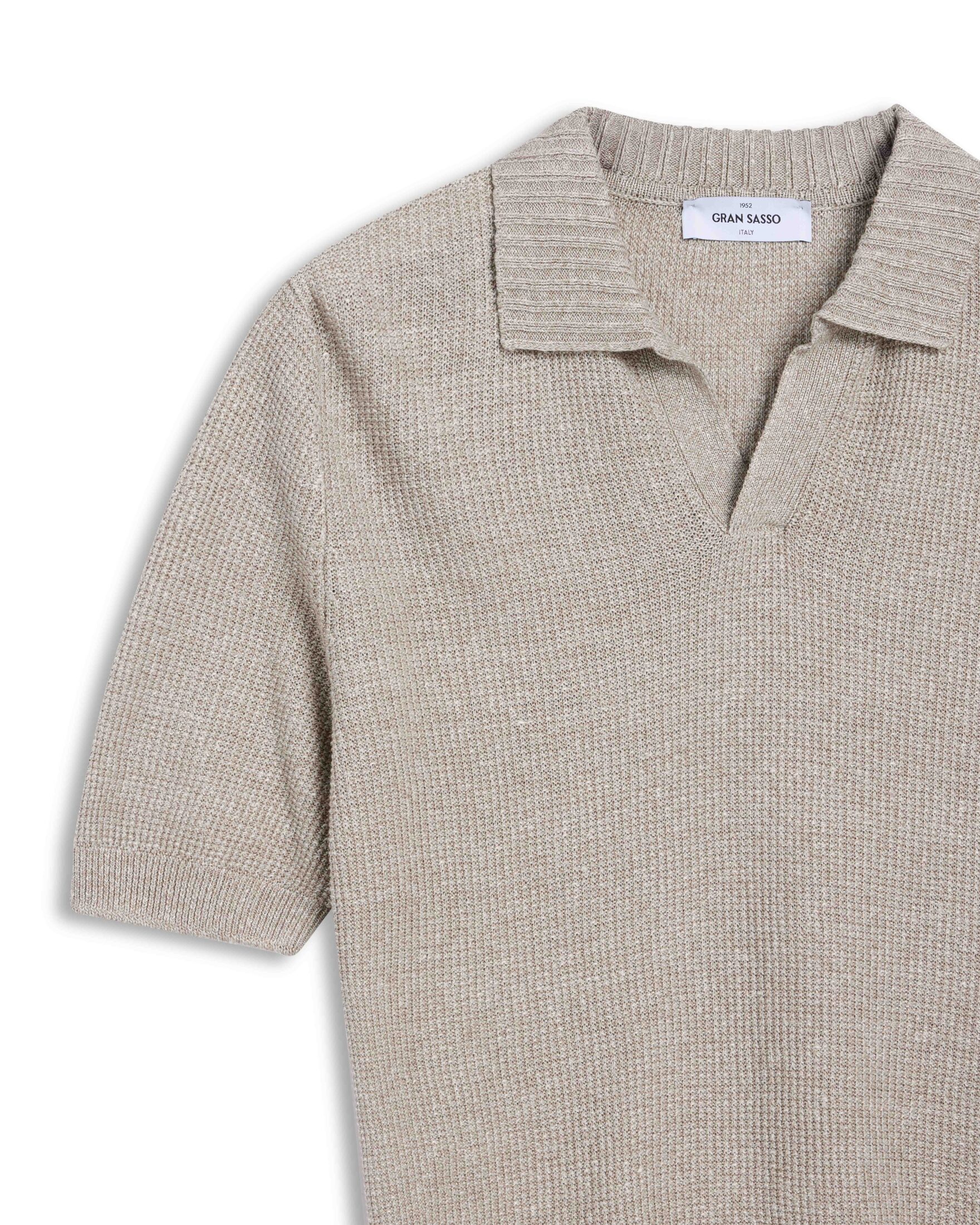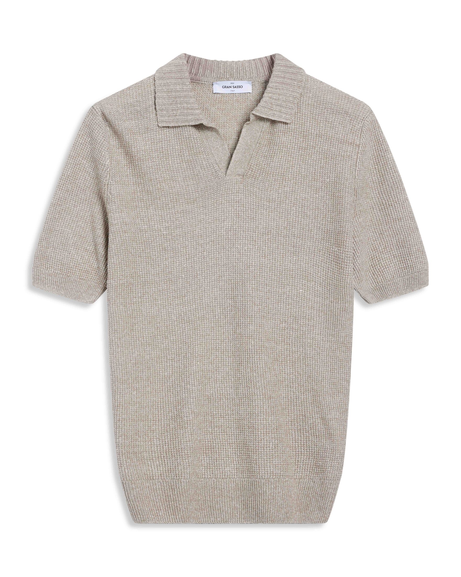 Strikket polo fra Gran Sasso i lin- og bomullsblanding. Modellen har åpen krage og ribbestrikkede kanter. En sval og stilren polo som passer perfekt til både chinos og shorts.