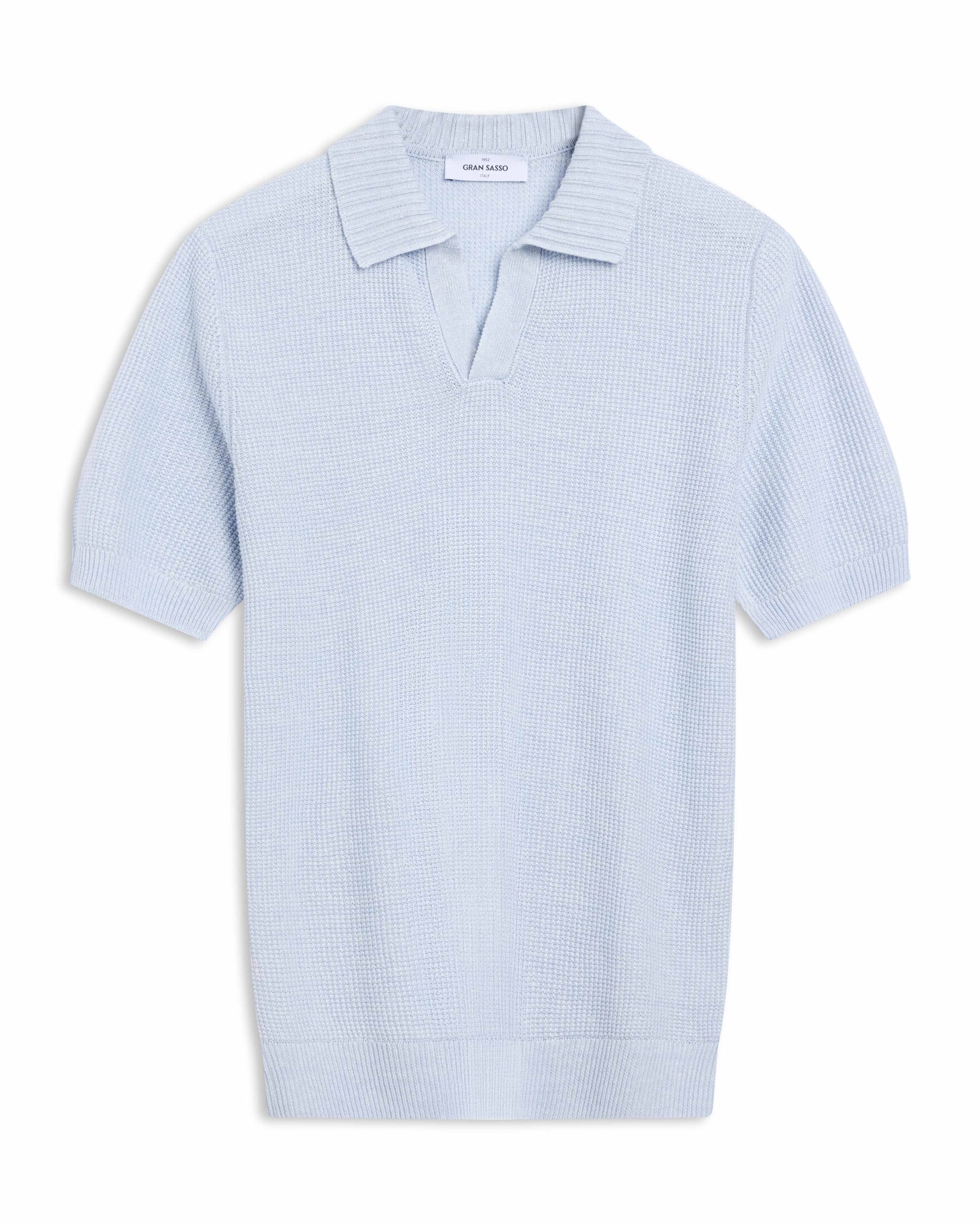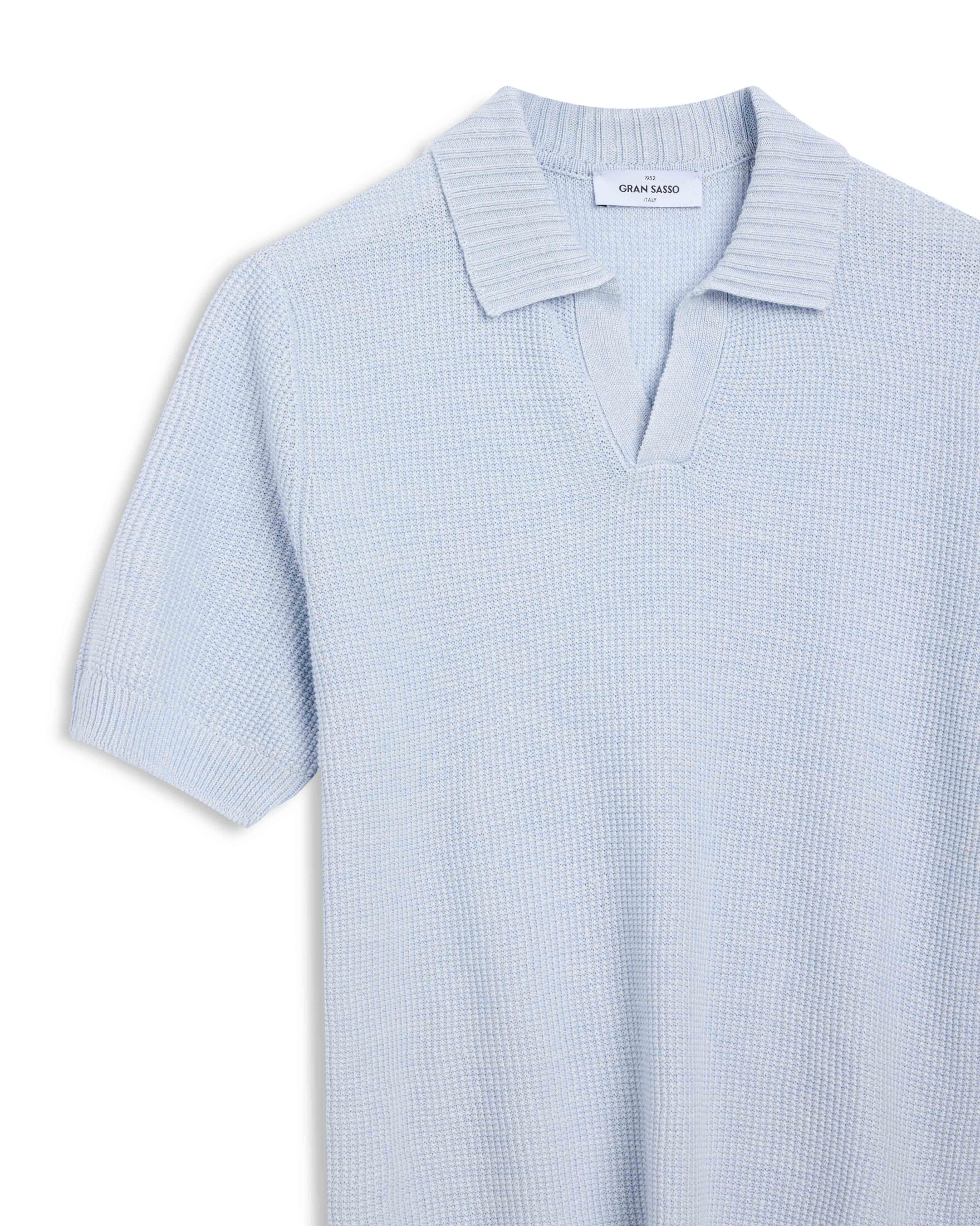 Strikket polo fra Gran Sasso i lin- og bomullsblanding. Modellen har åpen krage og ribbestrikkede kanter. En sval og stilren polo som passer perfekt til både chinos og shorts.