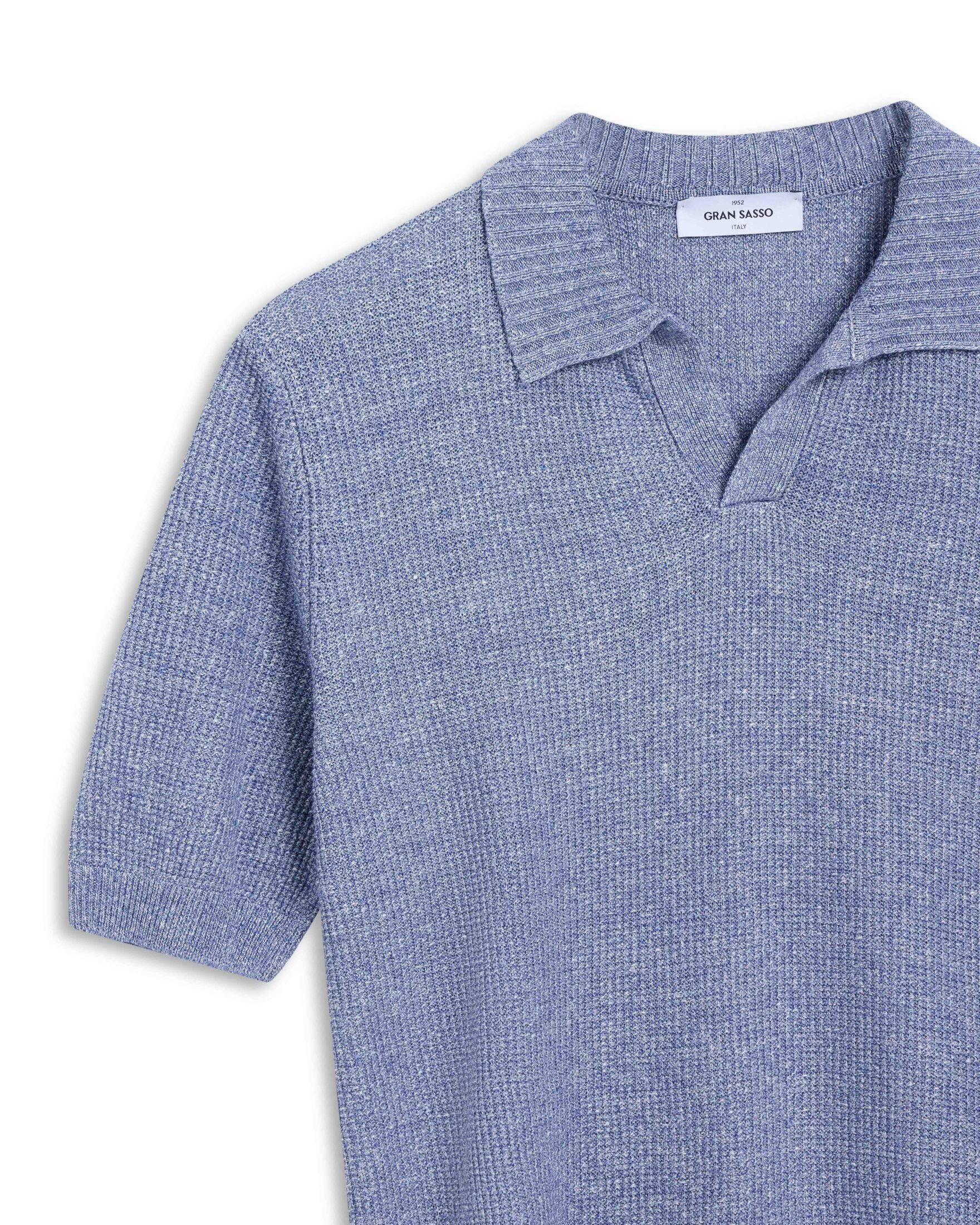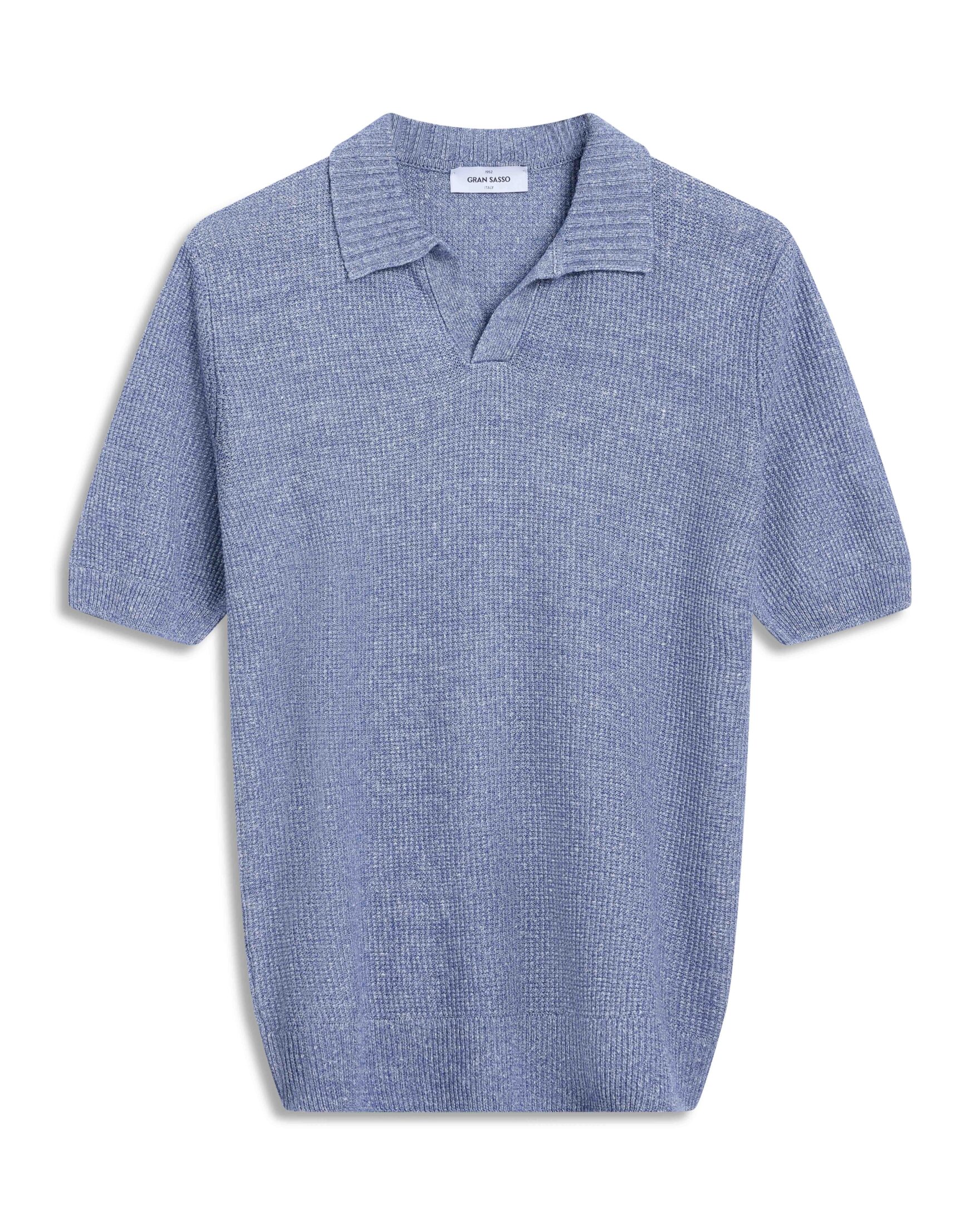 Strikket polo fra Gran Sasso i lin- og bomullsblanding. Modellen har åpen krage og ribbestrikkede kanter. En sval og stilren polo som passer perfekt til både chinos og shorts.