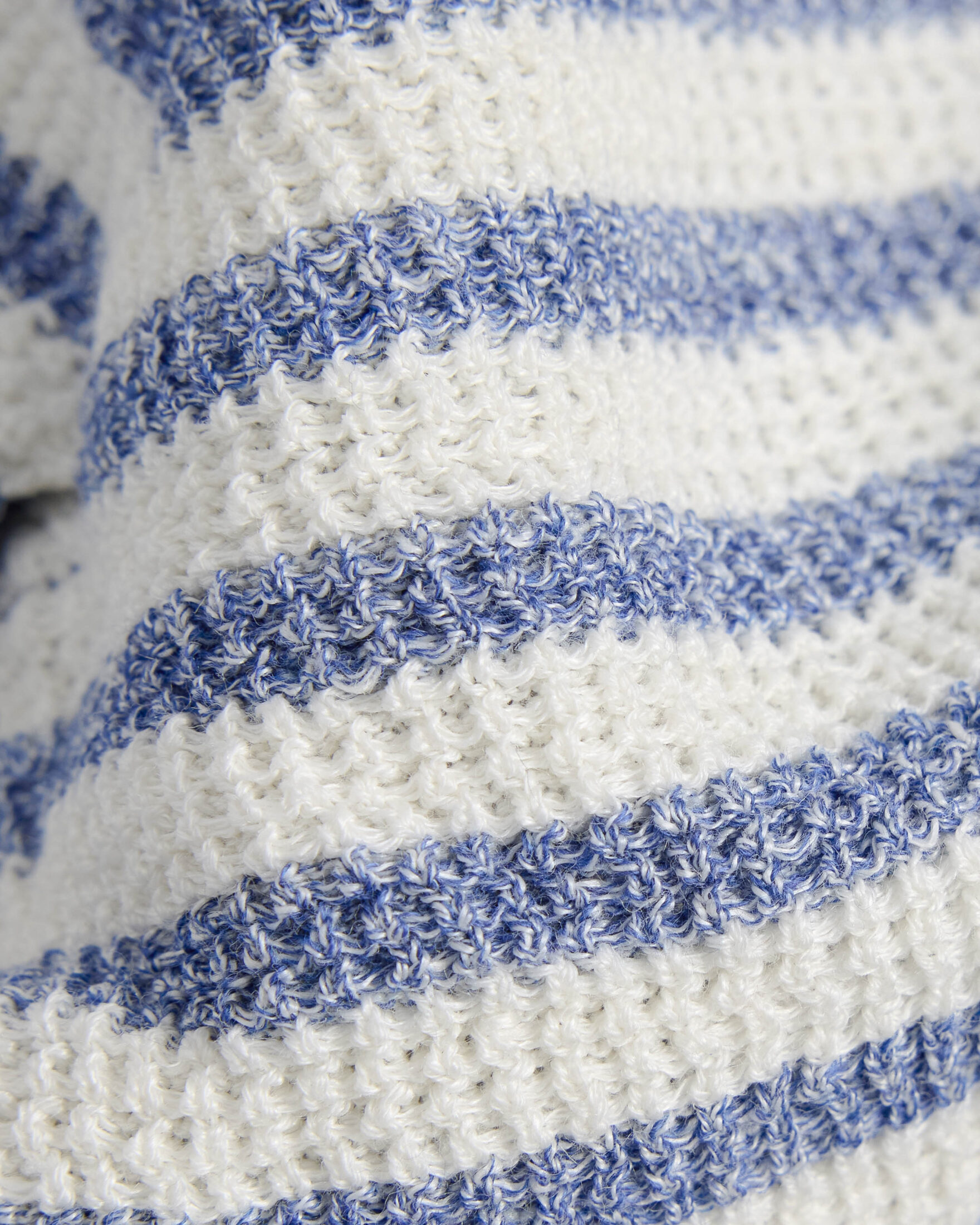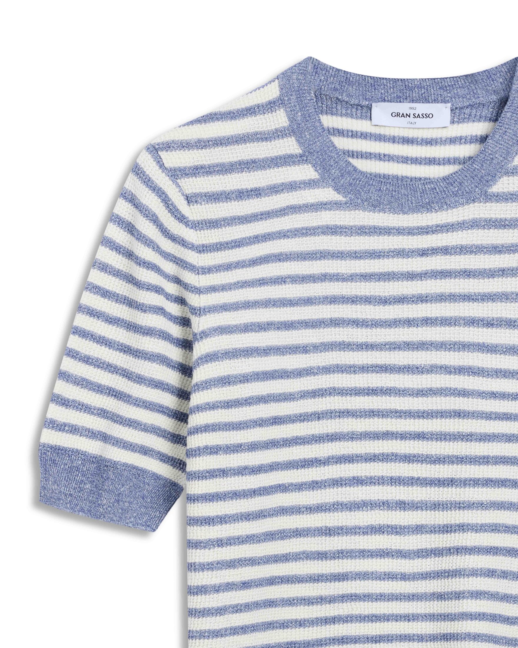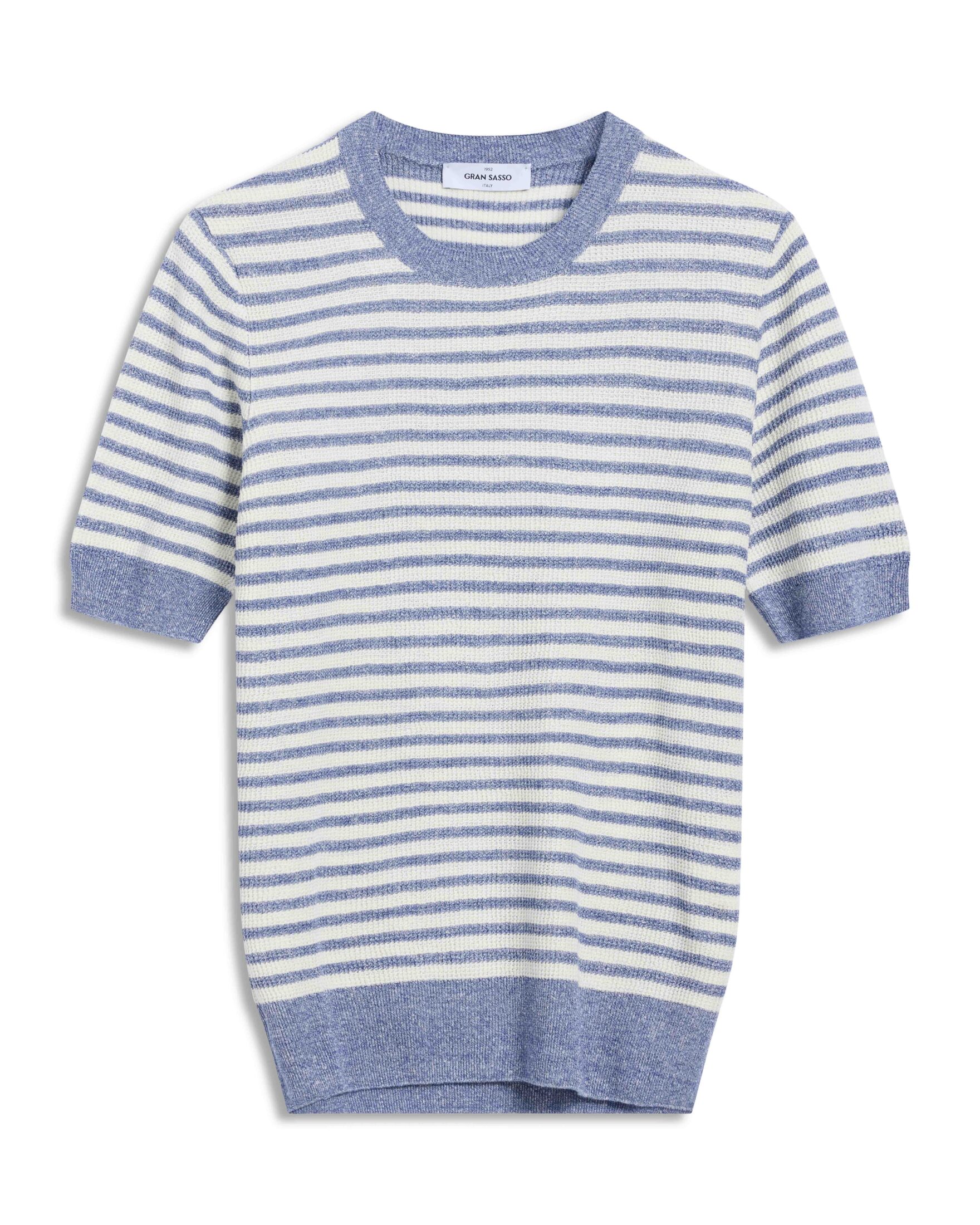 Strikket t-skjorte fra Gran Sasso i en lett og pustende blanding av lin og bomull. Modellen har rund hals, korte ermer og ribbestrikkede kontrastkanter, kombinert med smale horisontale striper i klassisk breton-inspirert stil. En raffinert og komfortabel sommerstrikk som gir antrekket et avslappet, men gjennomført uttrykk.